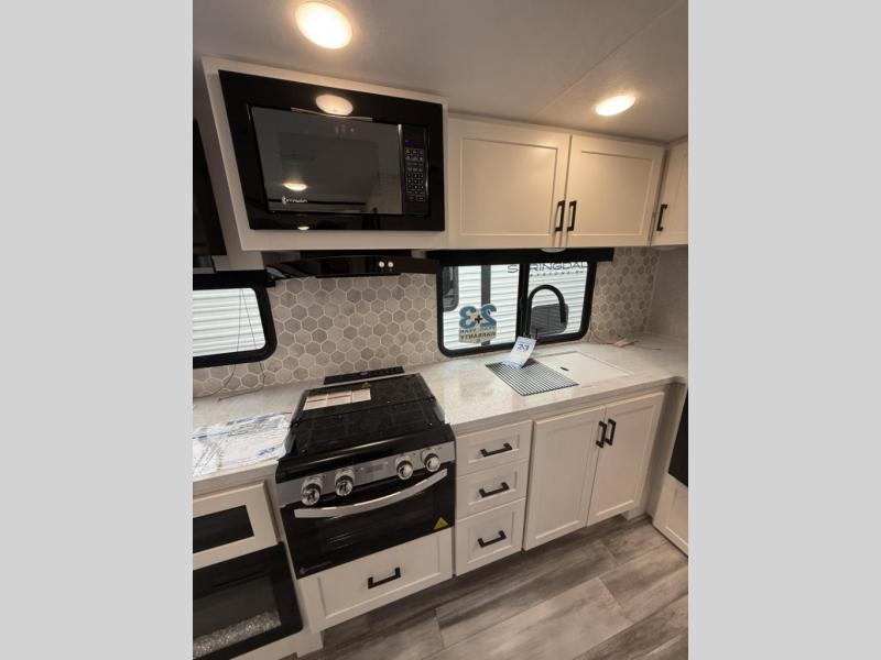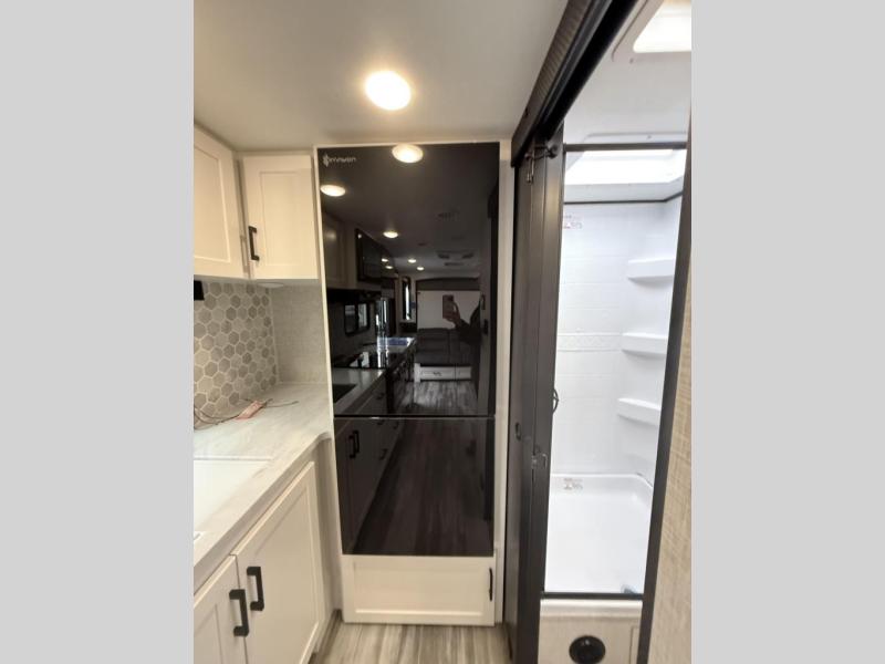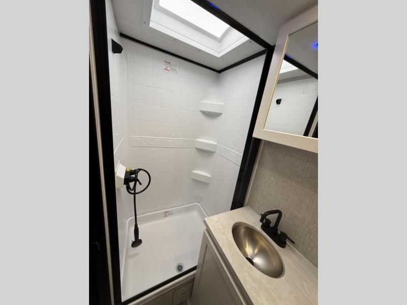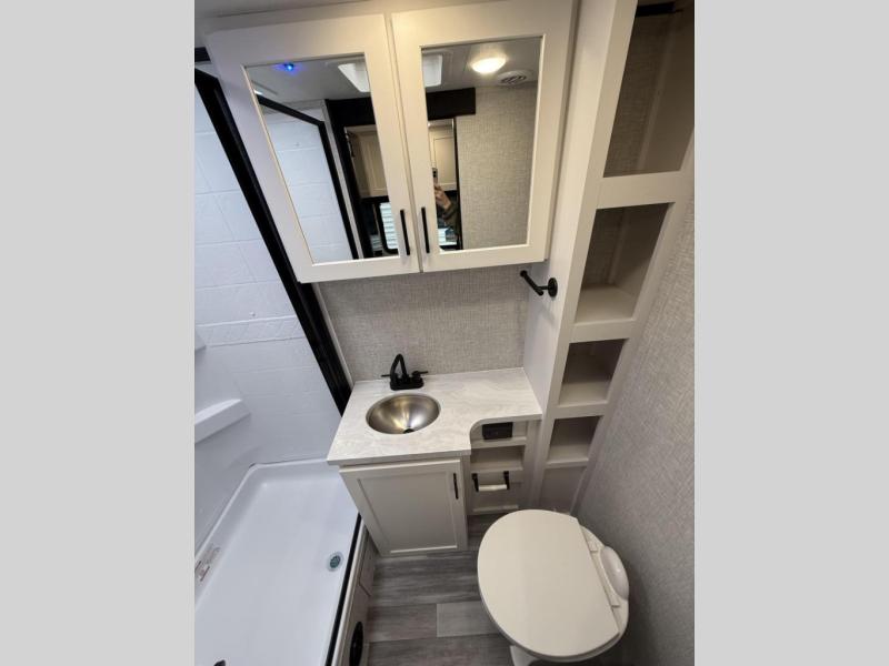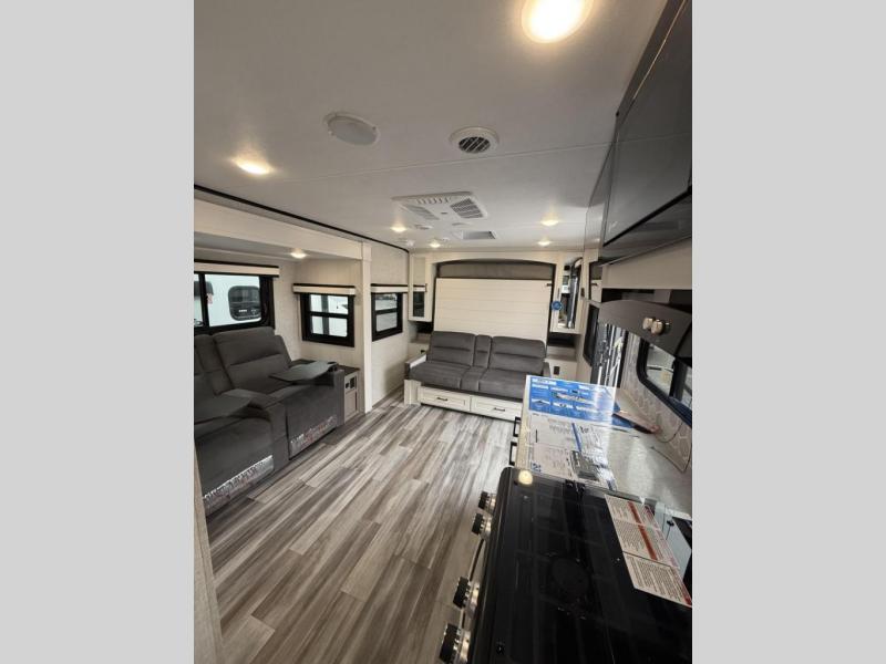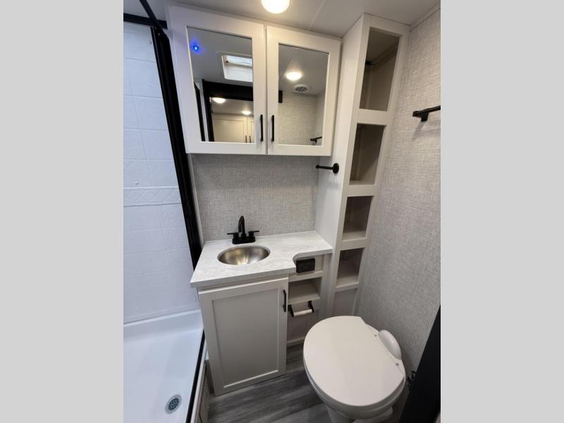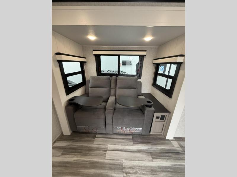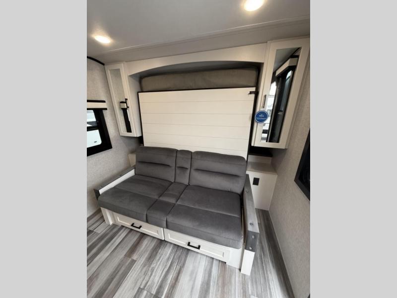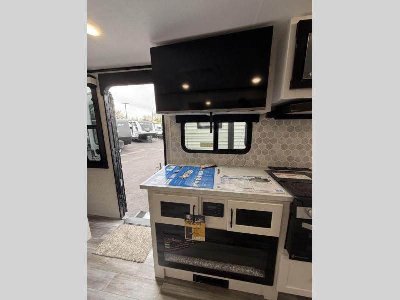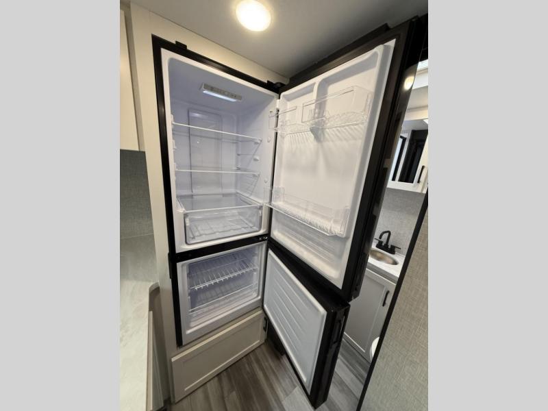 The amenities for 2025 don’t stop there! In the kitchen area, you'll find seamless countertops throughout, a stainless-steel sink with a high-rise faucet and pull-out sprayer. You'll also be blown away by the all-new InVision Suite appliance package with an 11 cubic foot 12V fridge, standard in all Jay Feather models. This fridge has a shiny, black glass front with a two-door fridge over the freezer. Store more on the go with oversized cabinet doors and drawers. The cabinet doors are attached with hidden hinges to give each Jay Feather that sought-after residential look and feel.