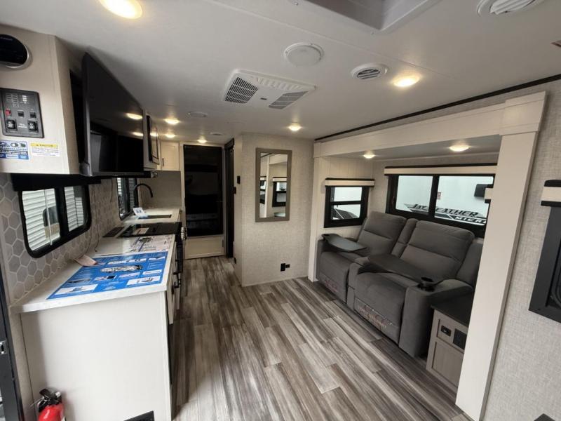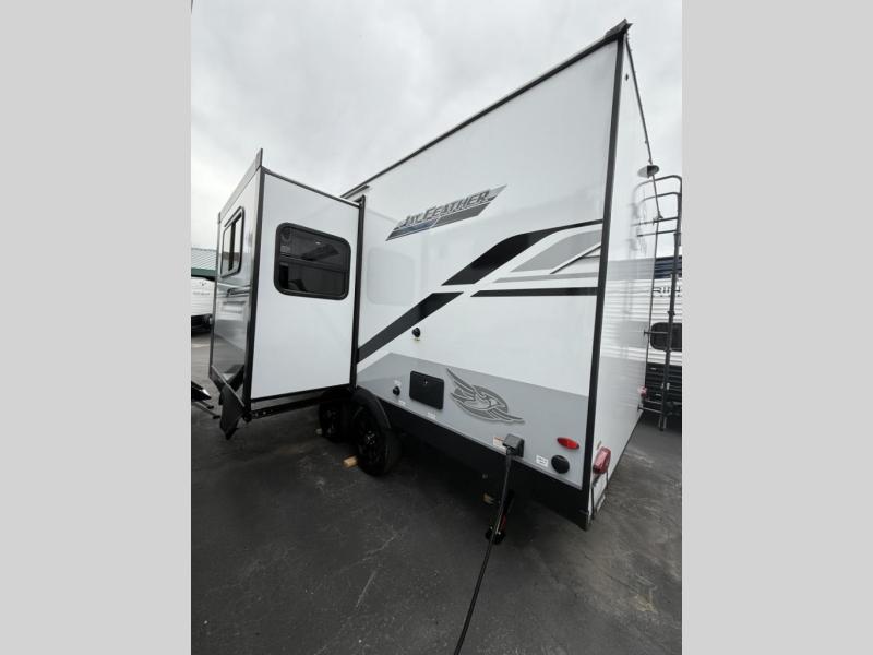 From the light interior decor, to the many standard amenities, this lightweight travel trailer is fully-equipped for all of your adventures, while offering the comforts of home. Relax, unwind and float through the day in the ever-accommodating 2025 Jay Feather Travel Trailer