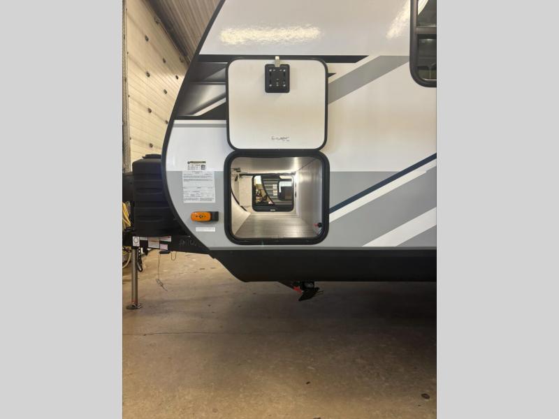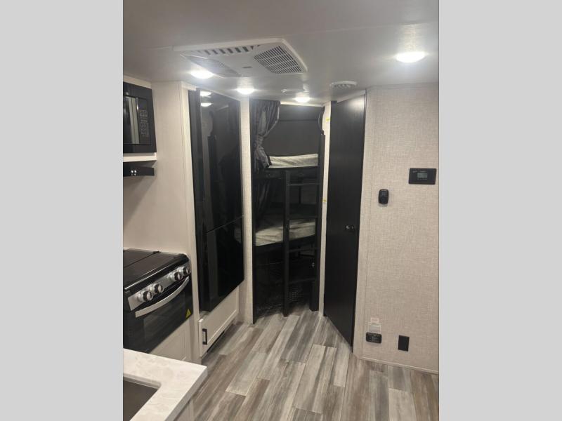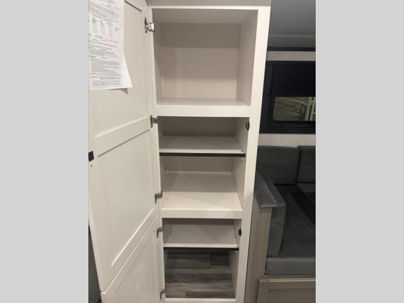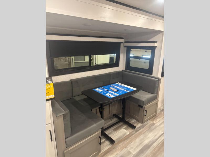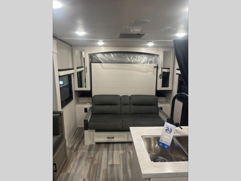 You'll be surprised how easy it will be to camp in this travel trailer for seven! The double-size bunks include flip-up storage and an exterior cargo door so you can easily pack in gear, plus there is front exterior storage as well. A Murphy bed up front means you can enjoy comfortable sleeping space at night, and cozy seating space during the day on the jack knife sofa. You'll also find a U-shaped dinette slide where you can dine together, and the pantry within the slide can hold snacks for everyone! This model includes an L-shaped kitchen counter, a microwave oven and three burner range to cook meals, plus an 11 cu. ft. 12V refrigerator for perishables! You may just find yourselves outdoor most of the time since there is a 19' power awning with LED lights and an outside kitchen!