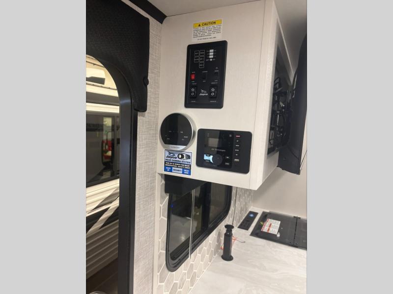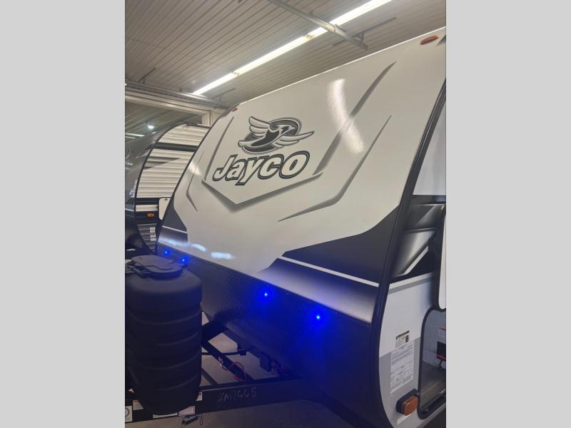 With any Jay Feather travel trailer by Jayco, you will enjoy lightweight towing, convenient exterior amenities, and at-home comforts inside! The Overlander 1 Solar Package included within the Jay Sport Package comes with a 200W solar panel and a 30-amp digital controller so you can enjoy some off-grid camping. There is also a modern graphics package with a dual-colored sidewall, LCI Solid Step fold-down aluminum tread steps on the main entry door, and Climate Shield 0 -100° F tested weather insulation package that will allow you to camp in all sorts of climates. The Customer Value Package will make time outdoors easier than ever with a power tongue jack and a Rock Solid stabilizer system, plus American-made nitro-filled Goodyear tires with self-adjusting electric brakes. More exterior features include a Keyed-Alike locking system, marine grade exterior speakers, a Magnum Truss roof system, and the list goes on! And we haven't even touched on the interior comforts, like the residential style seamless countertops and vinyl flooring throughout, decorative backsplash, handcrafted hardwood door/drawer fronts, and multiple USB charging ports to keep you going!