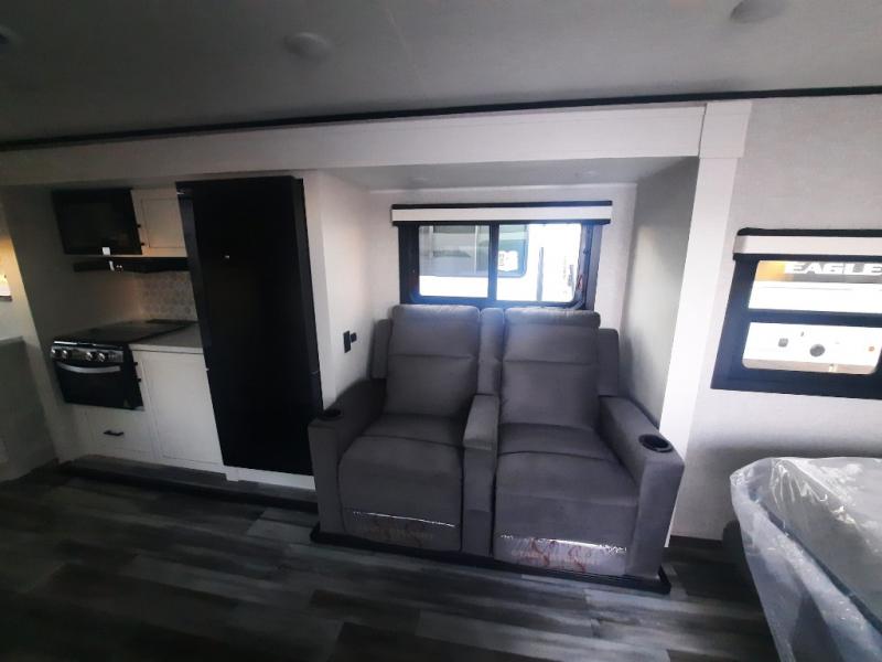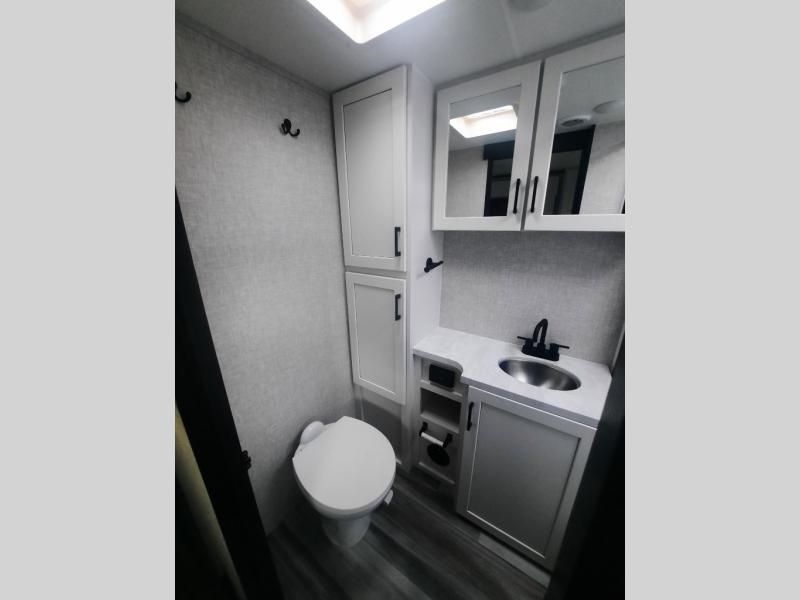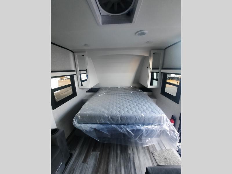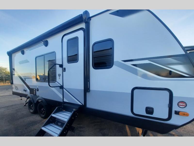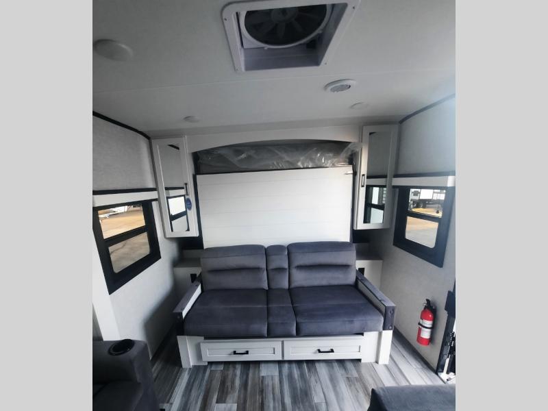 If you wish to escape the hustle and bustle of everyday life then you need this travel trailer! It features a front 60" x 75" Murphy bed with wardrobes on either side for bedtime and a jackknife sofa during the day. You can play games at the booth dinette after enjoying a delicious meal prepared with the three burner cooktop or relax at the theater seating with table trays and enjoy the LED TV. The rear corner bathroom has a shower with a skylight for you to get cleaned up in, as well as a linen closet to store your towels. There is exterior storage space to keep your outdoor gear, a 15' power awning to protect you from the elements.