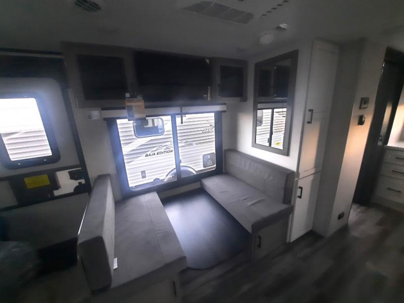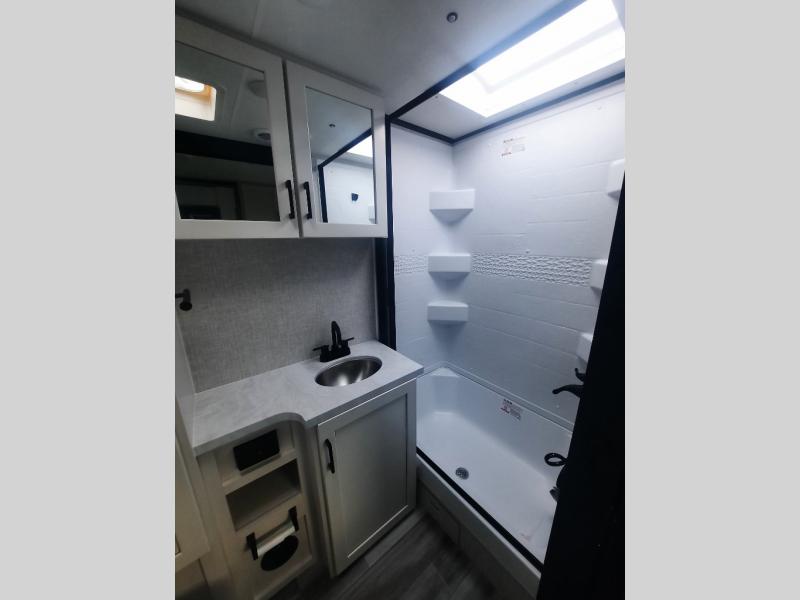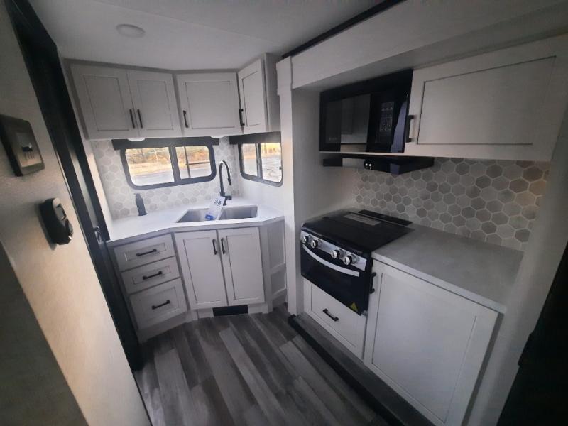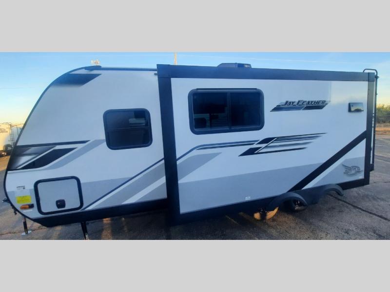 With any Jay Feather travel trailer by Jayco, you will enjoy lightweight towing, convenient exterior amenities, and at-home comforts inside! The Overlander 1 Solar Package included within the Jay Sport Package comes with a 200W solar panel and a 30-amp digital controller so you can enjoy some off-grid camping. There is also a modern graphics package with a dual-colored sidewall, LCI Solid Step fold-down aluminum tread steps on the main entry door, and Climate Shield 0 -100° F tested weather insulation package that will allow you to camp in all sorts of climates. The Customer Value Package will make time outdoors easier than ever with a power tongue jack and a Rock Solid stabilizer system, plus American-made nitro-filled Goodyear tires with self-adjusting electric brakes. More exterior features include a Keyed-Alike locking system, marine grade exterior speakers, a Magnum Truss roof system, and the list goes on! And we haven't even touched on the interior comforts, like the residential style seamless countertops and vinyl flooring throughout, decorative backsplash, handcrafted hardwood door/drawer fronts, and multiple USB charging ports to keep you going!