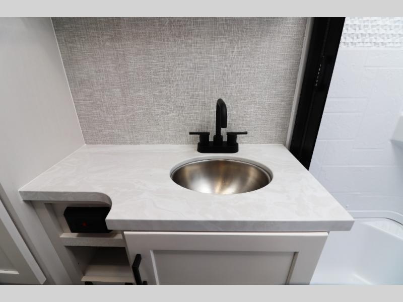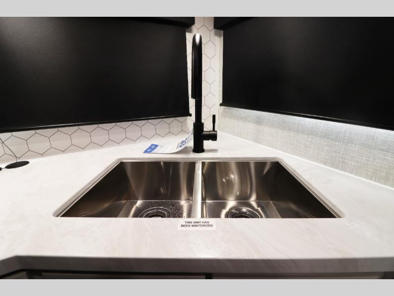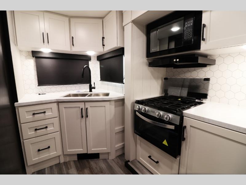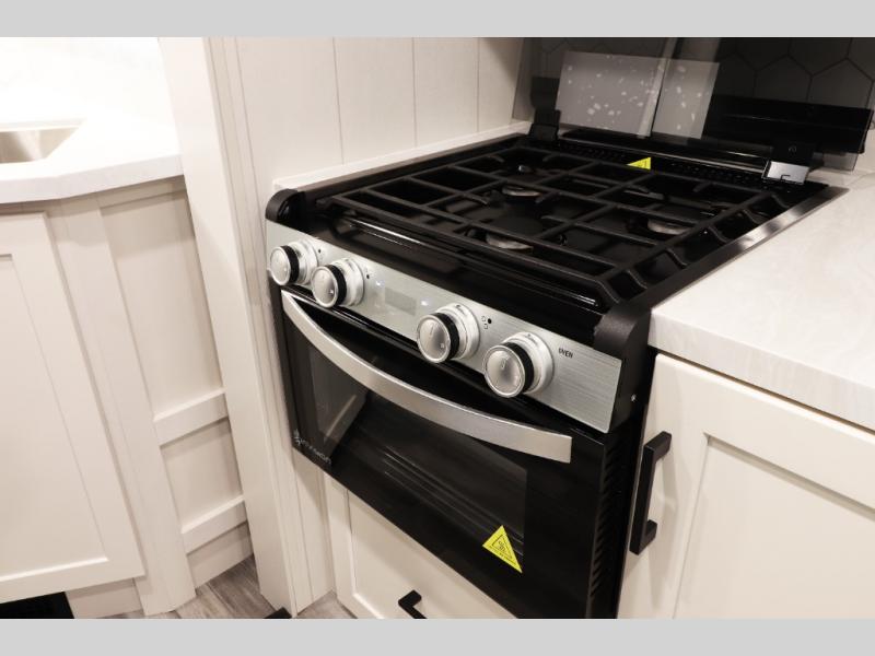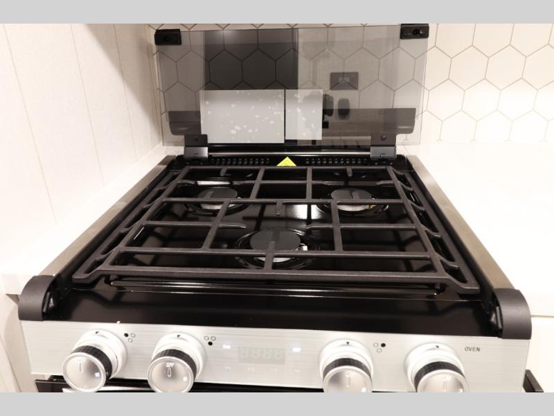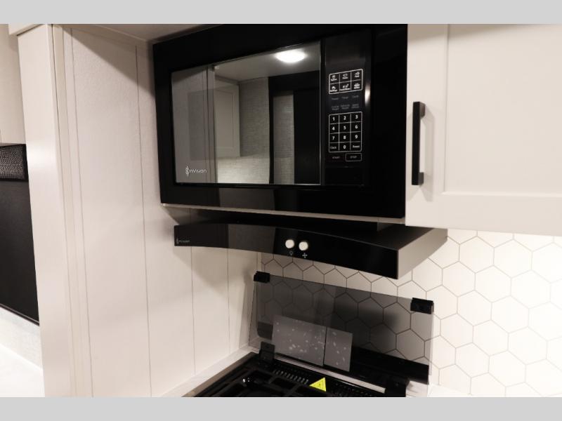 Stainless appliances – 3-burner cooktop, microwave, & 10 cu ft (or optional 11 cu ft) 12V In Vision fridge.