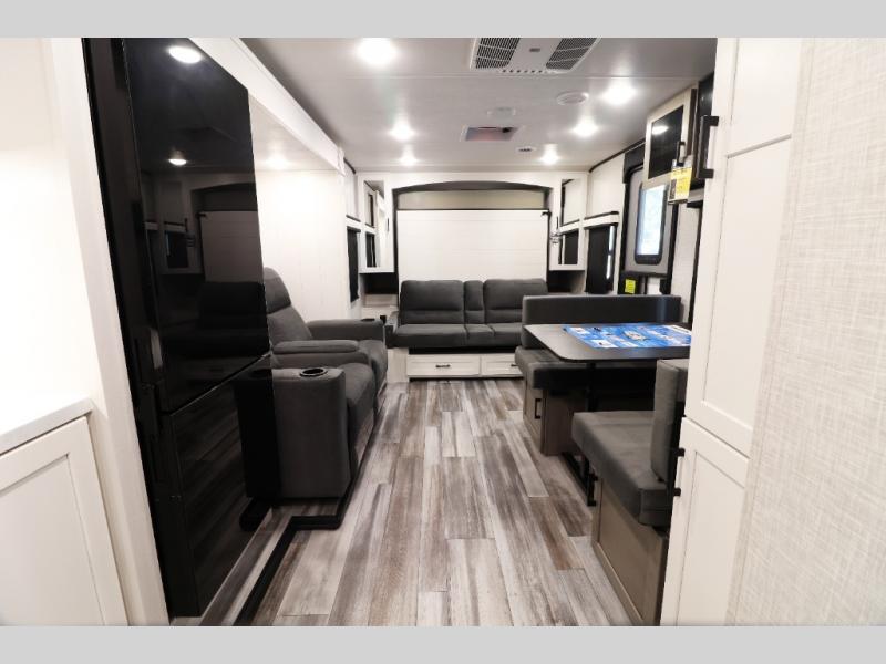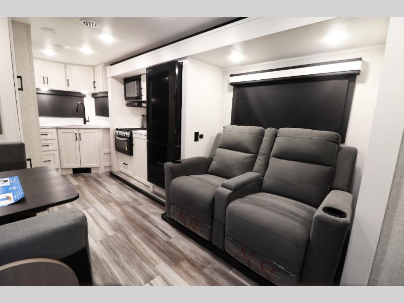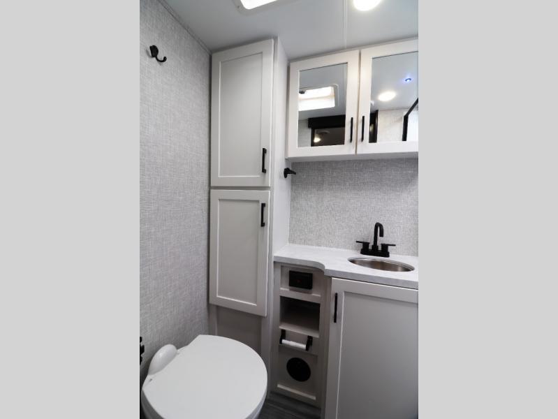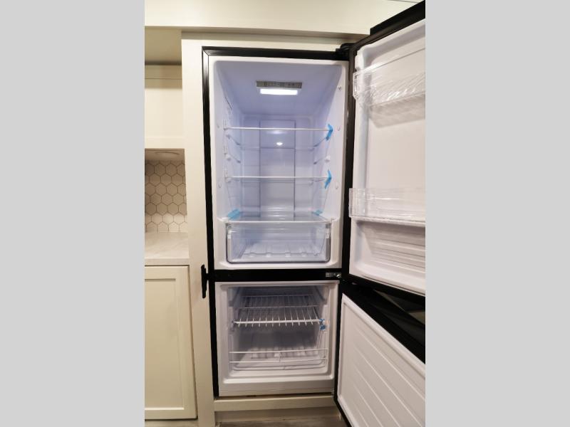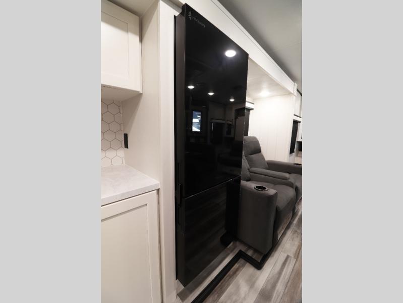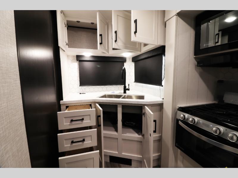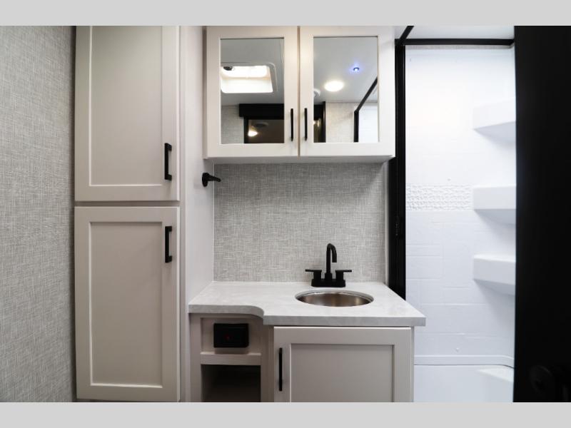 Stainless appliances – 3-burner cooktop, microwave, & 10 cu ft (or optional 11 cu ft) 12V In Vision fridge.