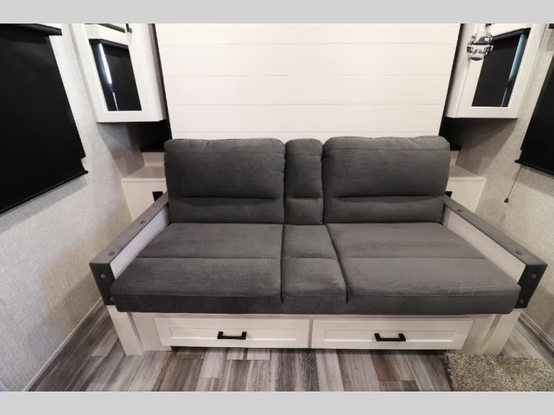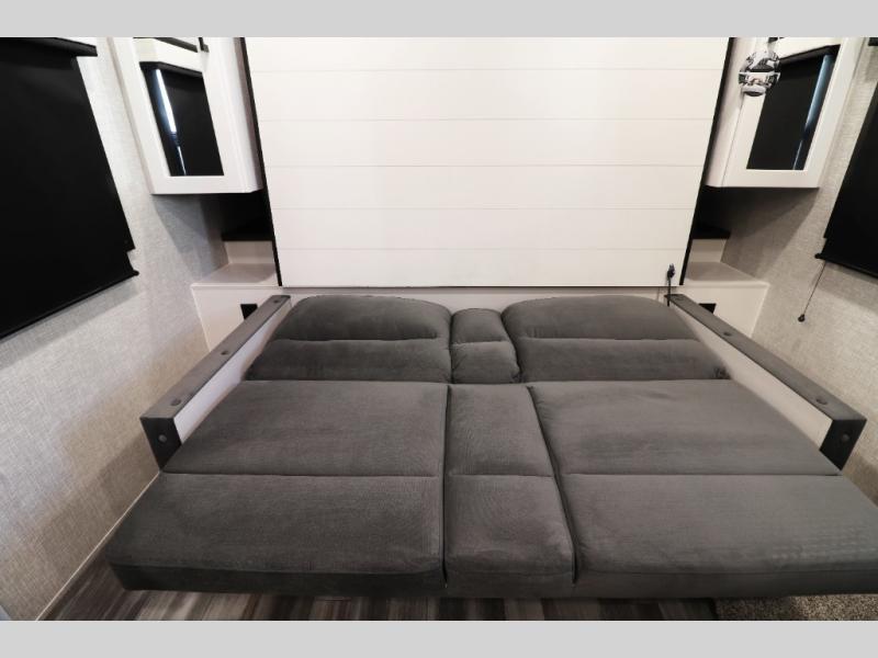 Flexible sleeping: Front Murphy bed (60"×80") that stows to reveal a jack-knife sofa + booth dinette—sleeks flexibility for day/night living.
