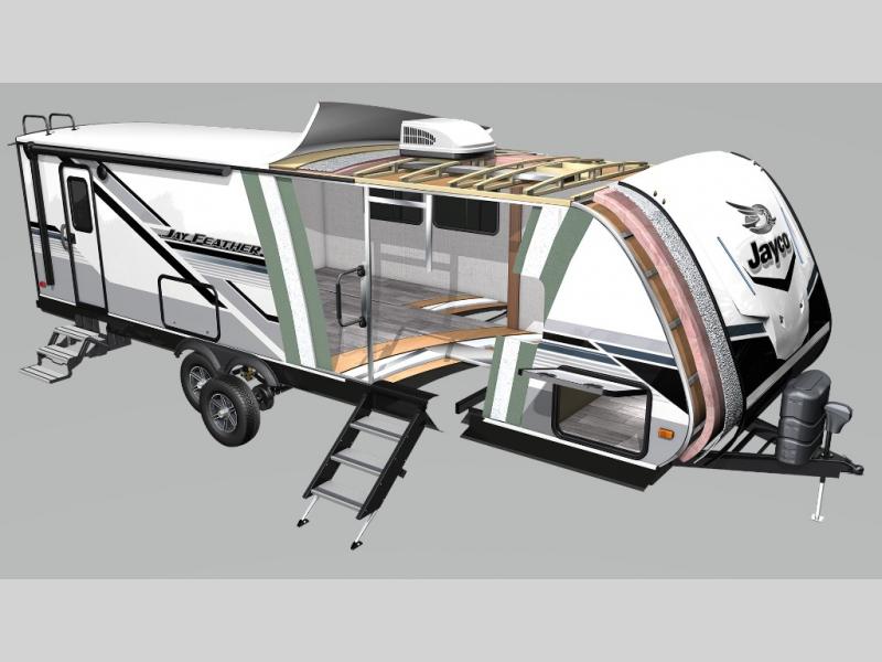 With any Jay Feather travel trailer by Jayco, you will experience an easy-to-tow, lightweight dual axle RV that is built on an American-made frame with an aerodynamic, rounded front profile with a diamond plate to protect against road debris, and includes Azdel composite in the perimeter walls, and Stronghold VBL vacuum-bonded, laminated floor and walls, plus the Magnum Truss roof system. Also included are features in the Customer Value package, and the Sport package which offers aluminum tread entry steps, roof-mount solar prep, an LED TV, and the Glacier package which includes an enclosed underbelly. The interior provides residential-style kitchen countertops with a decorative backsplash, residential plank-style vinyl flooring for easy care, a decorative wallboard for style, and ball-bearing drawer guides with 75 lb. capacity to mention a few of the amenities. Choose your favorite today!