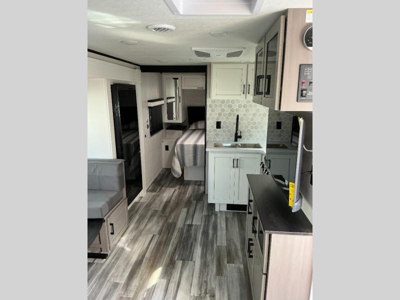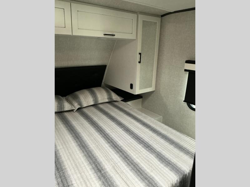 With any Jay Feather travel trailer by Jayco, you will enjoy lightweight towing, convenient exterior amenities, and at-home comforts inside! The Overlander 1 Solar Package included within the Jay Sport Package comes with a 200W solar panel and a 30-amp digital controller so you can enjoy some off-grid camping. There is also a modern graphics package with a dual-colored sidewall, LCI Solid Step fold-down aluminum tread steps on the main entry door, and Climate Shield 0 -100° F tested weather insulation package that will allow you to camp in all sorts of climates. The Customer Value Package will make time outdoors easier than ever with a power tongue jack and a Rock Solid stabilizer system, plus American-made nitro-filled Goodyear tires with self-adjusting electric brakes. More exterior features include a Keyed-Alike locking system, marine grade exterior speakers, a Magnum Truss roof system, and the list goes on! And we haven't even touched on the interior comforts, like the residential style seamless countertops and vinyl flooring throughout, decorative backsplash, handcrafted hardwood door/drawer fronts, and multiple USB charging ports to keep you going!