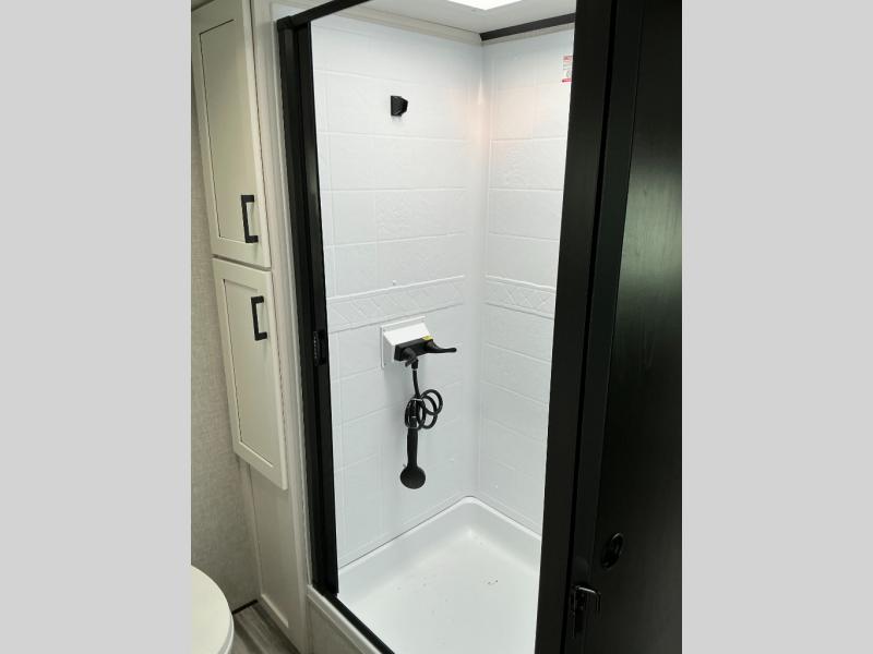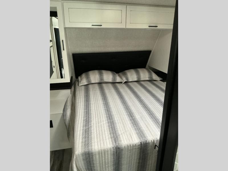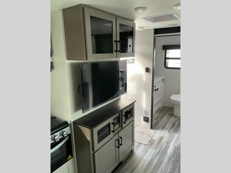 Whether you are a couple or a larger group, this trailer offers a spacious main living and kitchen area as well as rear bathroom for privacy. You will also find linen storage and ample counter space for toiletries. The space saving door even gives you more floor space in both the bathroom and the main area. The single slide holds the U-shaped dinette and 11 cu. ft. 12V refrigerator for even more floor space, the L-shaped kitchen area allows the cook their own space to make meals, and the walk-in pantry provides perfect for extra goodies on those longer camping trips. The front private bedroom provides privacy as well with its own space saving door, and you can sleep like royalty with a queen bed at night.