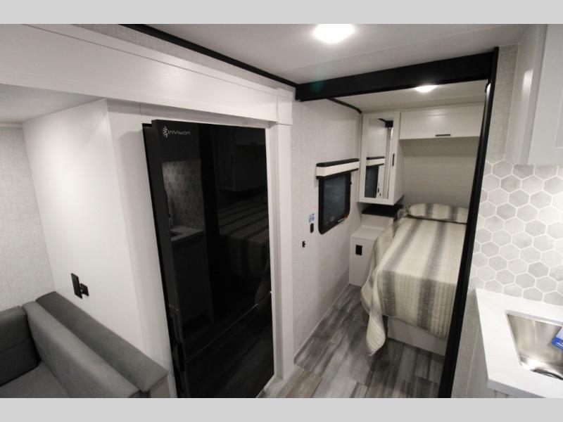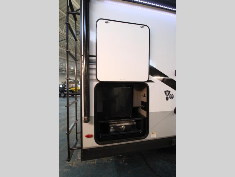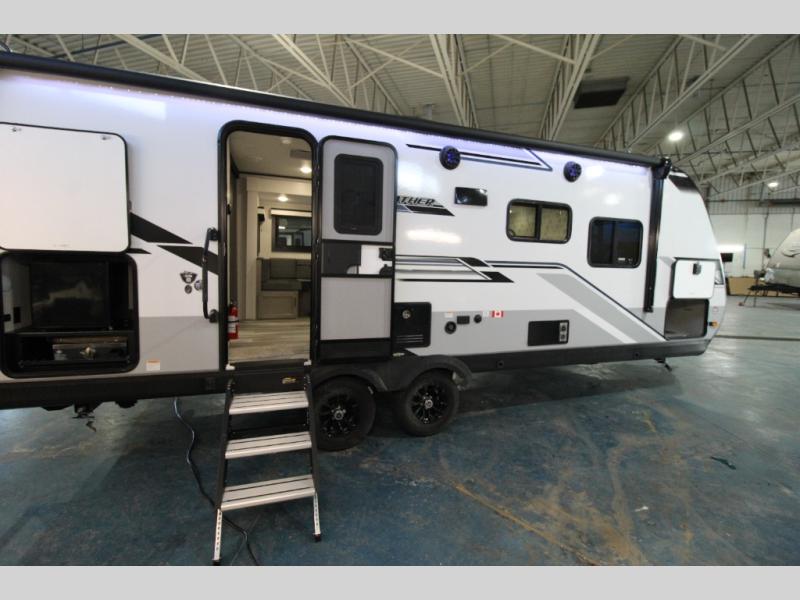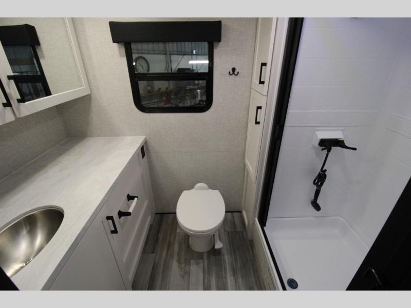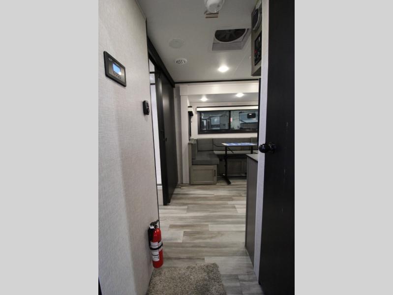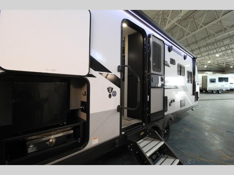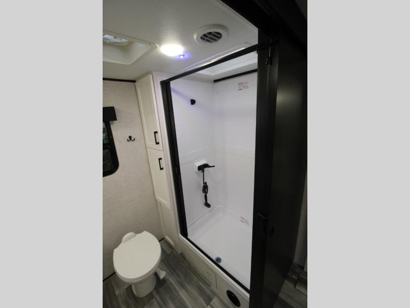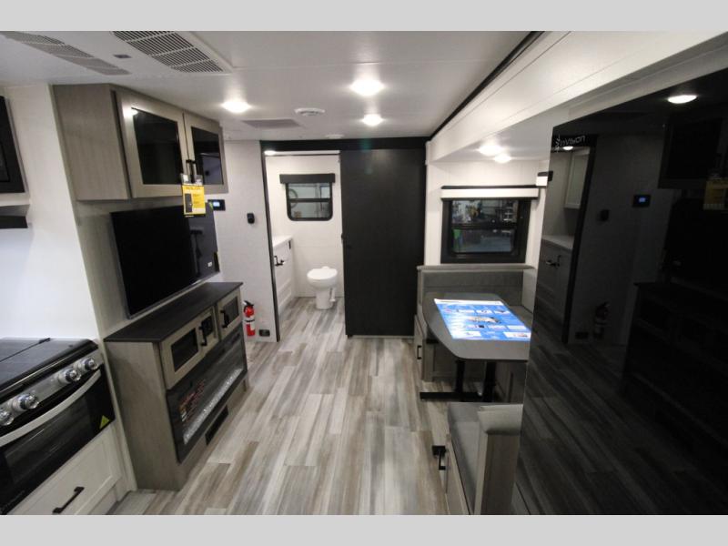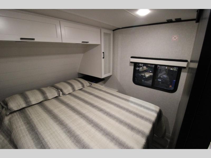 Whether you are a couple or a larger group, this trailer offers a spacious main living and kitchen area as well as rear bathroom for privacy. You will also find linen storage and ample counter space for toiletries. The space saving door even gives you more floor space in both the bathroom and the main area. The single slide holds the U-shaped dinette and 11 cu. ft. 12V refrigerator for even more floor space, the L-shaped kitchen area allows the cook their own space to make meals, and the walk-in pantry provides perfect for extra goodies on those longer camping trips. The front private bedroom provides privacy as well with its own space saving door, and you can sleep like royalty with a queen bed at night.