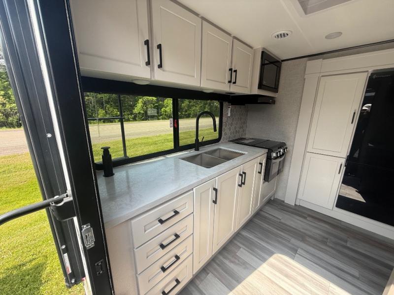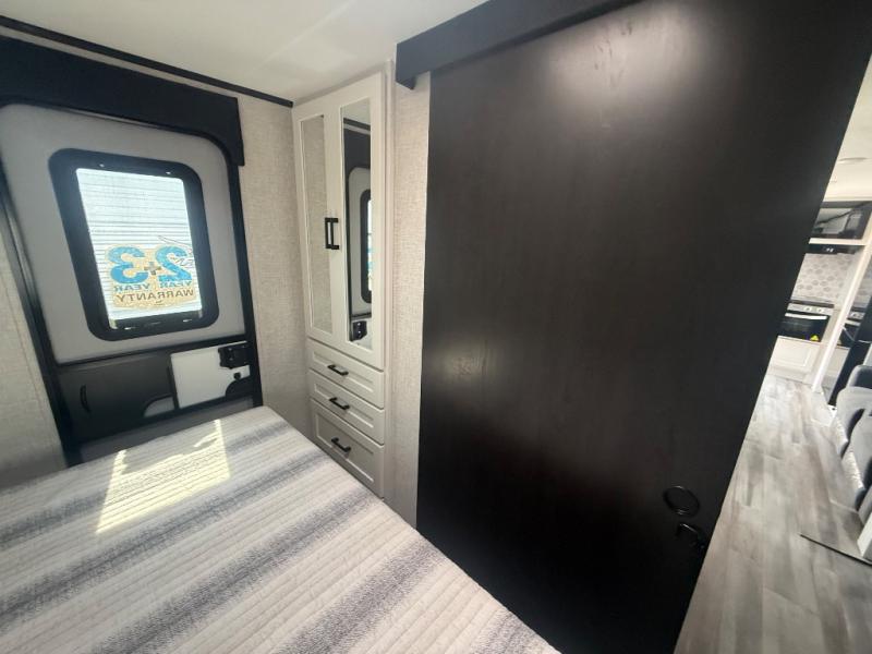 The chef of your group will love this rear kitchen trailer with generous counter space to prep meals! Your crew can dine at the booth dinette or under the 20' power awning with LED lights, and when you're ready to relax, the theater seat with table trays will provide comfort. There is also a storage/desk cabinet with a pull-out ottoman that will allow you to utilize this space however you need it! The spacious full bath will let you clean up each day, and the front private bedroom is sure to make you feel at home. Here, you'll find a queen bed, three wardrobes, plus one of the dual entry doors for added convenience!