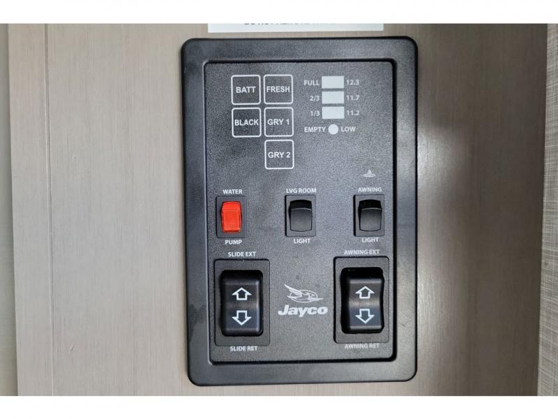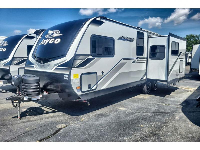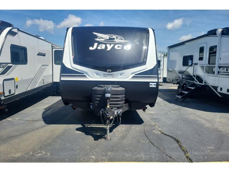 With any Jay Feather travel trailer by Jayco, you will enjoy lightweight towing, convenient exterior amenities, and at-home comforts inside! The Overlander 1 Solar Package included within the Jay Sport Package comes with a 200W solar panel and a 30-amp digital controller so you can enjoy some off-grid camping. There is also a modern graphics package with a dual-colored sidewall, LCI Solid Step fold-down aluminum tread steps on the main entry door, and Climate Shield 0 -100° F tested weather insulation package that will allow you to camp in all sorts of climates. The Customer Value Package will make time outdoors easier than ever with a power tongue jack and a Rock Solid stabilizer system, plus American-made nitro-filled Goodyear tires with self-adjusting electric brakes. More exterior features include a Keyed-Alike locking system, marine grade exterior speakers, a Magnum Truss roof system, and the list goes on! And we haven't even touched on the interior comforts, like the residential style seamless countertops and vinyl flooring throughout, decorative backsplash, handcrafted hardwood door/drawer fronts, and multiple USB charging ports to keep you going!