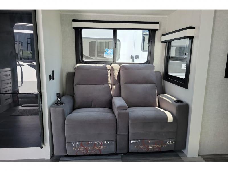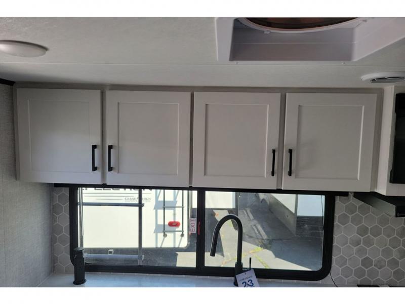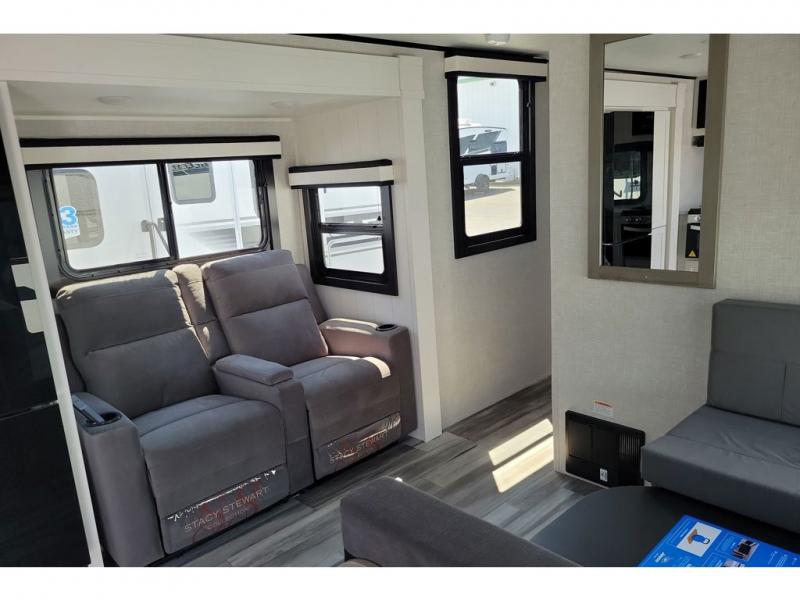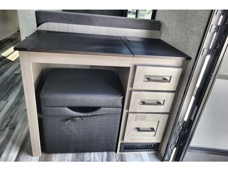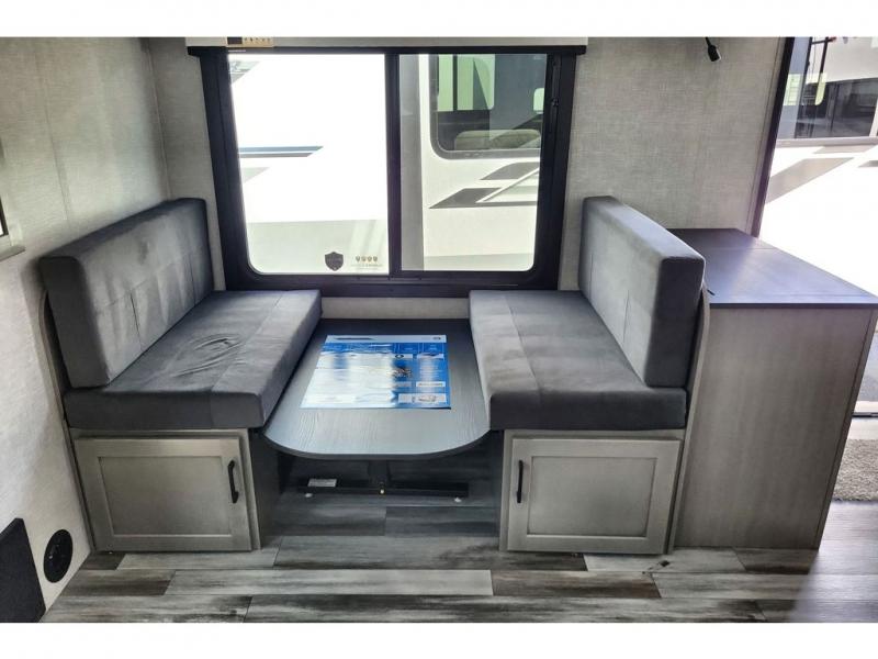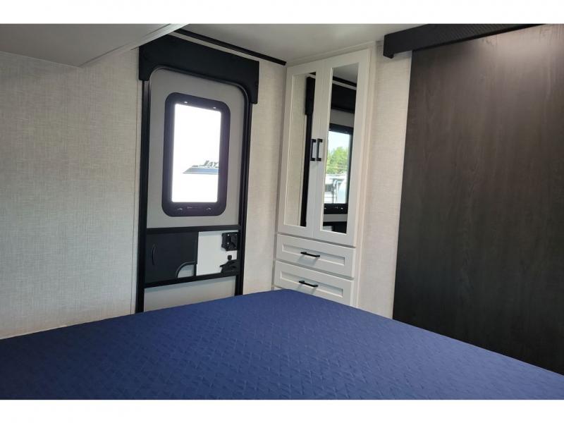 The chef of your group will love this rear kitchen trailer with generous counter space to prep meals! Your crew can dine at the booth dinette or under the 20' power awning with LED lights, and when you're ready to relax, the theater seat with table trays will provide comfort. There is also a storage/desk cabinet with a pull-out ottoman that will allow you to utilize this space however you need it! The spacious full bath will let you clean up each day, and the front private bedroom is sure to make you feel at home. Here, you'll find a queen bed, three wardrobes, plus one of the dual entry doors for added convenience!