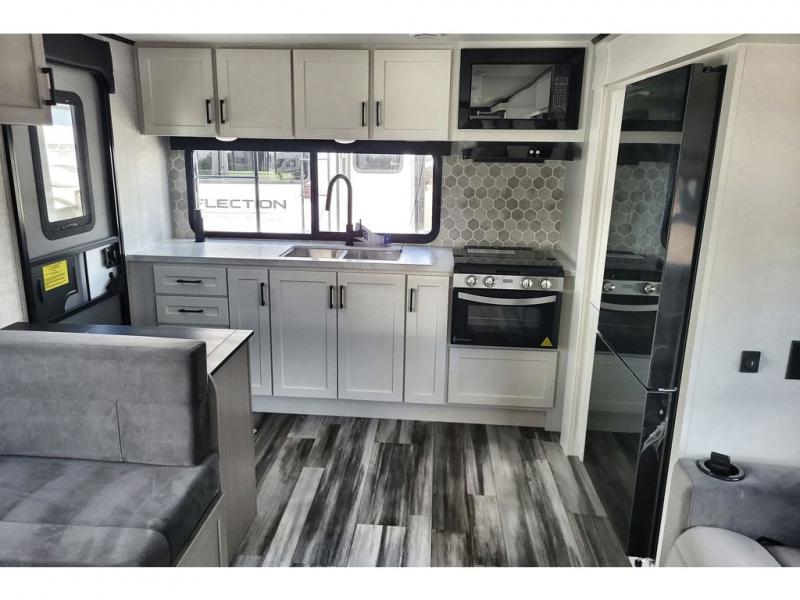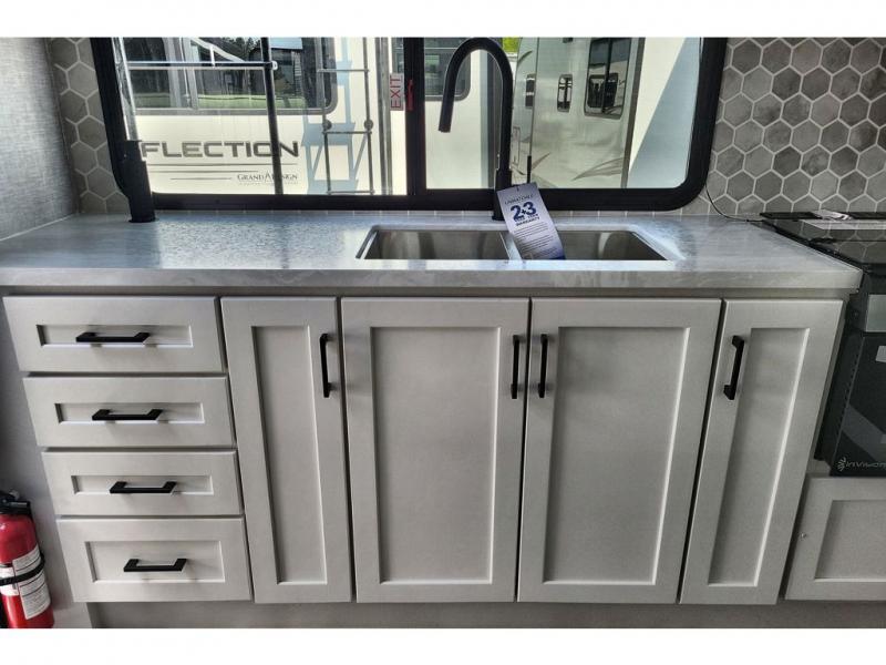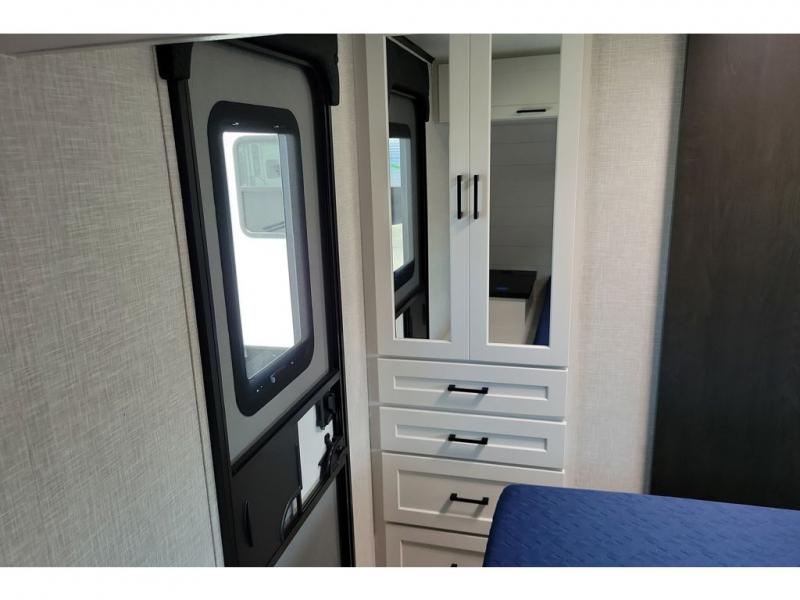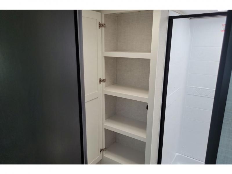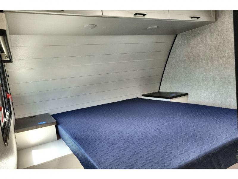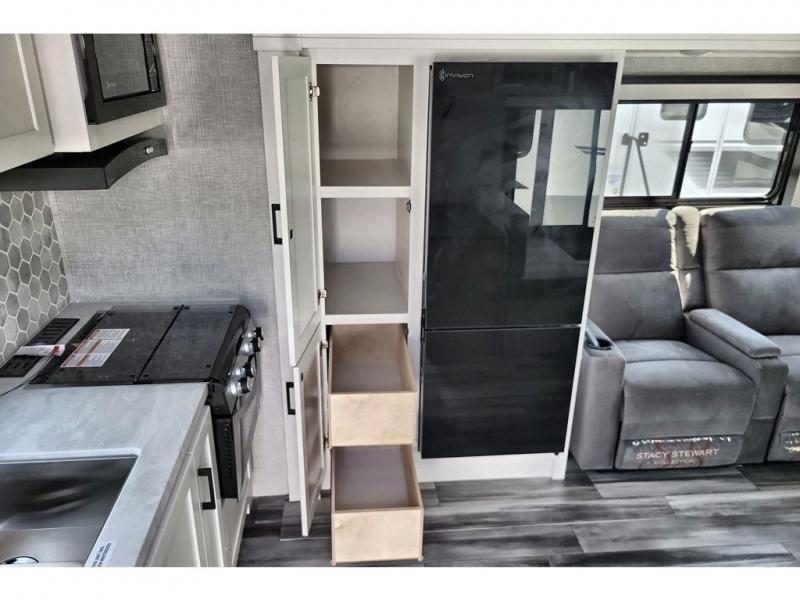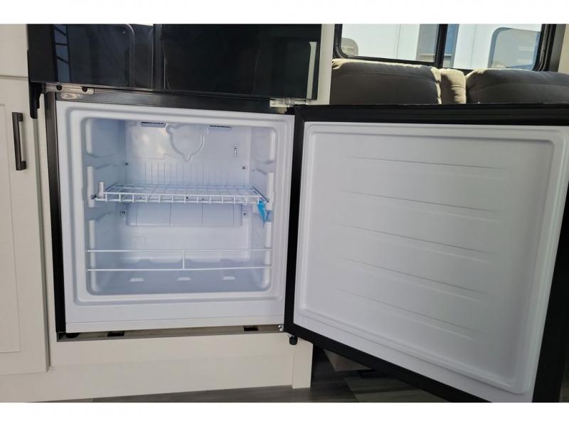 The chef of your group will love this rear kitchen trailer with generous counter space to prep meals! Your crew can dine at the booth dinette or under the 20' power awning with LED lights, and when you're ready to relax, the theater seat with table trays will provide comfort. There is also a storage/desk cabinet with a pull-out ottoman that will allow you to utilize this space however you need it! The spacious full bath will let you clean up each day, and the front private bedroom is sure to make you feel at home. Here, you'll find a queen bed, three wardrobes, plus one of the dual entry doors for added convenience!