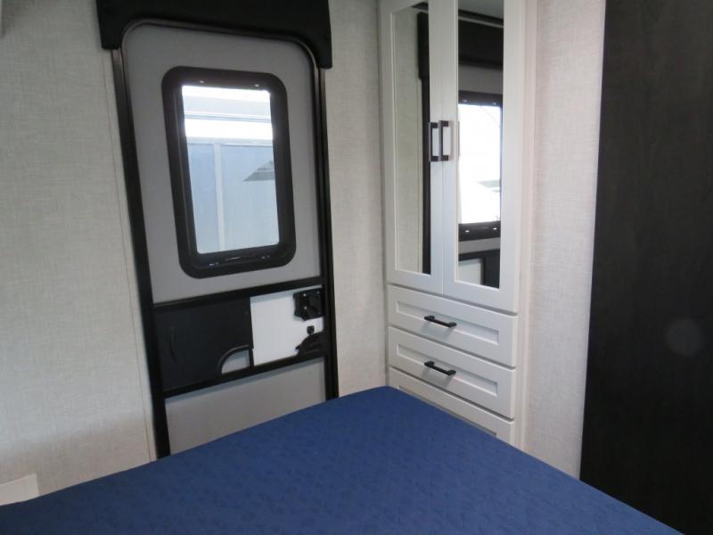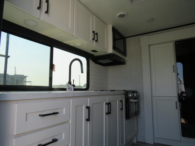 The chef of your group will love this rear kitchen trailer with generous counter space to prep meals! Your crew can dine at the booth dinette or under the 20' power awning with LED lights, and when you're ready to relax, the theater seat with table trays will provide comfort. There is also a storage/desk cabinet with a pull-out ottoman that will allow you to utilize this space however you need it! The spacious full bath will let you clean up each day, and the front private bedroom is sure to make you feel at home. Here, you'll find a queen bed, three wardrobes, plus one of the dual entry doors for added convenience!