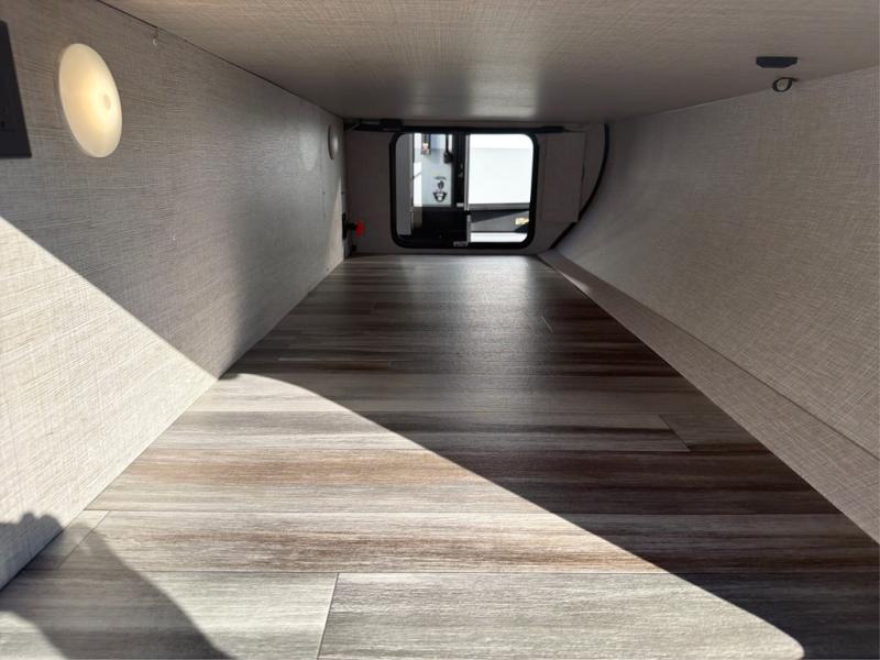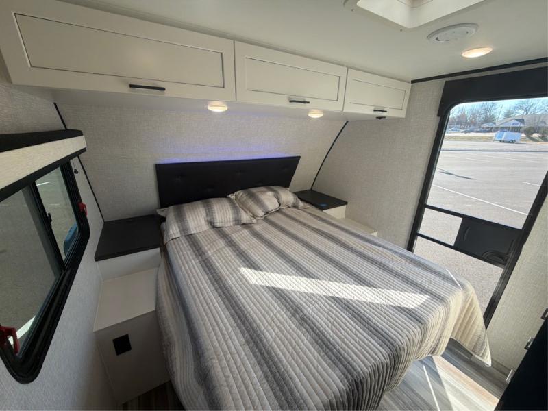 The chef of your group will love this rear kitchen trailer with generous counter space to prep meals! Your crew can dine at the booth dinette or under the 20' power awning with LED lights, and when you're ready to relax, the theater seat with table trays will provide comfort. There is also a storage/desk cabinet with a pull-out ottoman that will allow you to utilize this space however you need it! The spacious full bath will let you clean up each day, and the front private bedroom is sure to make you feel at home. Here, you'll find a queen bed, three wardrobes, plus one of the dual entry doors for added convenience!