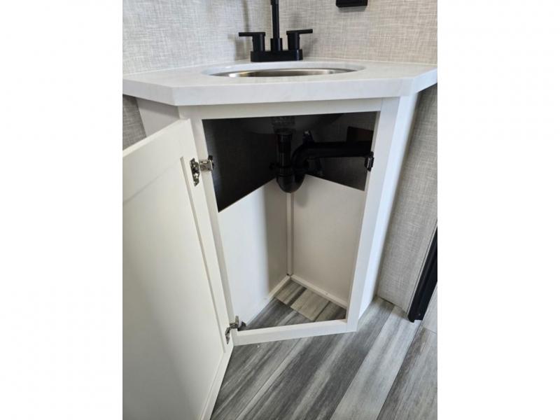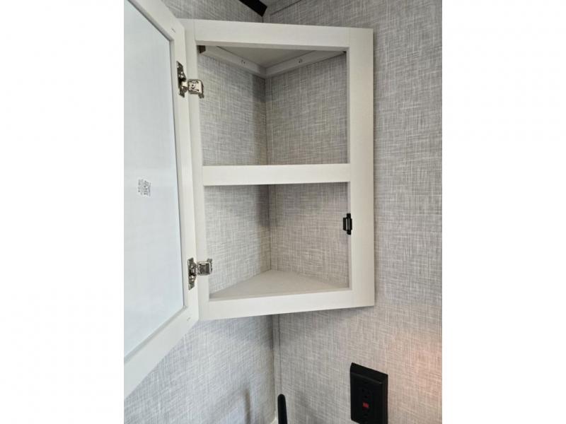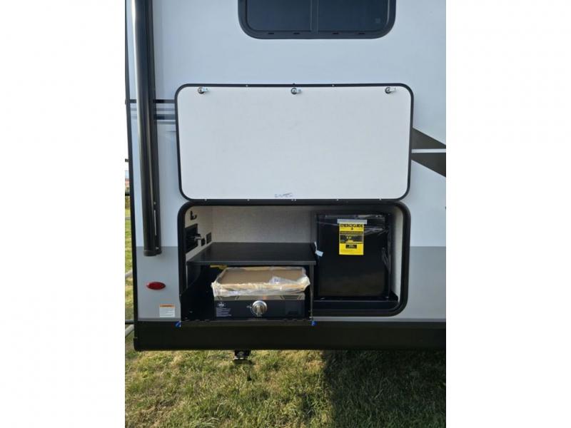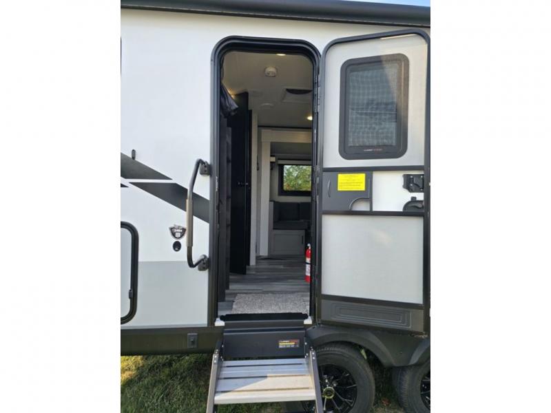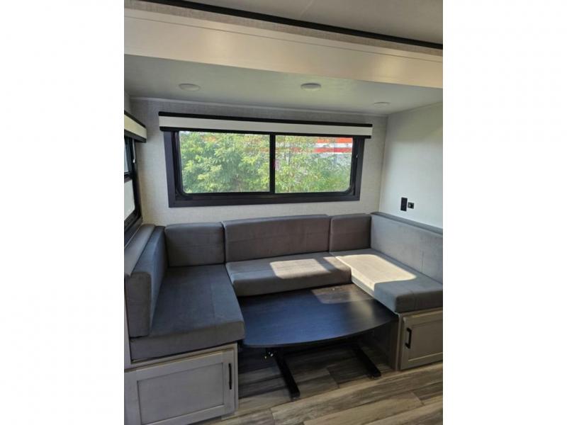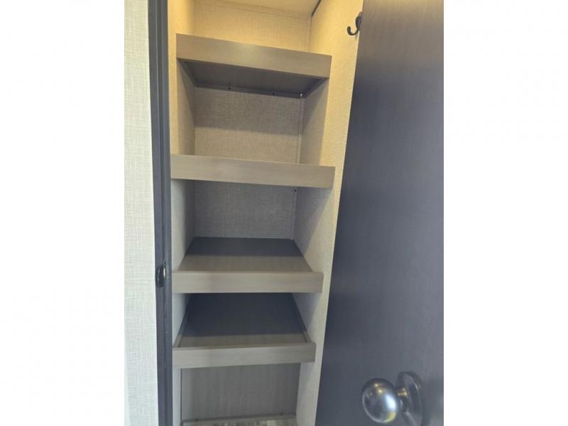 There is so much to love about this trailer from the double-size bunks in the rear with a ladder for easy access, plus the cargo door that allows you to stow larger items from the exterior to the interior underneath the bunks. You also have exterior storage compartments for outdoor gear. And the cook can choose to make meals using the outside kitchen including a refrigerator to store some cold items or the inside kitchen with full amenities including an 11 cu. ft. 12V refrigerator and ample counter space. The walk-in pantry is a nice feature as well especially when you have a big crew. There is a private bedroom up front with a queen bed and dual wardrobes for your things, and any other guests can sleep on the U-shaped dinette in the main living area!