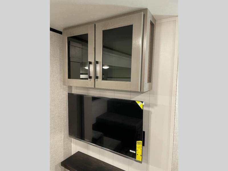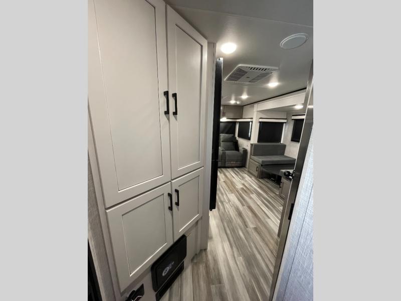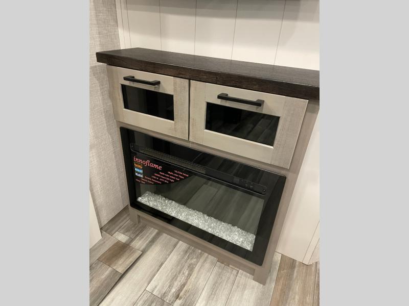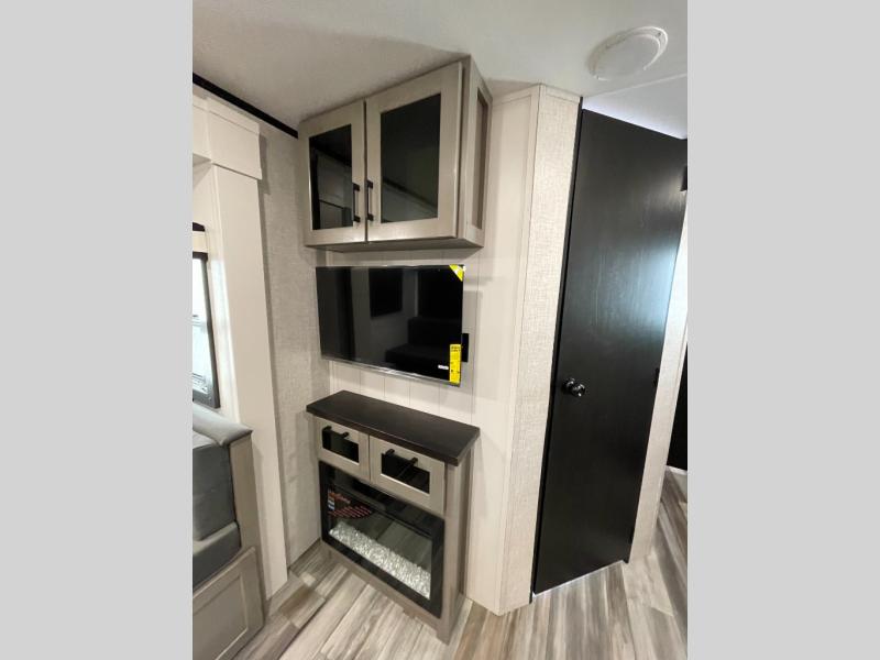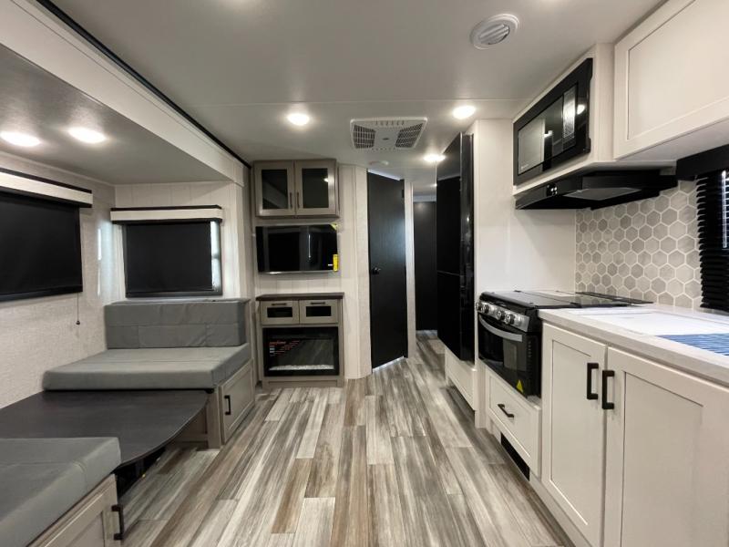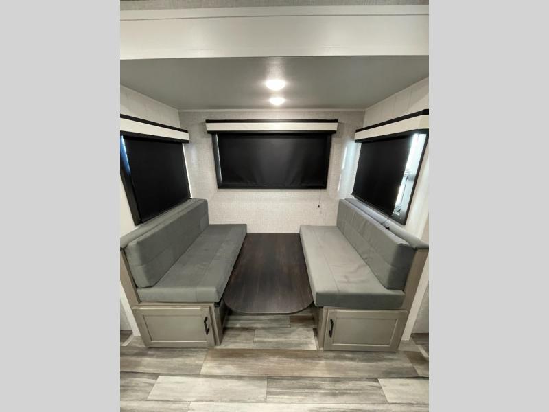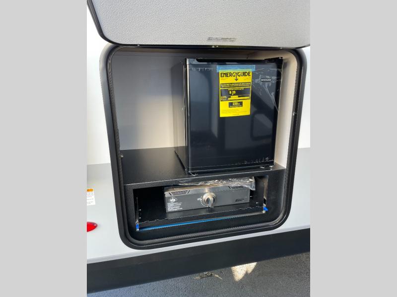 Camp at a local state park or travel to see new places with this trailer that can sleep six when you utilize the furniture as sleeping space. Two can sleep in the front bedroom on a queen bed with dual wardrobes and includes access to the double entry bathroom, while others sleep on the booth dinette slide out and the rear tri-fold sofa. There is an LED Smart TV in the main area to watch while everyone plans their activities or while the cook makes meals using full amenities. There is an outdoor griddle with LP quick connect and an outside refrigerator to store more cold items.