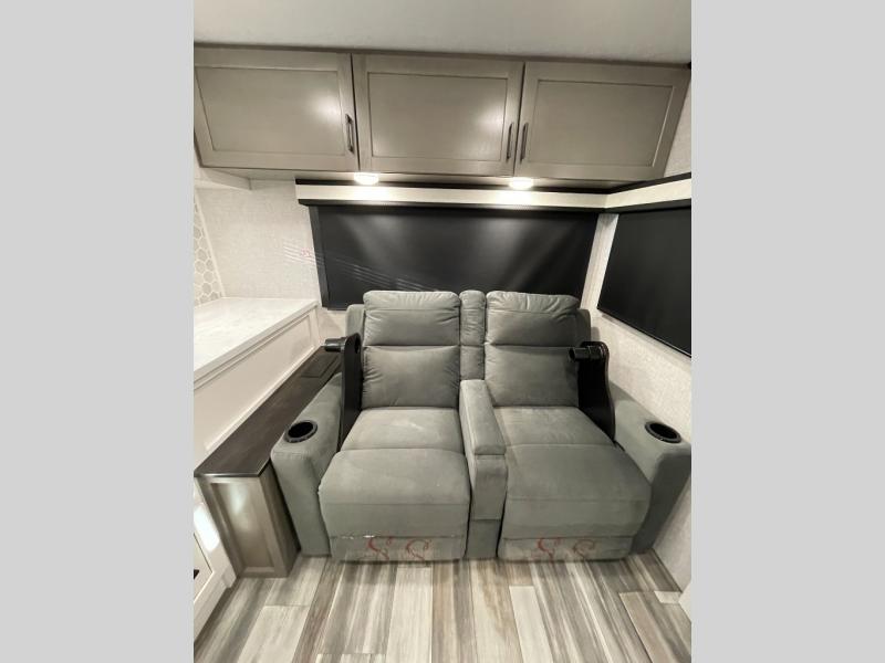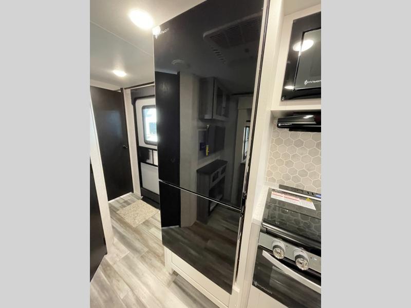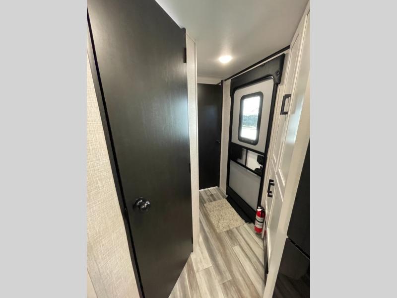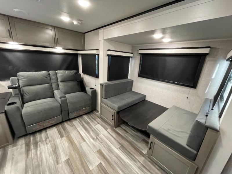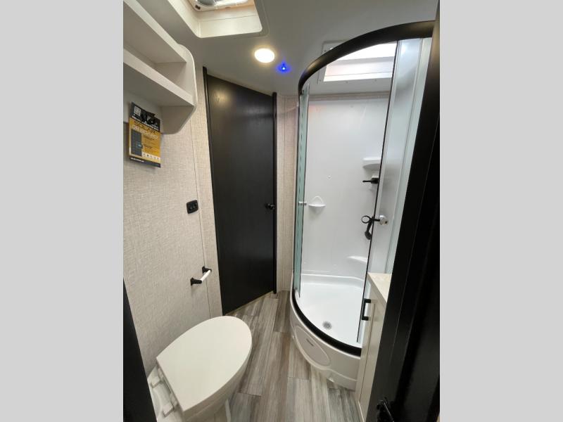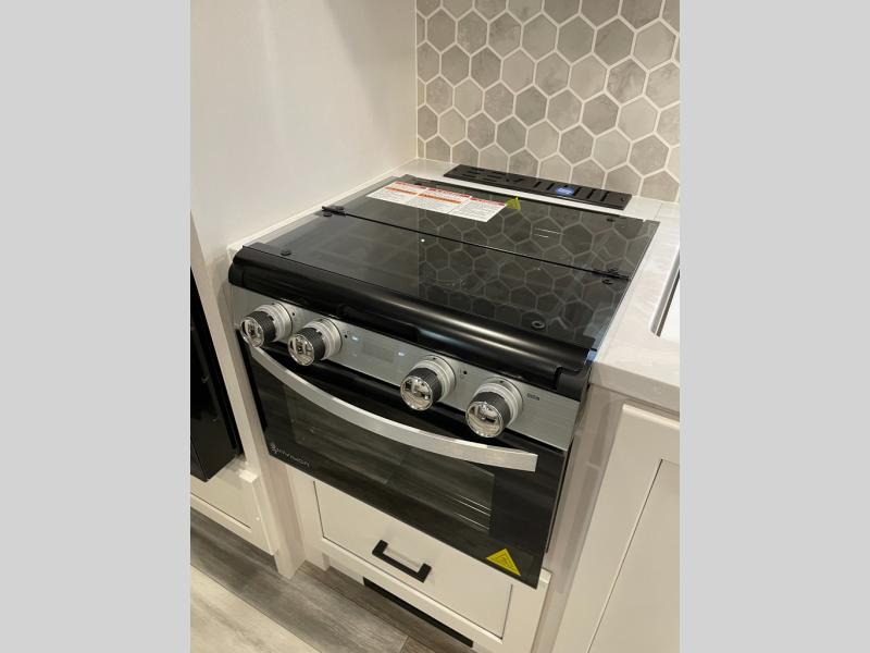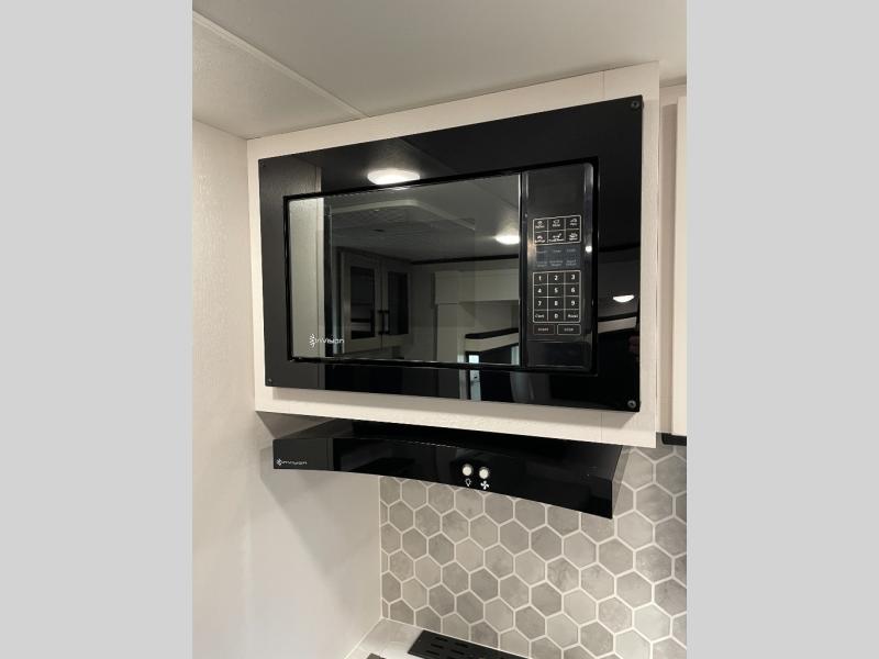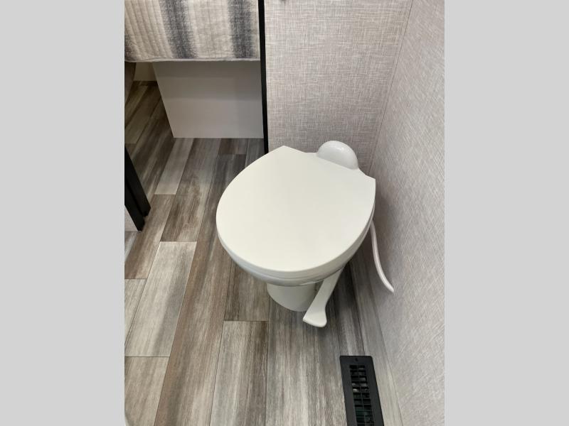 Camp at a local state park or travel to see new places with this trailer that can sleep six when you utilize the furniture as sleeping space. Two can sleep in the front bedroom on a queen bed with dual wardrobes and includes access to the double entry bathroom, while others sleep on the booth dinette slide out and the rear tri-fold sofa. There is an LED Smart TV in the main area to watch while everyone plans their activities or while the cook makes meals using full amenities. There is an outdoor griddle with LP quick connect and an outside refrigerator to store more cold items.