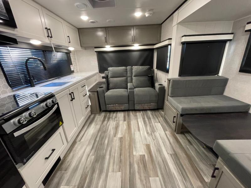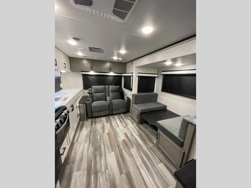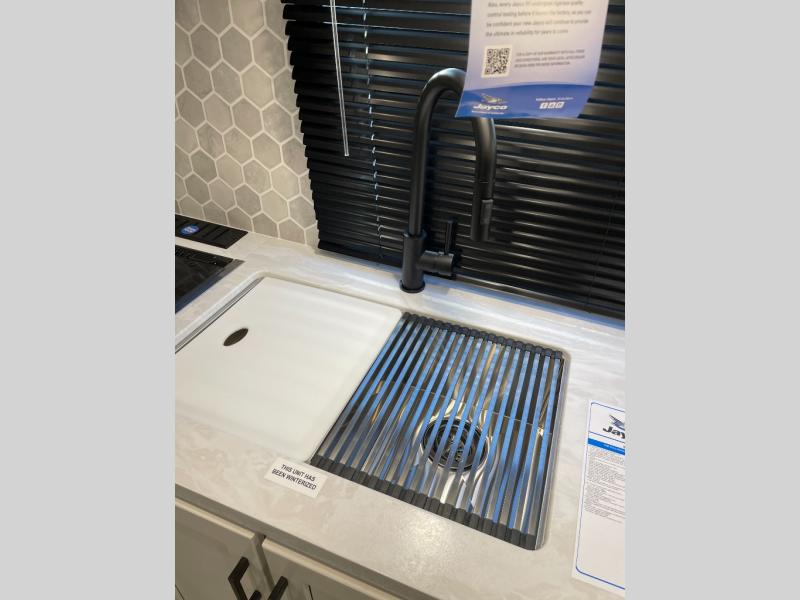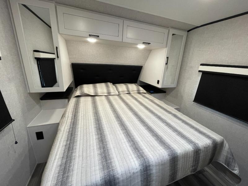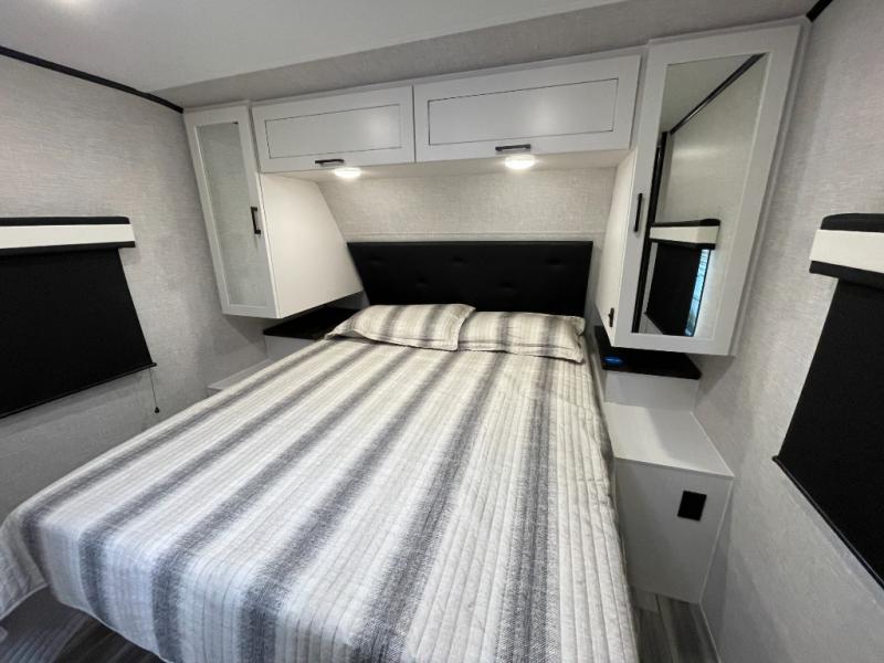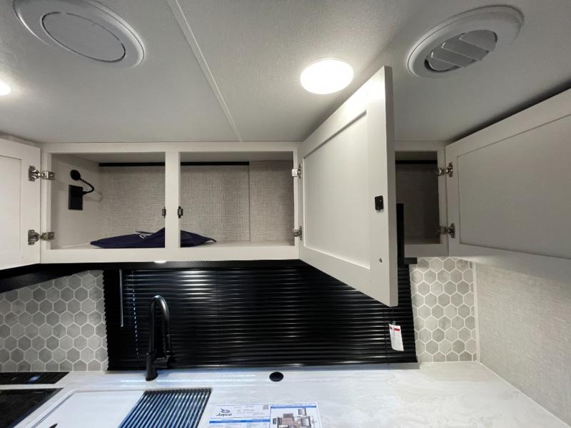 With any Jay Feather travel trailer by Jayco, you will enjoy lightweight towing, convenient exterior amenities, and at-home comforts inside! The Overlander 1 Solar Package included within the Jay Sport Package comes with a 200W solar panel and a 30-amp digital controller so you can enjoy some off-grid camping. There is also a modern graphics package with a dual-colored sidewall, LCI Solid Step fold-down aluminum tread steps on the main entry door, and Climate Shield 0 -100° F tested weather insulation package that will allow you to camp in all sorts of climates. The Customer Value Package will make time outdoors easier than ever with a power tongue jack and a Rock Solid stabilizer system, plus American-made nitro-filled Goodyear tires with self-adjusting electric brakes. More exterior features include a Keyed-Alike locking system, marine grade exterior speakers, a Magnum Truss roof system, and the list goes on! And we haven't even touched on the interior comforts, like the residential style seamless countertops and vinyl flooring throughout, decorative backsplash, handcrafted hardwood door/drawer fronts, and multiple USB charging ports to keep you going!