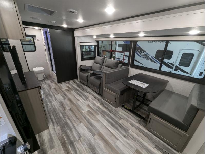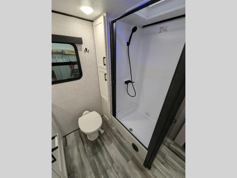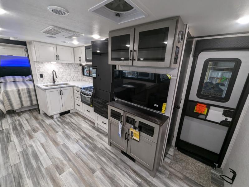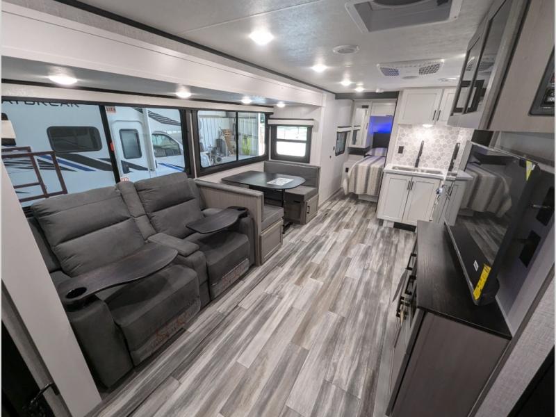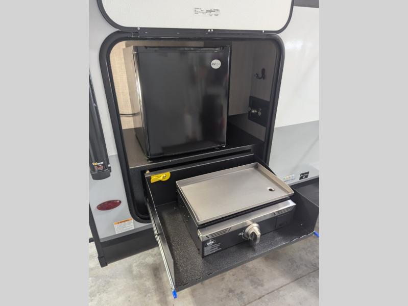 This travel trailer with a full rear bath is sure to bring you comfort wherever you camp. The front private bedroom with queen bed and dual wardrobes will have you feeling right at home. You can enjoy home cooked meals while at the campsite thanks to the three burner cooktop and 11 cu. ft. 12V refrigerator, plus there is a walk-in pantry to store all of your favorite snacks. The theater seat recliners and booth dinette within the slide out offer comfortable places to relax. You can even cook breakfast outdoors using the outside kitchen and stay protected from the elements by the 19' power awning!