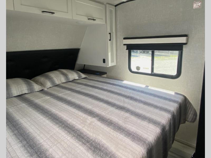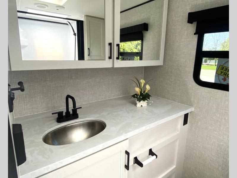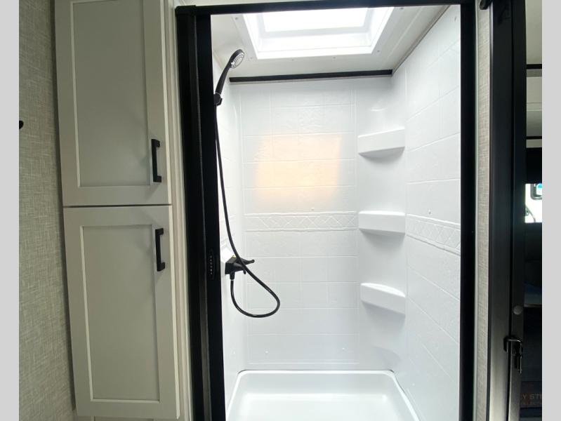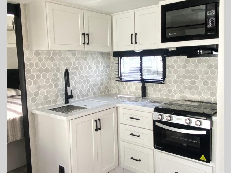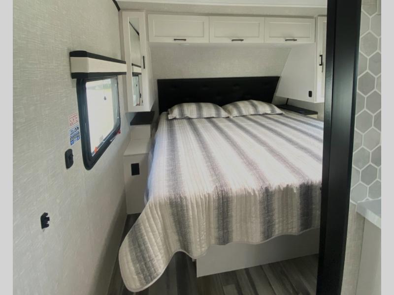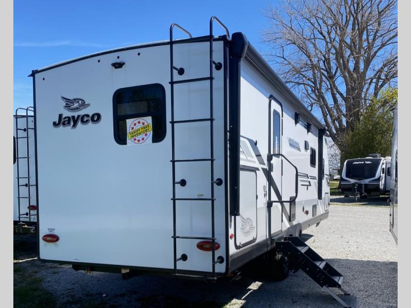 With any Jay Feather travel trailer by Jayco, you will enjoy lightweight towing, convenient exterior amenities, and at-home comforts inside! The Overlander 1 Solar Package included within the Jay Sport Package comes with a 200W solar panel and a 30-amp digital controller so you can enjoy some off-grid camping. There is also a modern graphics package with a dual-colored sidewall, LCI Solid Step fold-down aluminum tread steps on the main entry door, and Climate Shield 0 -100° F tested weather insulation package that will allow you to camp in all sorts of climates. The Customer Value Package will make time outdoors easier than ever with a power tongue jack and a Rock Solid stabilizer system, plus American-made nitro-filled Goodyear tires with self-adjusting electric brakes. More exterior features include a Keyed-Alike locking system, marine grade exterior speakers, a Magnum Truss roof system, and the list goes on! And we haven't even touched on the interior comforts, like the residential style seamless countertops and vinyl flooring throughout, decorative backsplash, handcrafted hardwood door/drawer fronts, and multiple USB charging ports to keep you going!