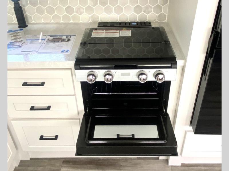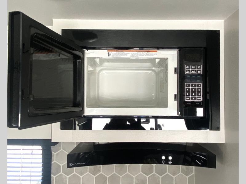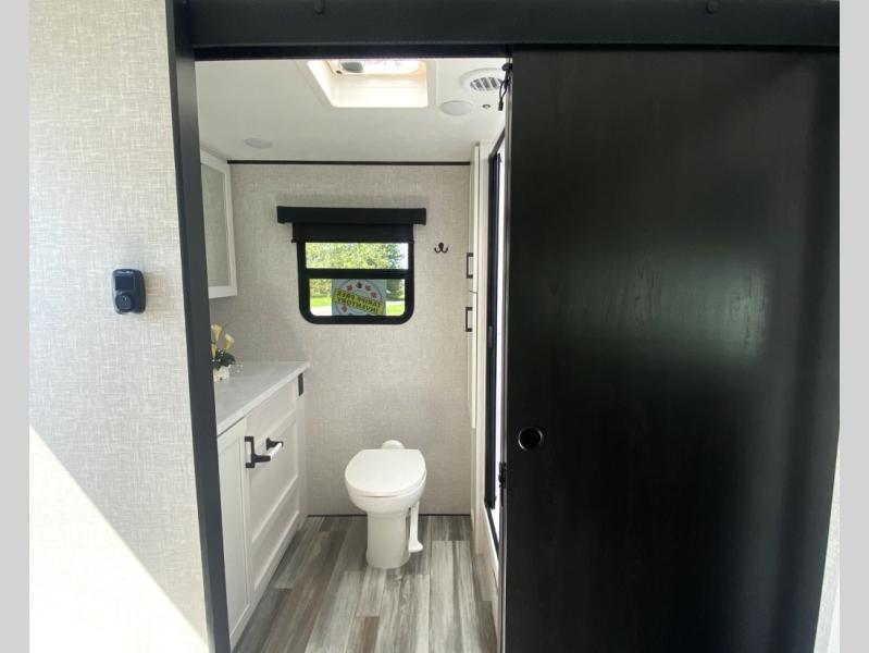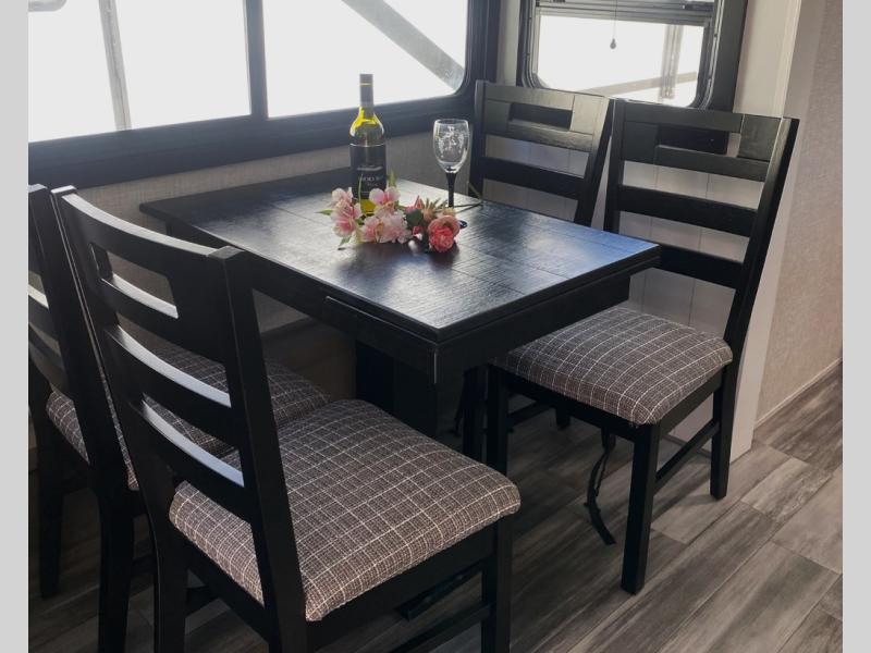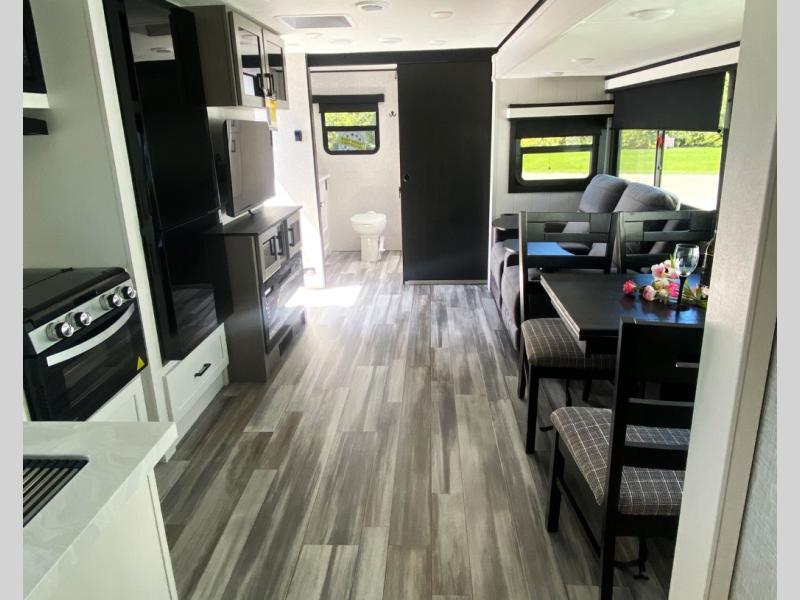 This travel trailer with a full rear bath is sure to bring you comfort wherever you camp. The front private bedroom with queen bed and dual wardrobes will have you feeling right at home. You can enjoy home cooked meals while at the campsite thanks to the three burner cooktop and 11 cu. ft. 12V refrigerator, plus there is a walk-in pantry to store all of your favorite snacks. The tri-fold sofa and booth dinette within the slide out offer comfortable places to relax. You can even cook breakfast outdoors using the outside kitchen and stay protected from the elements by the 19' power awning!
