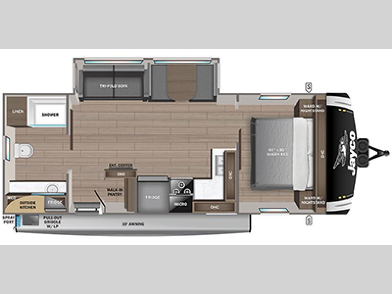 With any Jay Feather travel trailer by Jayco, you will enjoy lightweight towing, convenient exterior amenities, and at-home comforts inside! The Overlander 1 Solar Package included within the Jay Sport Package comes with a 200W solar panel and a 30-amp digital controller so you can enjoy some off-grid camping. There is also a modern graphics package with a dual-colored sidewall, LCI Solid Step fold-down aluminum tread steps on the main entry door, and Climate Shield 0 -100° F tested weather insulation package that will allow you to camp in all sorts of climates. The Customer Value Package will make time outdoors easier than ever with a power tongue jack and a Rock Solid stabilizer system, plus American-made nitro-filled Goodyear tires with self-adjusting electric brakes. More exterior features include a Keyed-Alike locking system, marine grade exterior speakers, a Magnum Truss roof system, and the list goes on! And we haven't even touched on the interior comforts, like the residential style seamless countertops and vinyl flooring throughout, decorative backsplash, handcrafted hardwood door/drawer fronts, and multiple USB charging ports to keep you going!