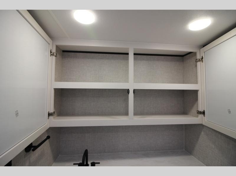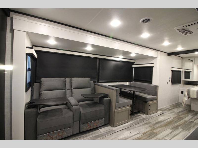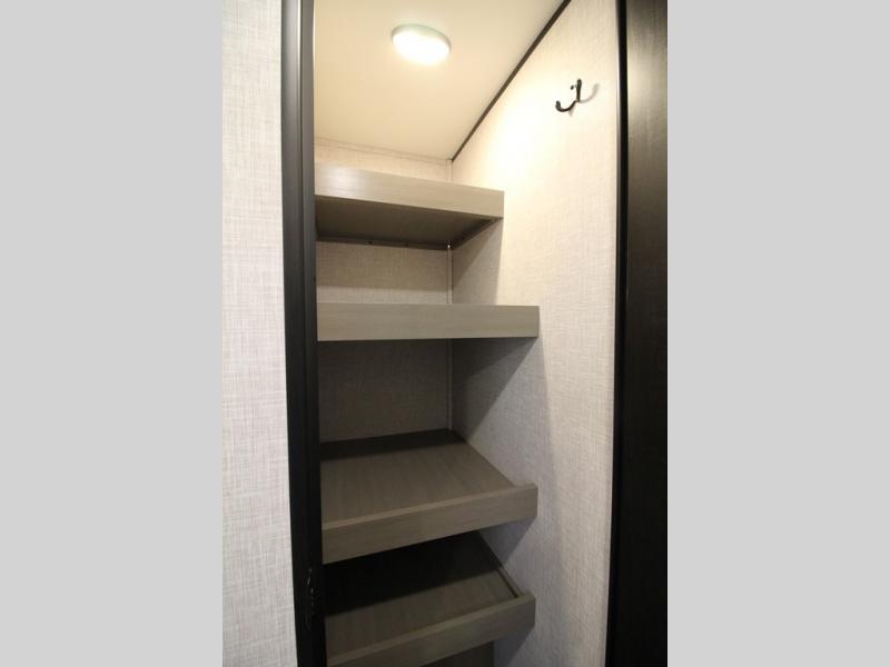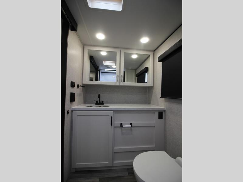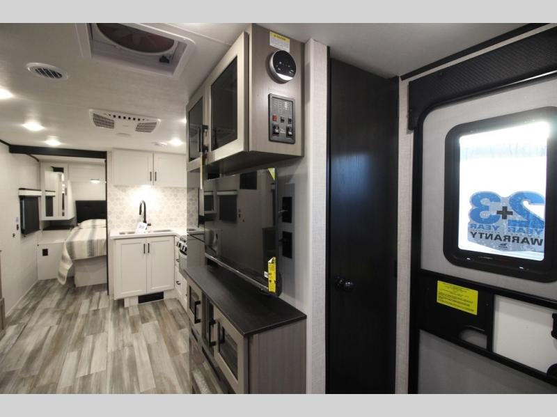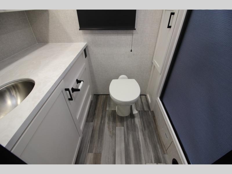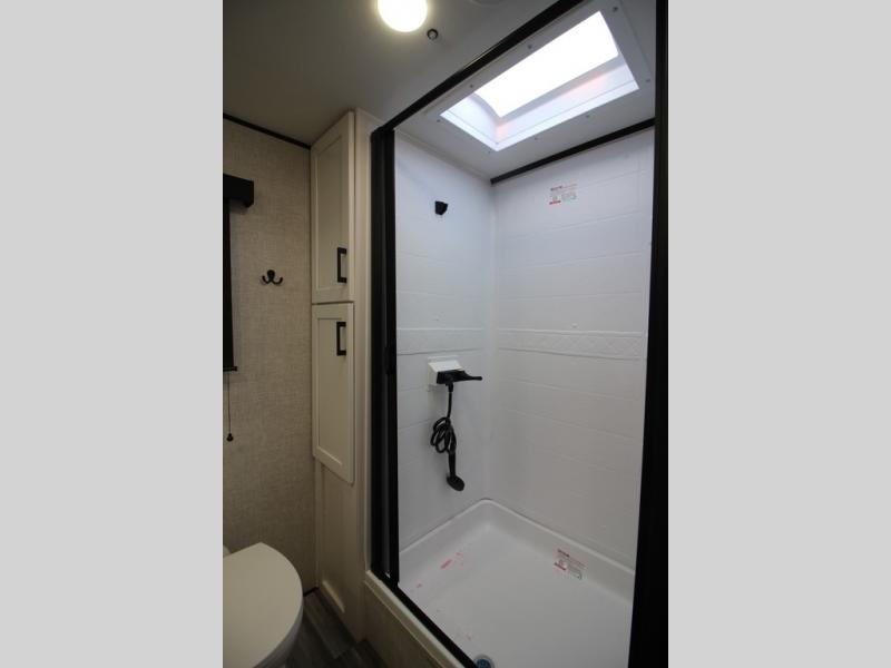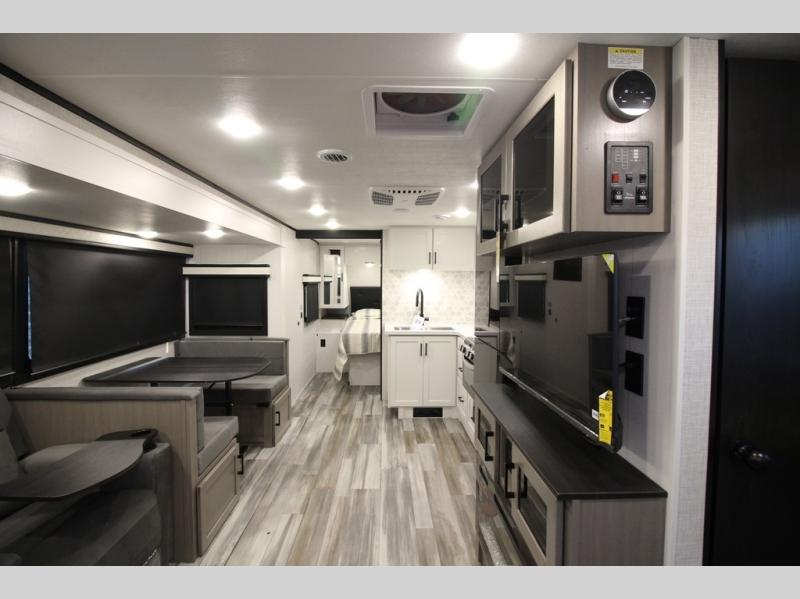 This travel trailer with a full rear bath is sure to bring you comfort wherever you camp. The front private bedroom with queen bed and dual wardrobes will have you feeling right at home. You can enjoy home cooked meals while at the campsite thanks to the three burner cooktop and 11 cu. ft. 12V refrigerator, plus there is a walk-in pantry to store all of your favorite snacks. The tri-fold sofa and booth dinette within the slide out offer comfortable places to relax. You can even cook breakfast outdoors using the outside kitchen and stay protected from the elements by the 19' power awning!