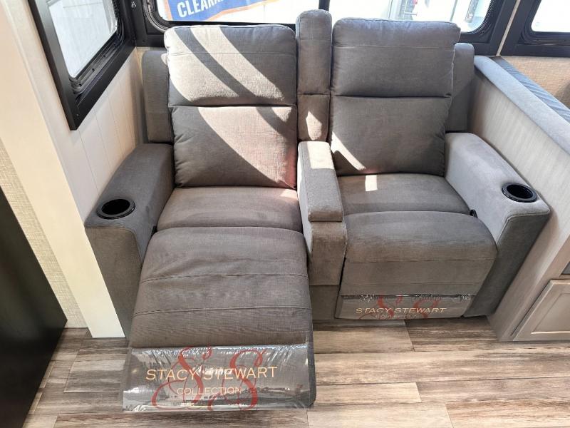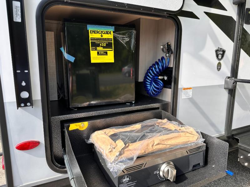 This travel trailer with a full rear bath is sure to bring you comfort wherever you camp. The front private bedroom with queen bed and dual wardrobes will have you feeling right at home. You can enjoy home cooked meals while at the campsite thanks to the three burner cooktop and 11 cu. ft. 12V refrigerator, plus there is a walk-in pantry to store all of your favorite snacks. The tri-fold sofa and booth dinette within the slide out offer comfortable places to relax. You can even cook breakfast outdoors using the outside kitchen and stay protected from the elements by the 19' power awning!