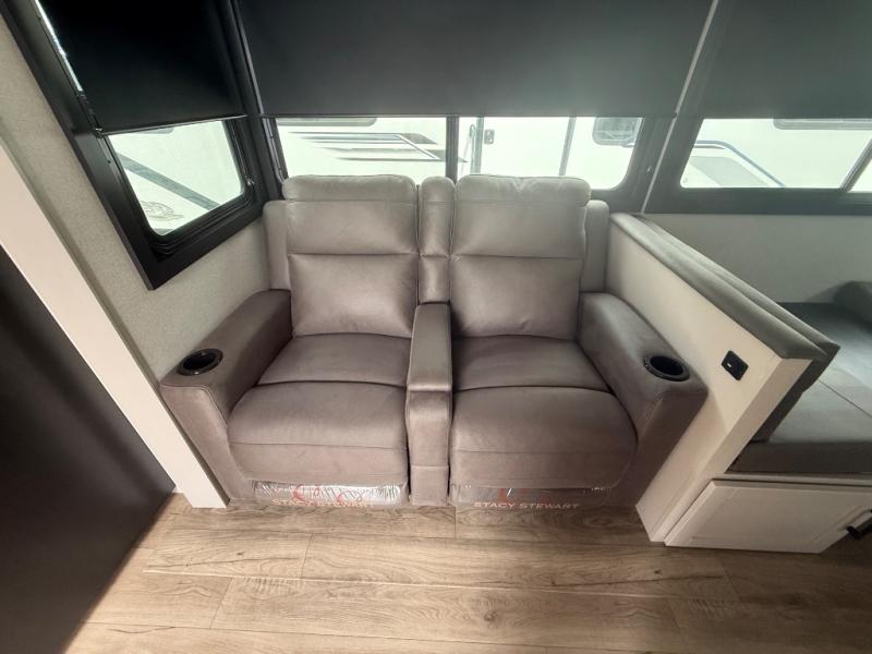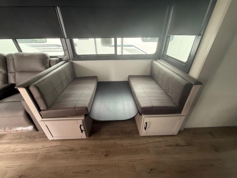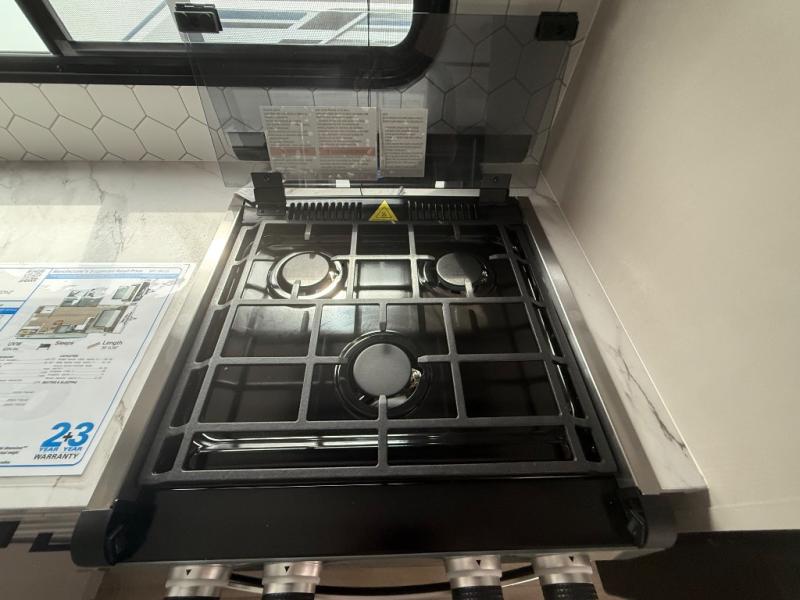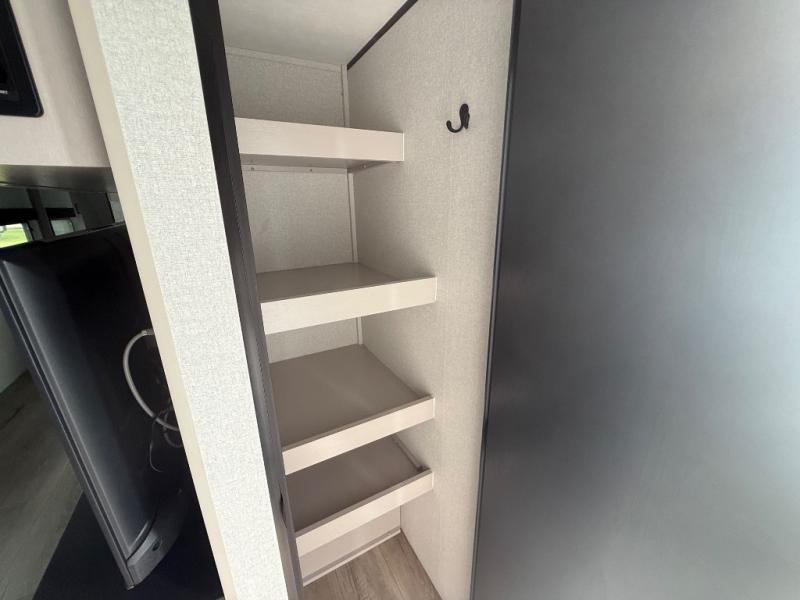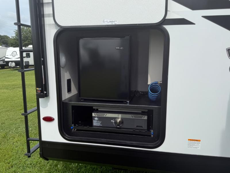 This travel trailer with a full rear bath is sure to bring you comfort wherever you camp. The front private bedroom with queen bed and dual wardrobes will have you feeling right at home. You can enjoy home cooked meals while at the campsite thanks to the three burner cooktop and 11 cu. ft. 12V refrigerator, plus there is a walk-in pantry to store all of your favorite snacks. The tri-fold sofa and booth dinette within the slide out offer comfortable places to relax. You can even cook breakfast outdoors using the outside kitchen and stay protected from the elements by the 19' power awning!
