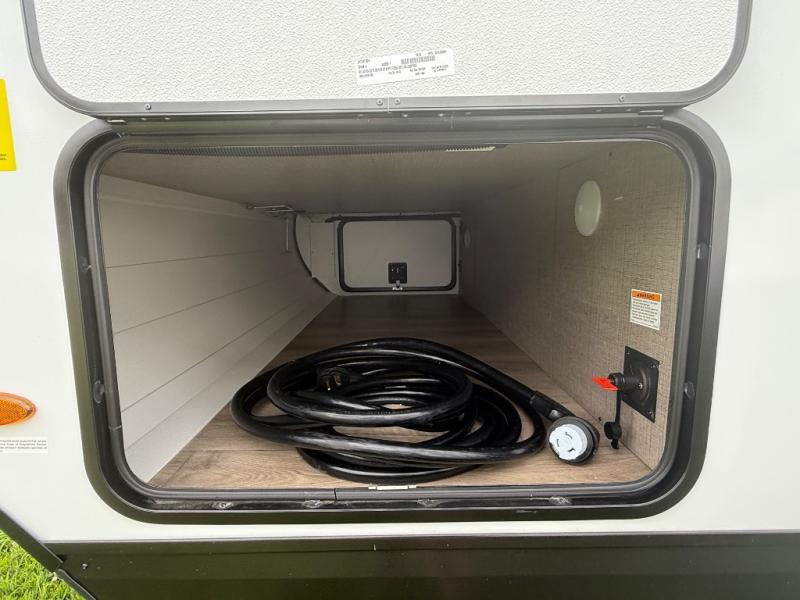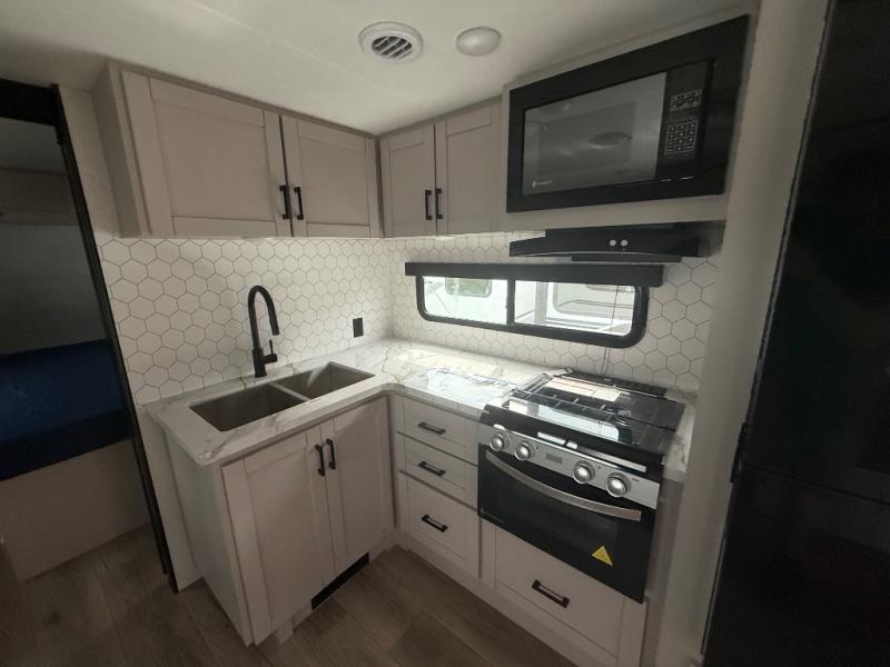 With any Jay Feather travel trailer by Jayco, you will enjoy lightweight towing, convenient exterior amenities, and at-home comforts inside! The Overlander 1 Solar Package included within the Jay Sport Package comes with a 200W solar panel and a 30-amp digital controller so you can enjoy some off-grid camping. There is also a modern graphics package with a dual-colored sidewall, LCI Solid Step fold-down aluminum tread steps on the main entry door, and Climate Shield 0 -100° F tested weather insulation package that will allow you to camp in all sorts of climates. The Customer Value Package will make time outdoors easier than ever with a power tongue jack and a Rock Solid stabilizer system, plus American-made nitro-filled Goodyear tires with self-adjusting electric brakes. More exterior features include a Keyed-Alike locking system, marine grade exterior speakers, a Magnum Truss roof system, and the list goes on! And we haven't even touched on the interior comforts, like the residential style seamless countertops and vinyl flooring throughout, decorative backsplash, handcrafted hardwood door/drawer fronts, and multiple USB charging ports to keep you going!
