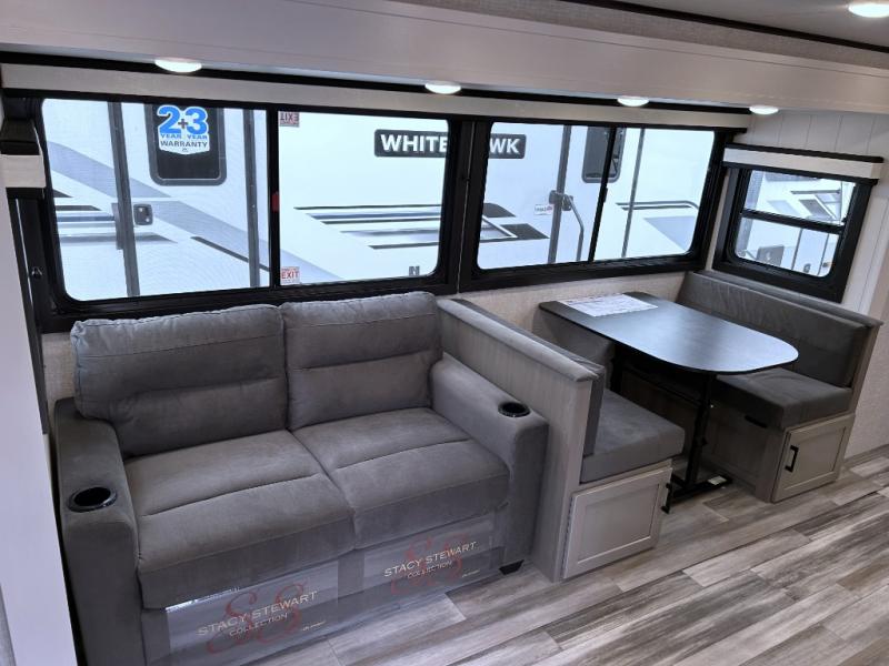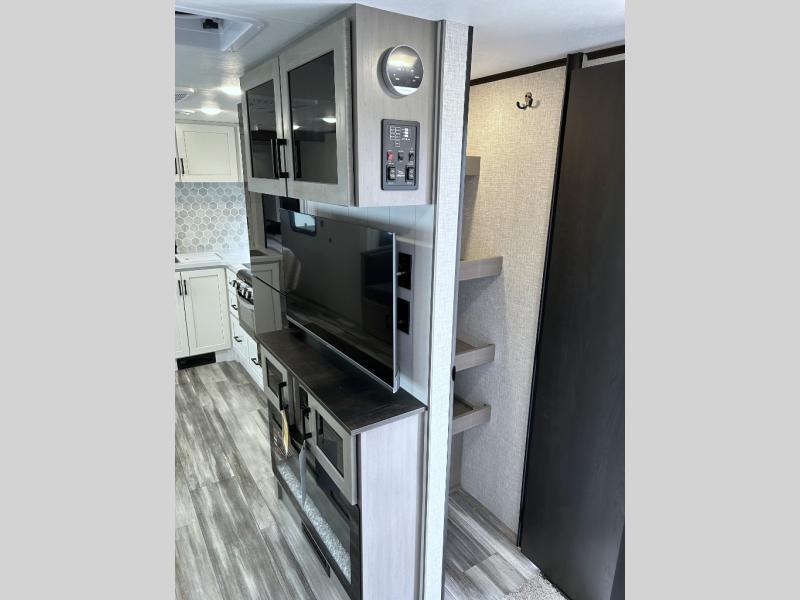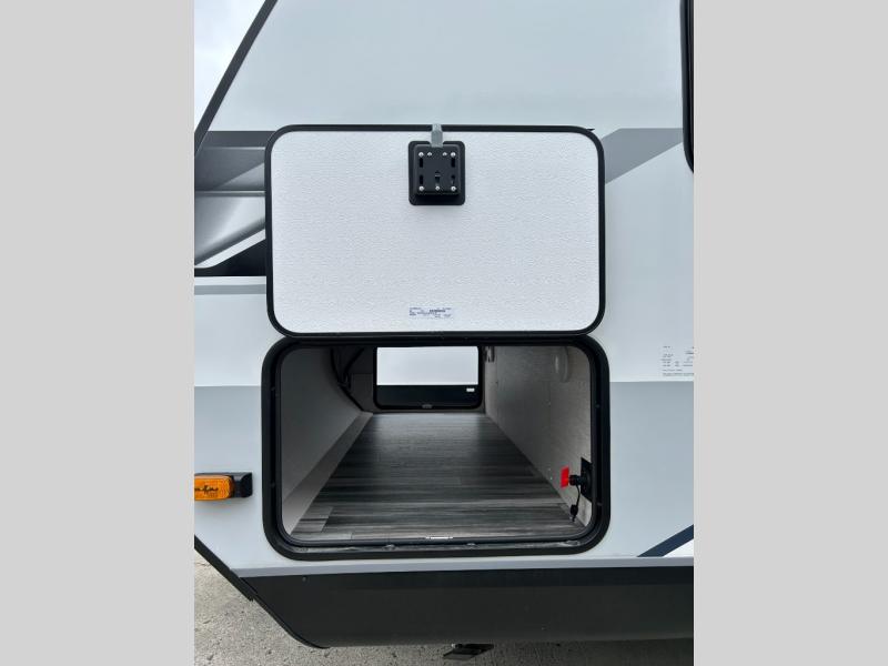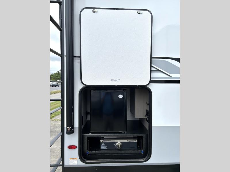 This travel trailer with a full rear bath is sure to bring you comfort wherever you camp. The front private bedroom with queen bed and dual wardrobes will have you feeling right at home. You can enjoy home cooked meals while at the campsite thanks to the three burner cooktop and 10.7 cu. ft. 12V refrigerator, plus there is a walk-in pantry to store all of your favorite snacks. The tri-fold sofa and booth dinette within the slide out offer comfortable places to relax. You can even cook breakfast outdoors using the outside kitchen and stay protected from the elements by the 19' power awning!