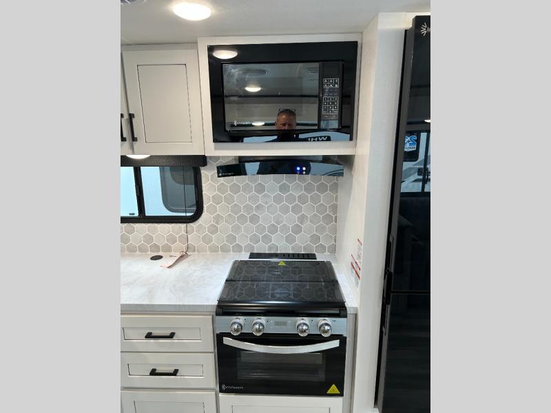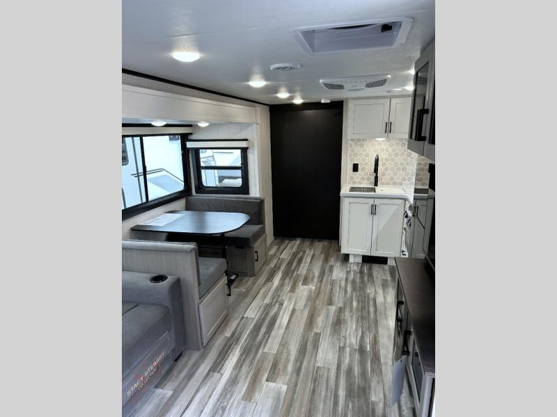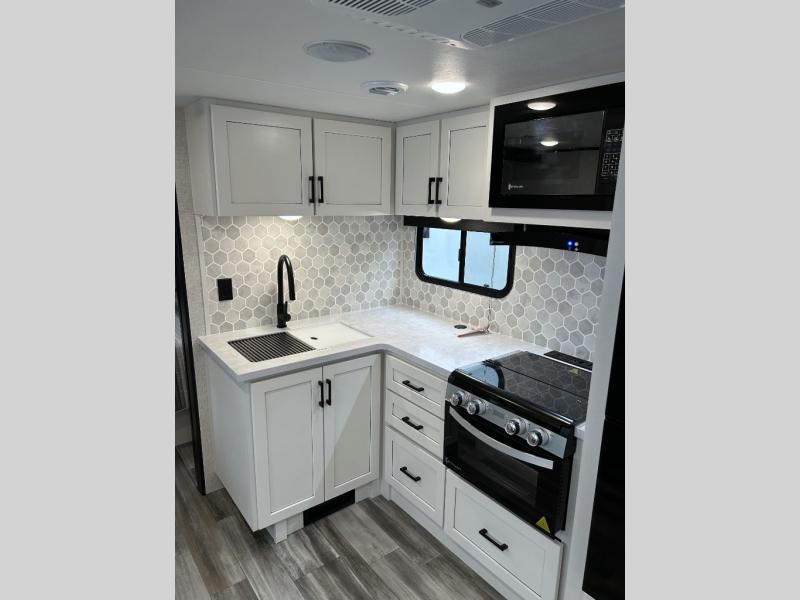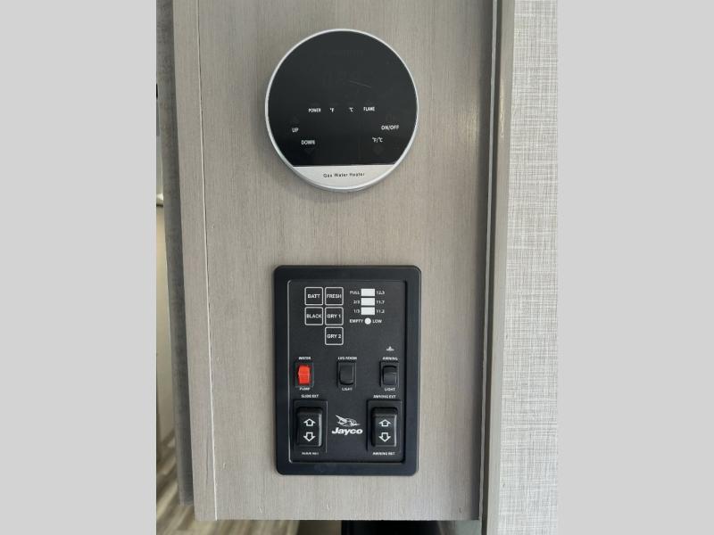 With any Jay Feather travel trailer by Jayco, you will enjoy lightweight towing, convenient exterior amenities, and at-home comforts inside! The Overlander 1 Solar Package included within the Jay Sport Package comes with a 200W solar panel and a 30-amp digital controller so you can enjoy some off-grid camping. There is also a modern graphics package with a dual-colored sidewall, LCI Solid Step fold-down aluminum tread steps on the main entry door, and Climate Shield 0 -100° F tested weather insulation package that will allow you to camp in all sorts of climates. The Customer Value Package will make time outdoors easier than ever with a power tongue jack and a Rock Solid stabilizer system, plus American-made nitro-filled Goodyear tires with self-adjusting electric brakes. More exterior features include a Keyed-Alike locking system, marine grade exterior speakers, a Magnum Truss roof system, and the list goes on! And we haven't even touched on the interior comforts, like the residential style seamless countertops and vinyl flooring throughout, decorative backsplash, handcrafted hardwood door/drawer fronts, and multiple USB charging ports to keep you going!