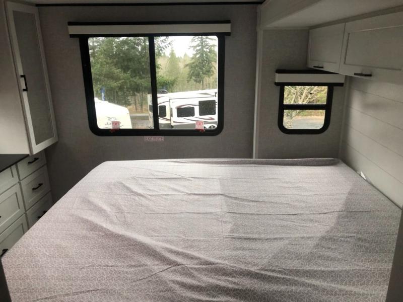 With any Jay Feather travel trailer by Jayco, you will enjoy lightweight towing, convenient exterior amenities, and at-home comforts inside! The Overlander 1 Solar Package included within the Jay Sport Package comes with a 200W solar panel and a 30-amp digital controller so you can enjoy some off-grid camping. There is also a modern graphics package with a dual-colored sidewall, LCI Solid Step fold-down aluminum tread steps on the main entry door, and Climate Shield 0 -100° F tested weather insulation package that will allow you to camp in all sorts of climates. The Customer Value Package will make time outdoors easier than ever with a power tongue jack and a Rock Solid stabilizer system, plus American-made nitro-filled Goodyear tires with self-adjusting electric brakes. More exterior features include a Keyed-Alike locking system, marine grade exterior speakers, a Magnum Truss roof system, and the list goes on! And we haven't even touched on the interior comforts, like the residential style seamless countertops and vinyl flooring throughout, decorative backsplash, handcrafted hardwood door/drawer fronts, and multiple USB charging ports to keep you going!