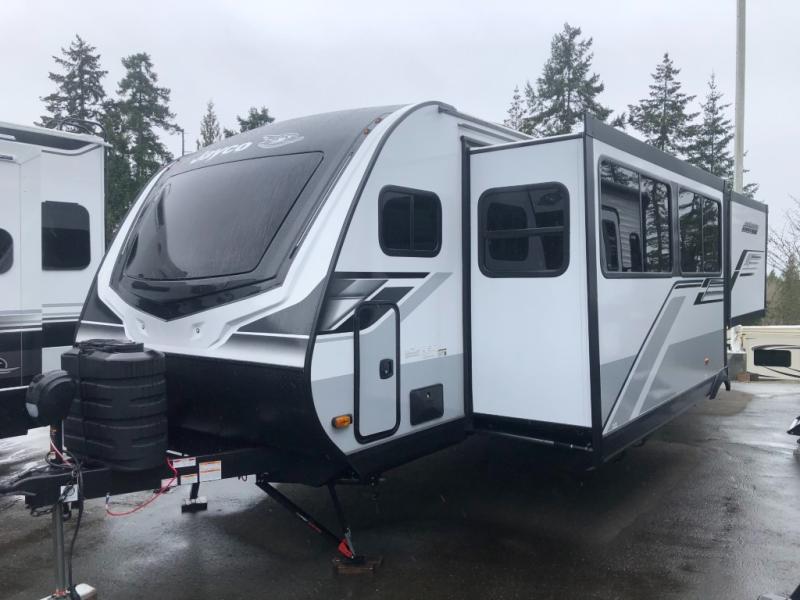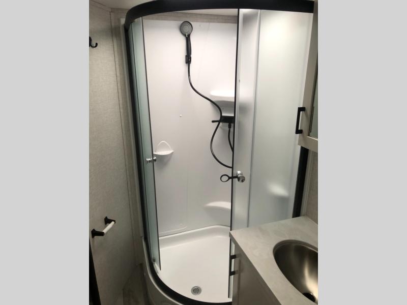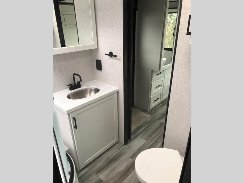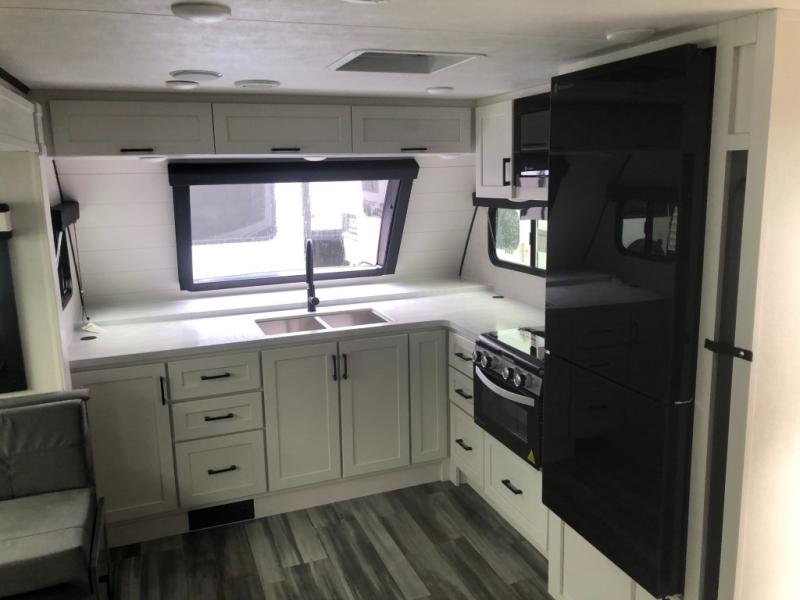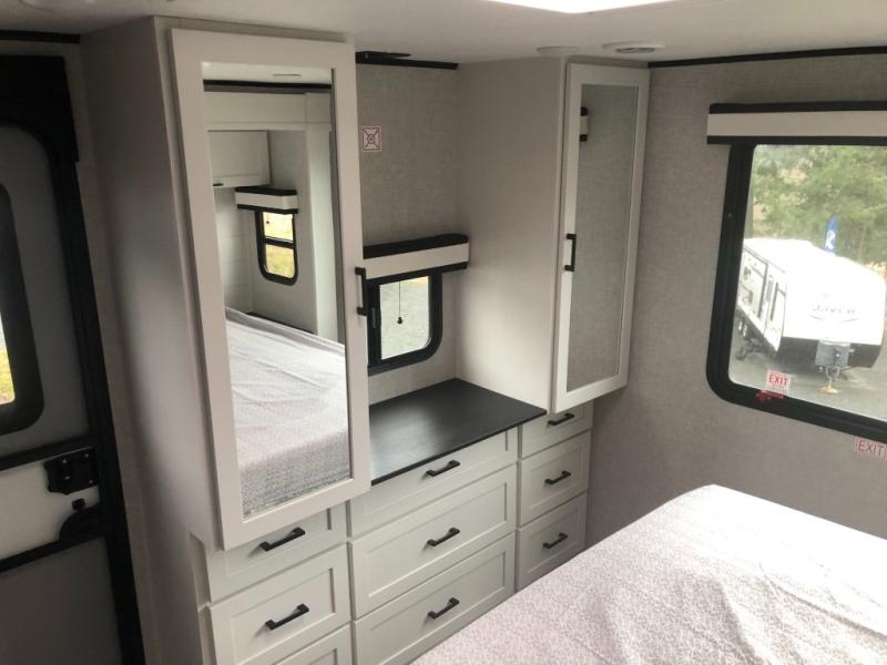 This front kitchen travel trailer will be perfect for camping trips to the lake or woods! The chef will appreciate ample counter space to prep meals plus an 11 cu. ft. 12V refrigerator to store leftovers. Your crew can dine at the booth dinette, then play a game after dinner is cleaned up. There is also a theater seat across from the entertainment center with an LED Smart TV to make it a movie night. A rear private bedroom is sure to make you feel right at home with a queen bed, dual wardrobes, and a dresser to keep your things organized. You'll also find one of the dual entry doors here for convenience!