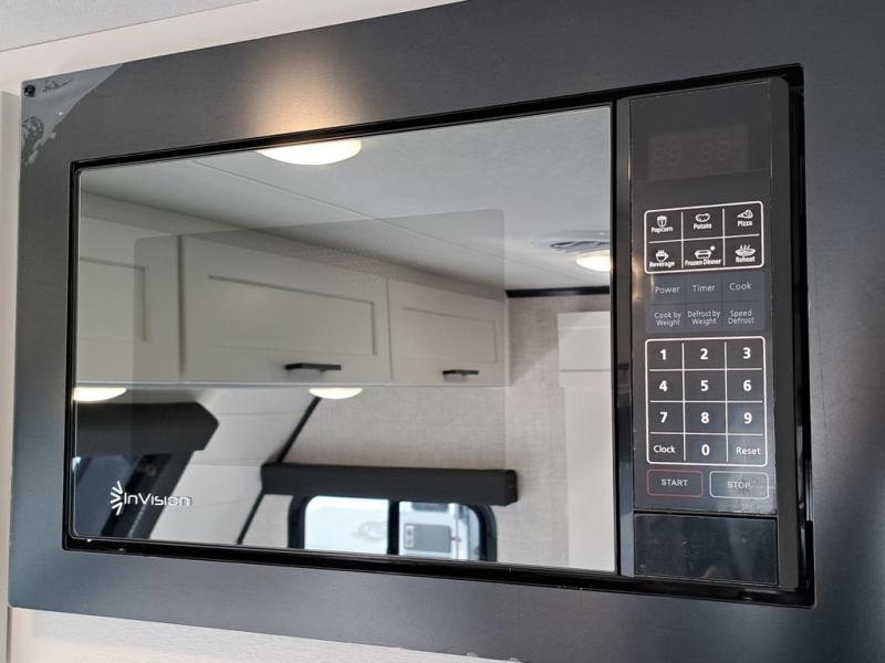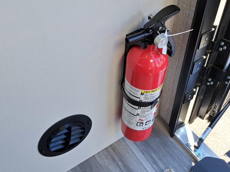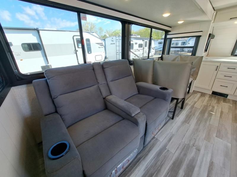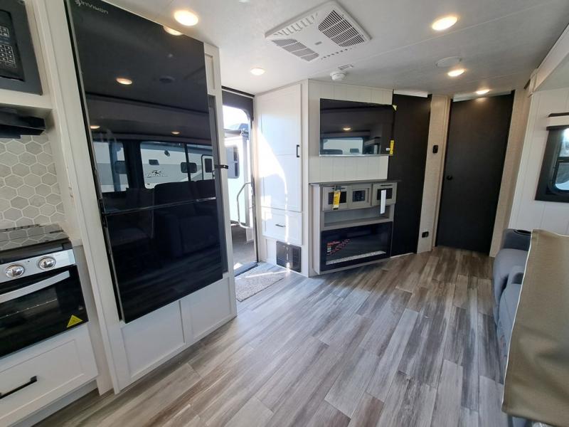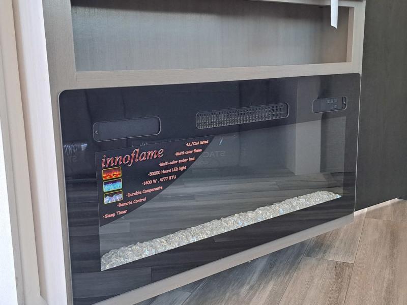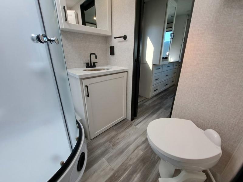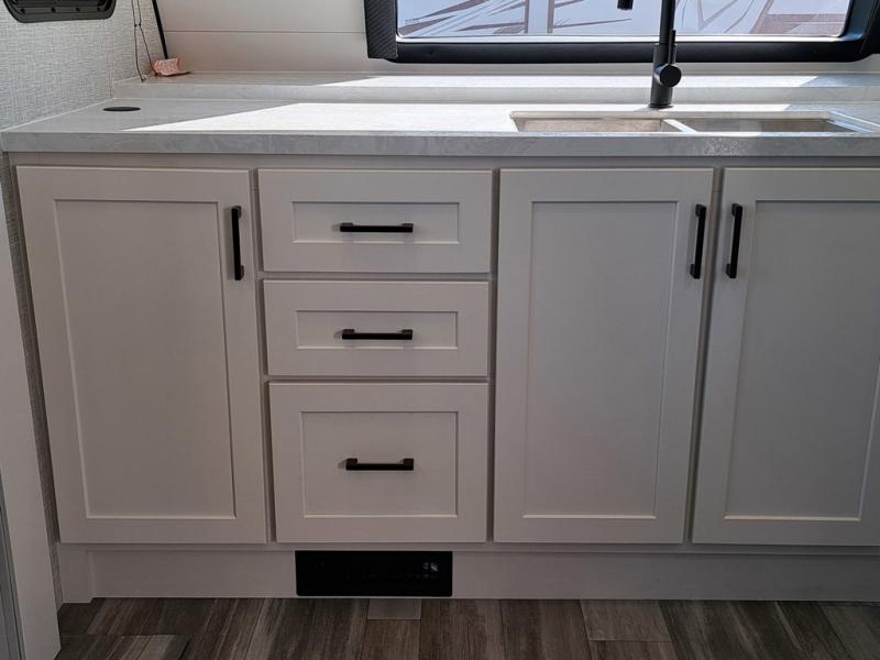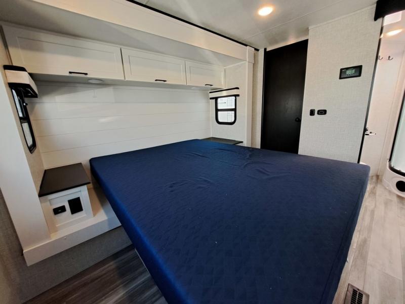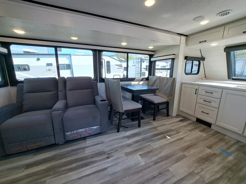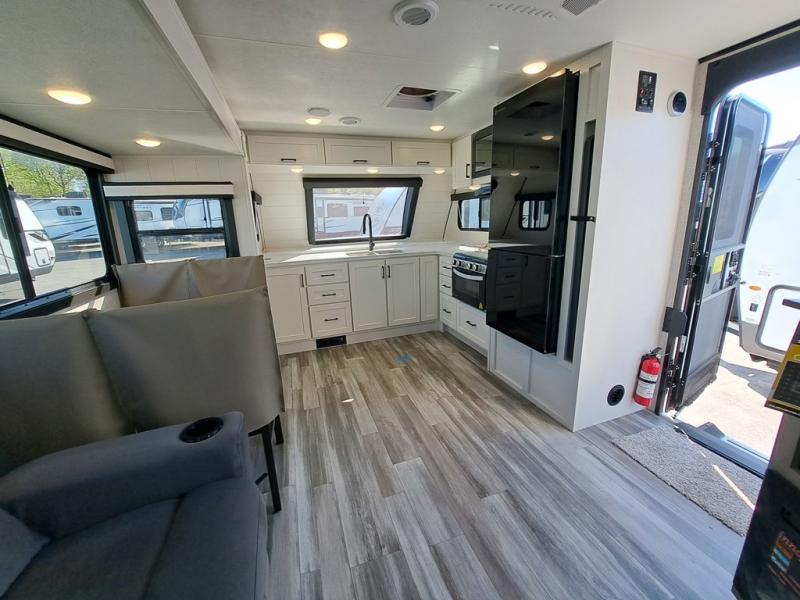 This front kitchen travel trailer will be perfect for camping trips to the lake or woods! The chef will appreciate ample counter space to prep meals plus an 11 cu. ft. 12V refrigerator to store leftovers. Your crew can dine at the booth dinette, then play a game after dinner is cleaned up. There is also a theater seat across from the entertainment center with an LED Smart TV to make it a movie night. A rear private bedroom is sure to make you feel right at home with a queen bed, dual wardrobes, and a dresser to keep your things organized. You'll also find one of the dual entry doors here for convenience!