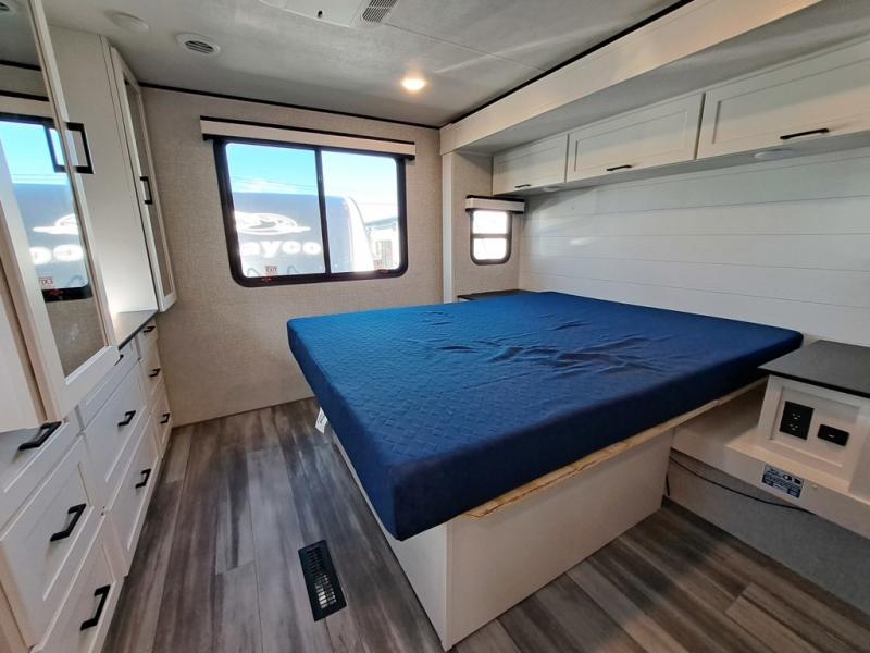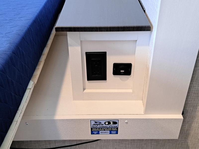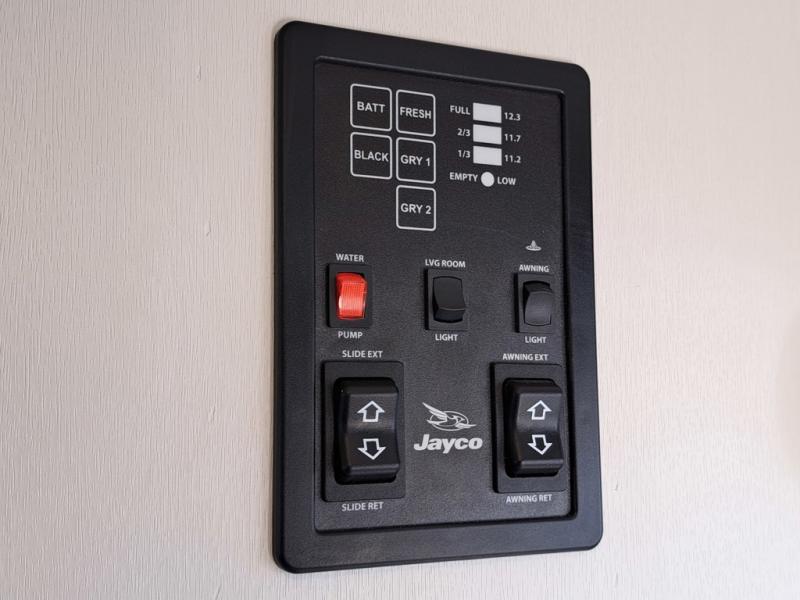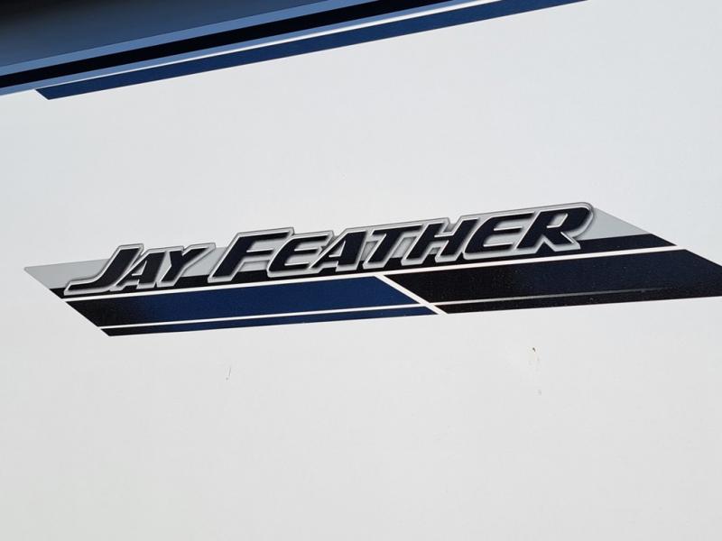 With any Jay Feather travel trailer by Jayco, you will enjoy lightweight towing, convenient exterior amenities, and at-home comforts inside! The Overlander 1 Solar Package included within the Jay Sport Package comes with a 200W solar panel and a 30-amp digital controller so you can enjoy some off-grid camping. There is also a modern graphics package with a dual-colored sidewall, LCI Solid Step fold-down aluminum tread steps on the main entry door, and Climate Shield 0 -100° F tested weather insulation package that will allow you to camp in all sorts of climates. The Customer Value Package will make time outdoors easier than ever with a power tongue jack and a Rock Solid stabilizer system, plus American-made nitro-filled Goodyear tires with self-adjusting electric brakes. More exterior features include a Keyed-Alike locking system, marine grade exterior speakers, a Magnum Truss roof system, and the list goes on! And we haven't even touched on the interior comforts, like the residential style seamless countertops and vinyl flooring throughout, decorative backsplash, handcrafted hardwood door/drawer fronts, and multiple USB charging ports to keep you going!