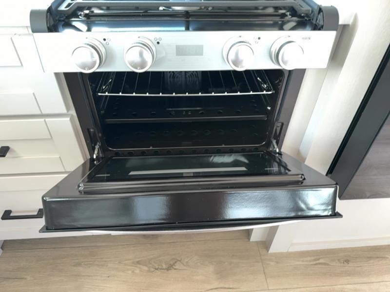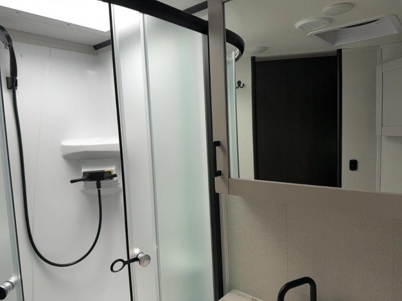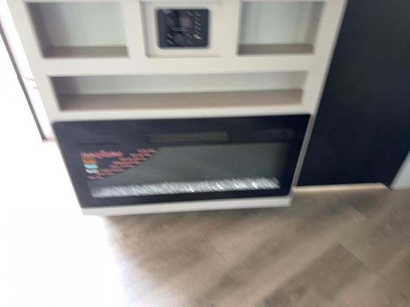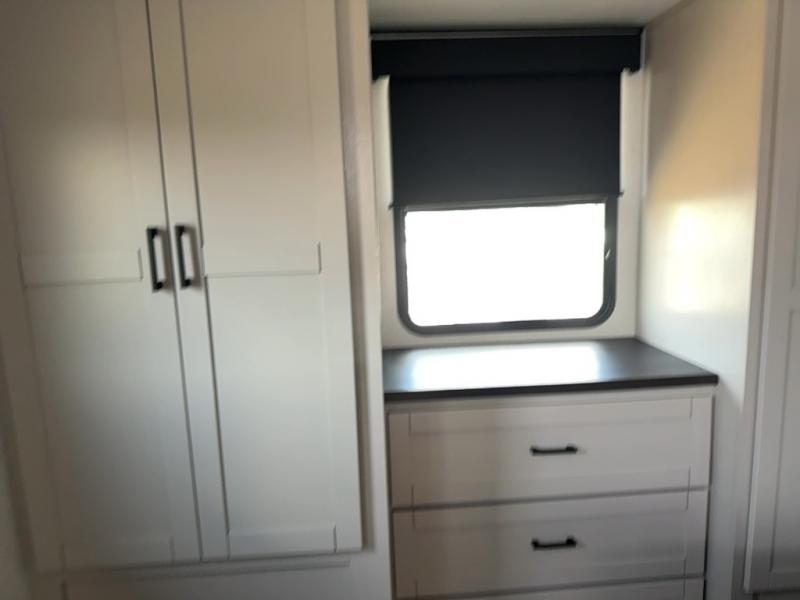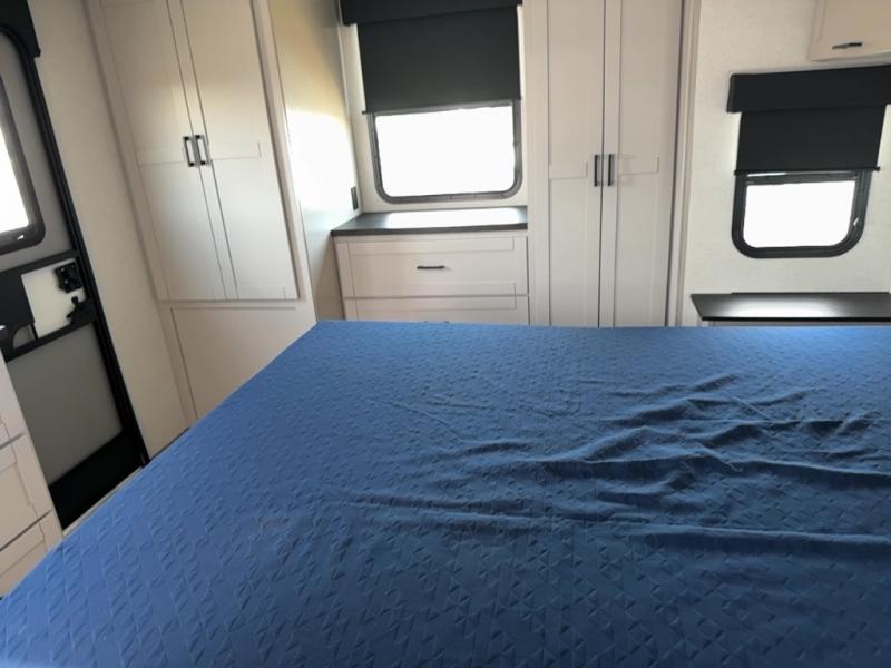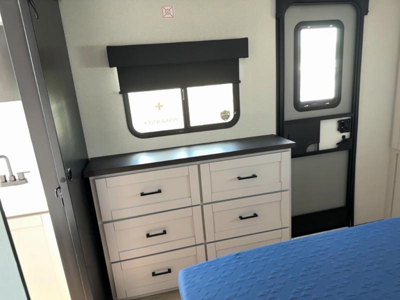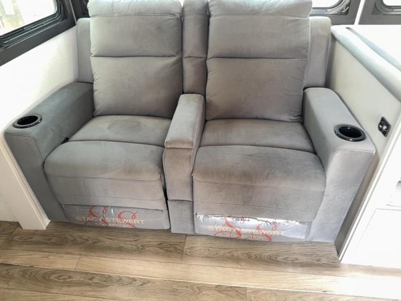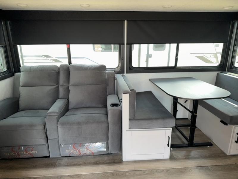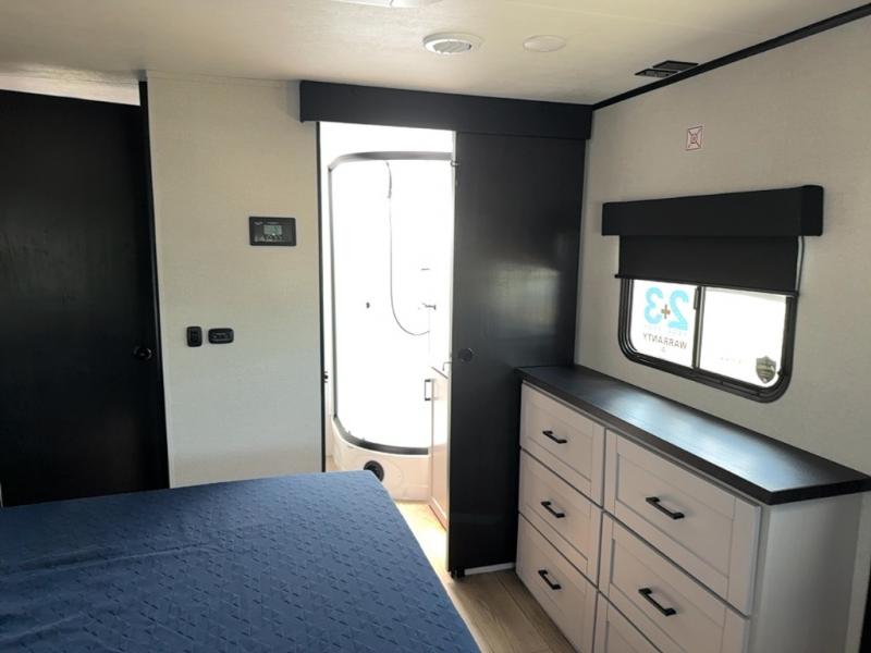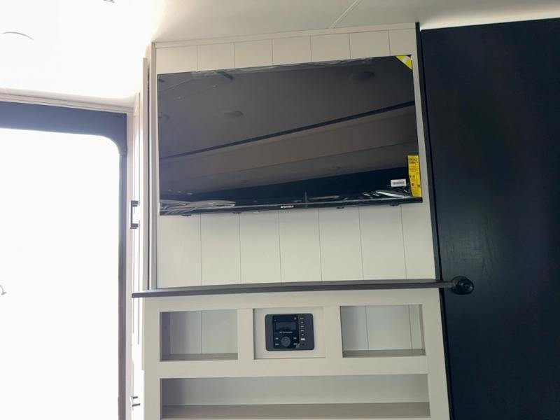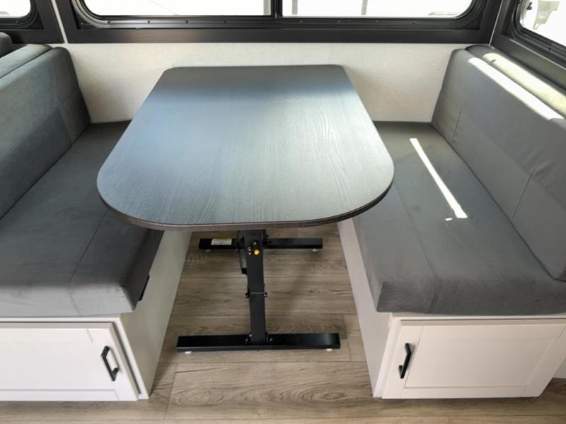 This front kitchen travel trailer will be perfect for camping trips to the lake or woods! The chef will appreciate ample counter space to prep meals plus an 11 cu. ft. 12V refrigerator to store leftovers. Your crew can dine at the booth dinette, then play a game after dinner is cleaned up. There is also a theater seat across from the entertainment center with an LED Smart TV to make it a movie night. A rear private bedroom is sure to make you feel right at home with a queen bed, dual wardrobes, and a dresser to keep your things organized. You'll also find one of the dual entry doors here for convenience!