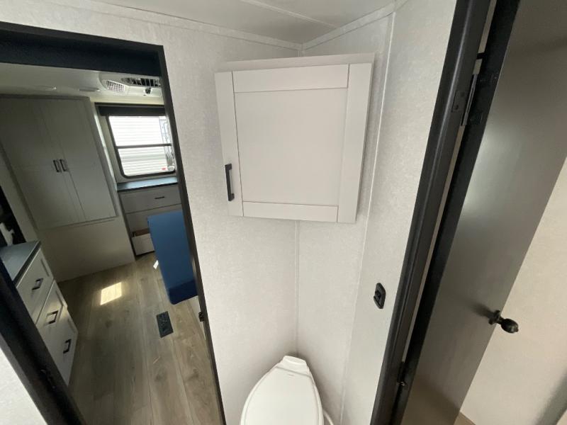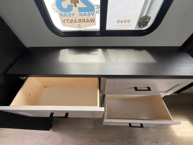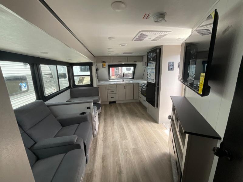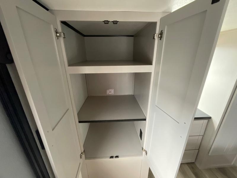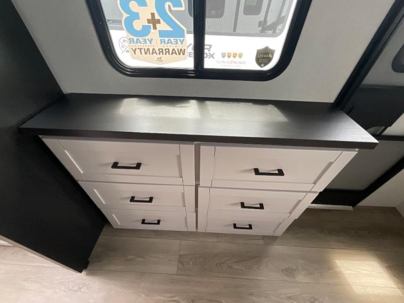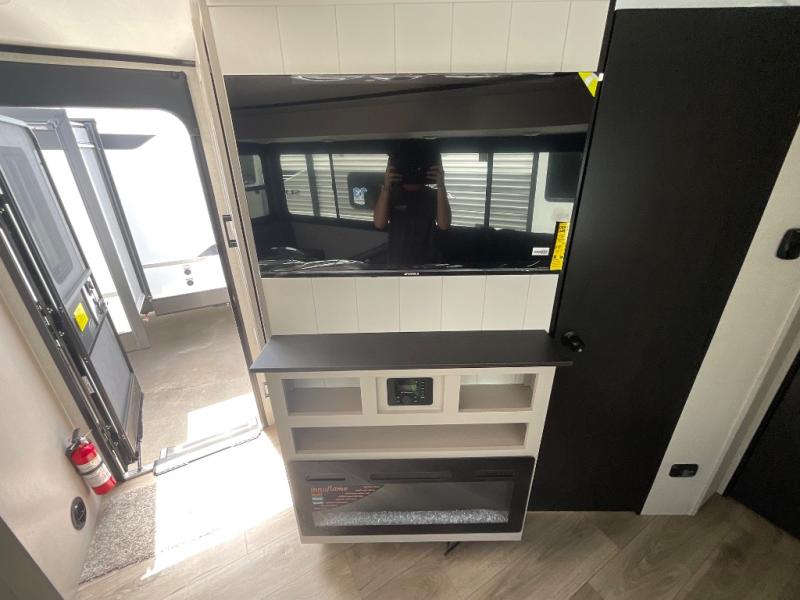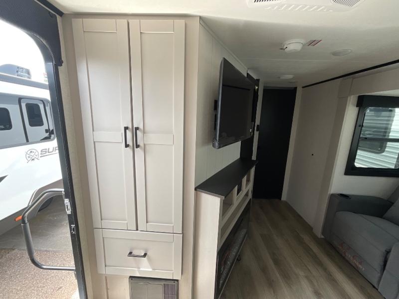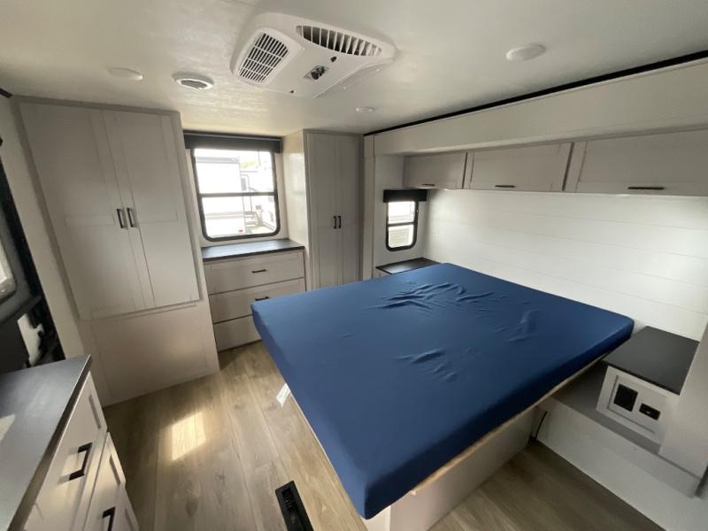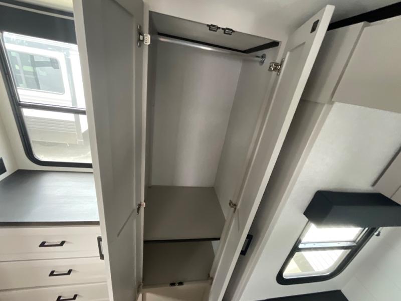 This front kitchen travel trailer will be perfect for camping trips to the lake or woods! The chef will appreciate ample counter space to prep meals plus an 11 cu. ft. 12V refrigerator to store leftovers. Your crew can dine at the booth dinette, then play a game after dinner is cleaned up. There is also a theater seat across from the entertainment center with an LED Smart TV to make it a movie night. A rear private bedroom is sure to make you feel right at home with a queen bed, dual wardrobes, and a dresser to keep your things organized. You'll also find one of the dual entry doors here for convenience!