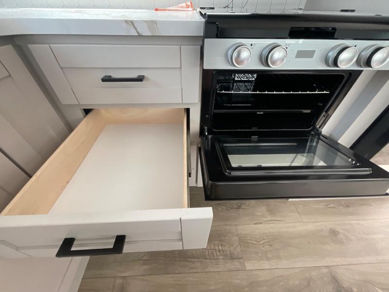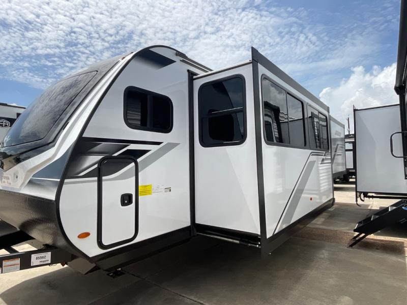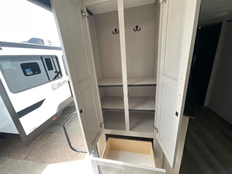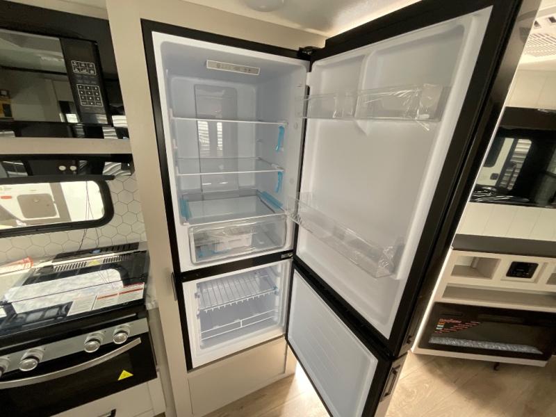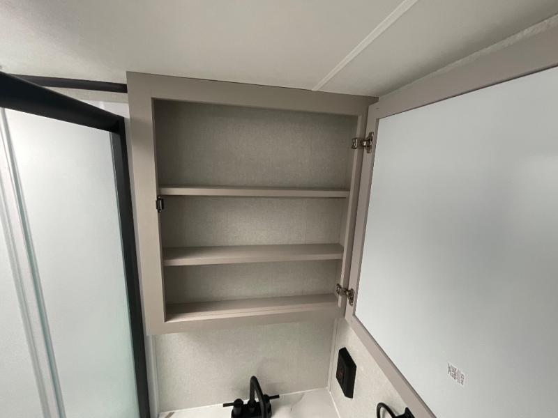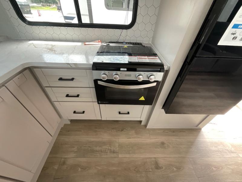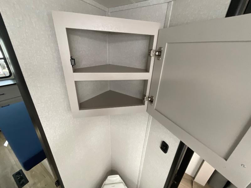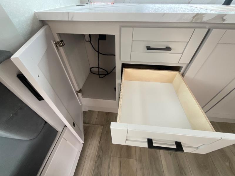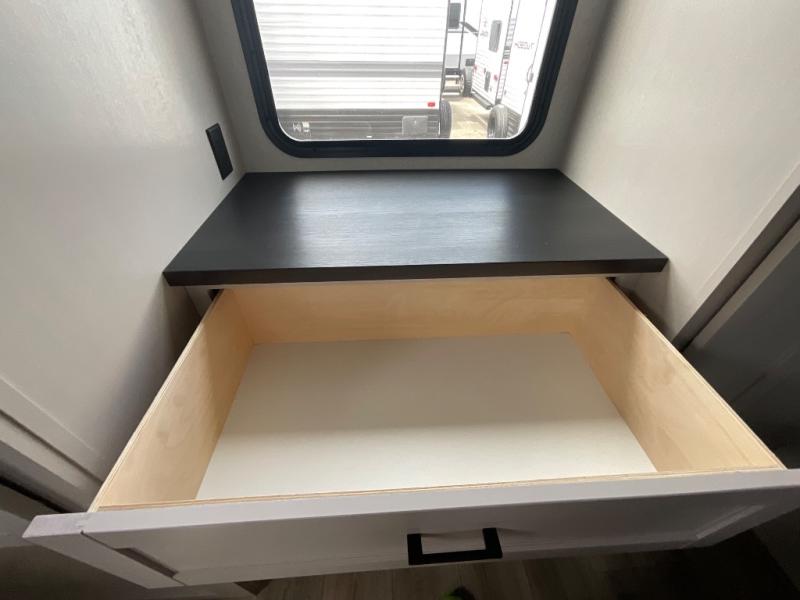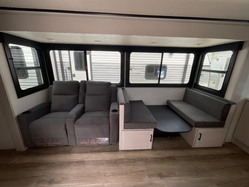 This front kitchen travel trailer will be perfect for camping trips to the lake or woods! The chef will appreciate ample counter space to prep meals plus an 11 cu. ft. 12V refrigerator to store leftovers. Your crew can dine at the booth dinette, then play a game after dinner is cleaned up. There is also a theater seat across from the entertainment center with an LED Smart TV to make it a movie night. A rear private bedroom is sure to make you feel right at home with a queen bed, dual wardrobes, and a dresser to keep your things organized. You'll also find one of the dual entry doors here for convenience!