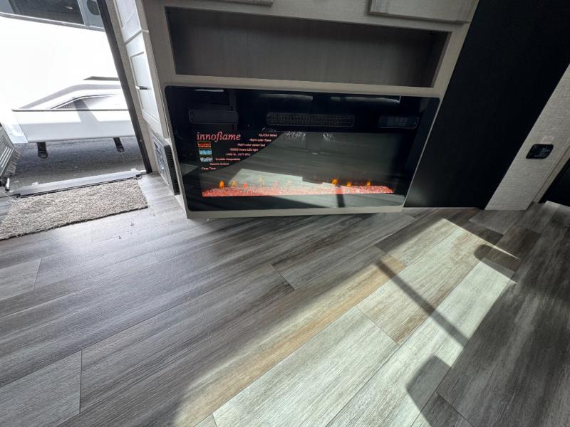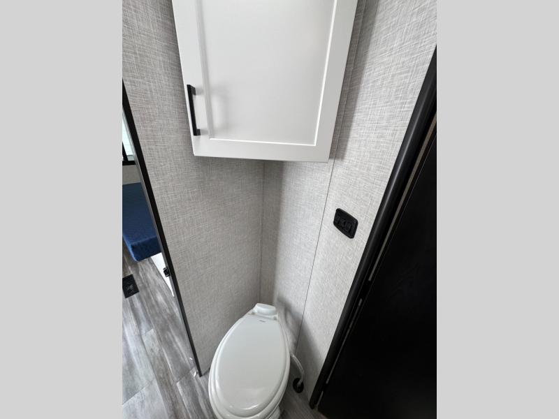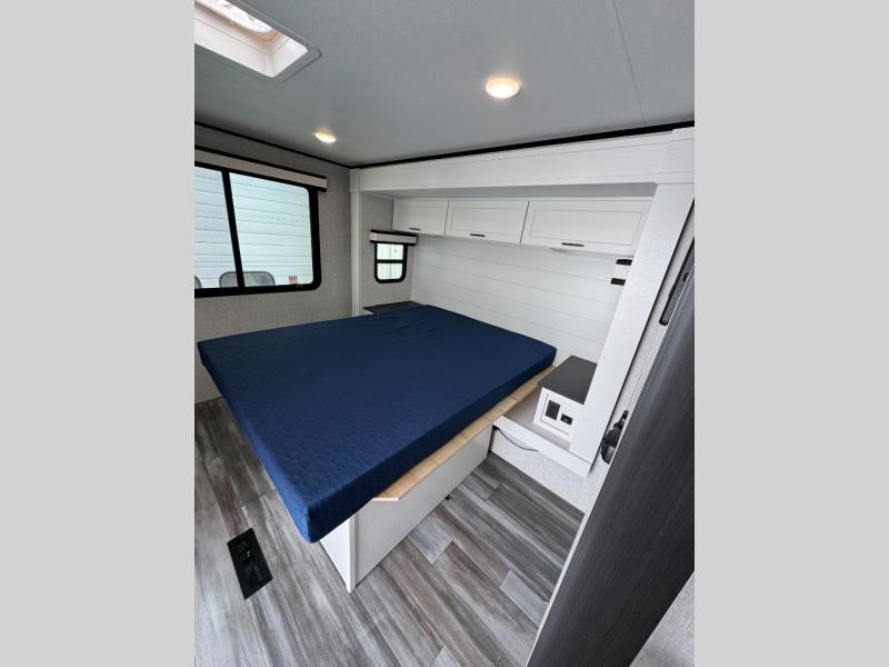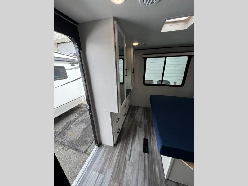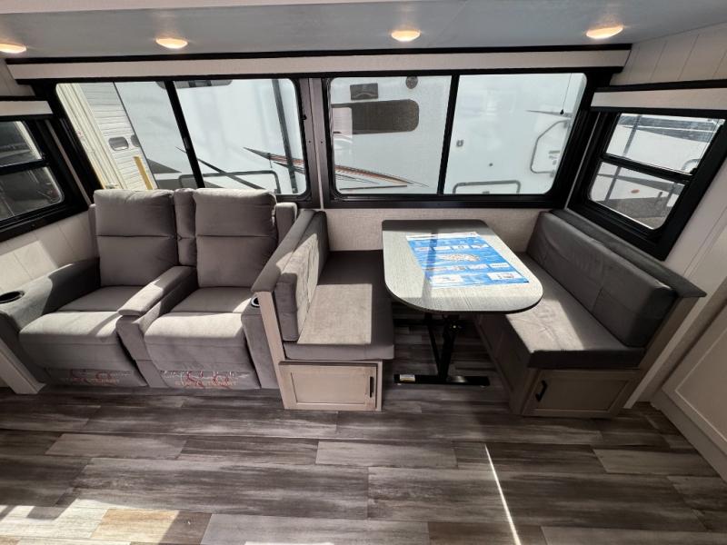 This front kitchen travel trailer will be perfect for camping trips to the lake or woods! The chef will appreciate ample counter space to prep meals plus an 11 cu. ft. 12V refrigerator to store leftovers. Your crew can dine at the booth dinette, then play a game after dinner is cleaned up. There is also a theater seat across from the entertainment center with an LED Smart TV to make it a movie night. A rear private bedroom is sure to make you feel right at home with a queen bed, dual wardrobes, and a dresser to keep your things organized. You'll also find one of the dual entry doors here for convenience!