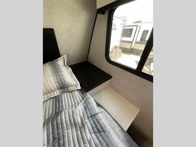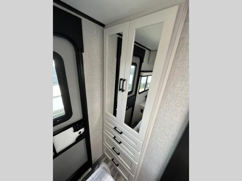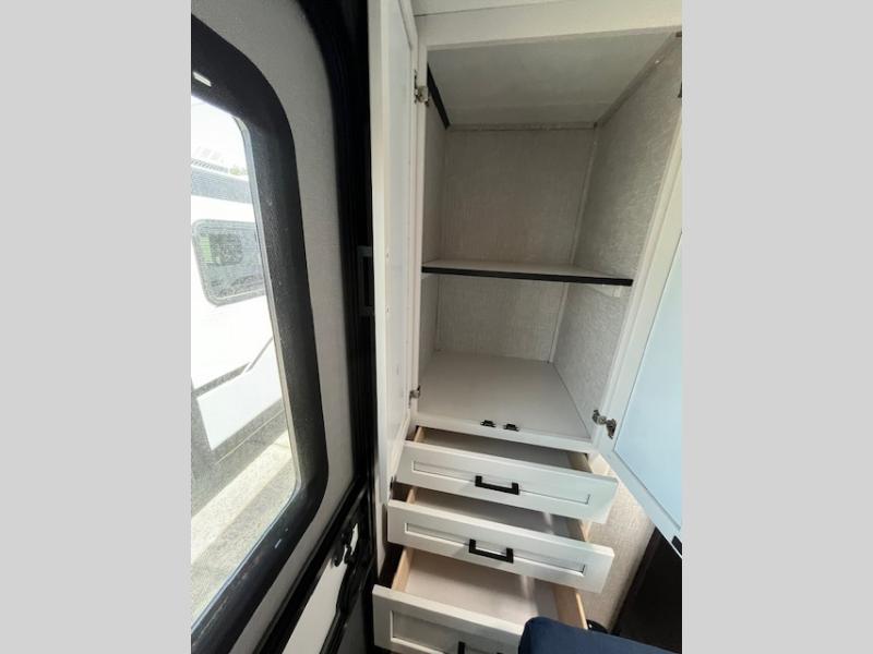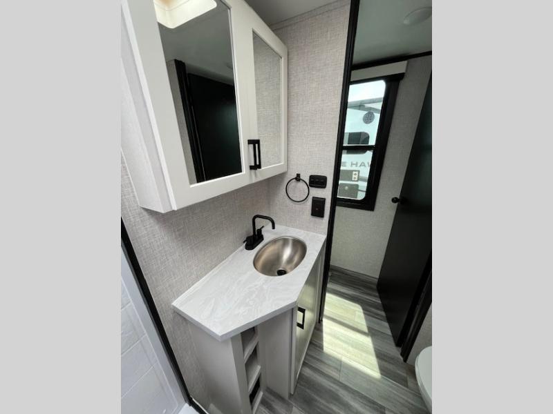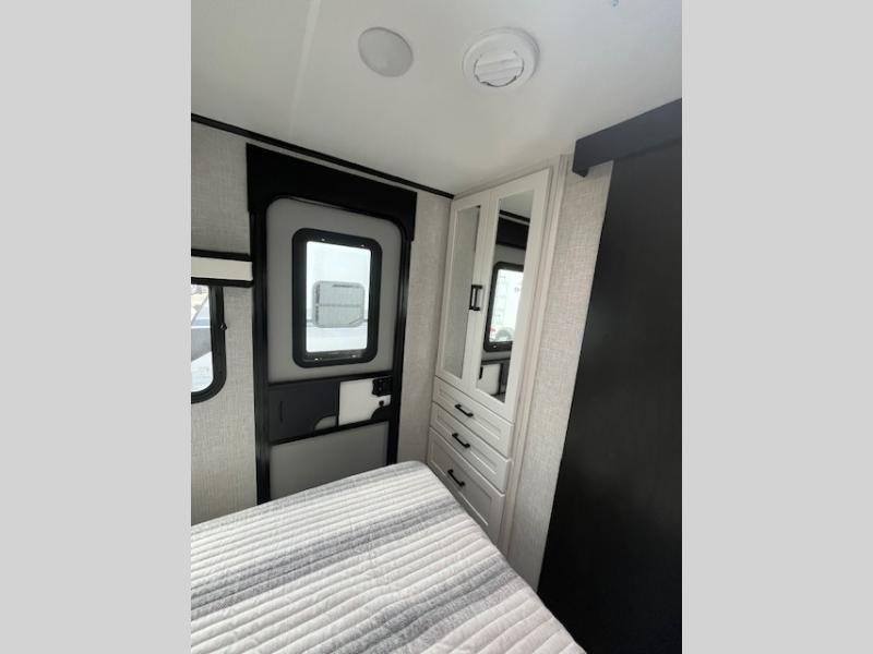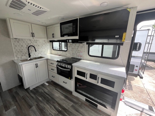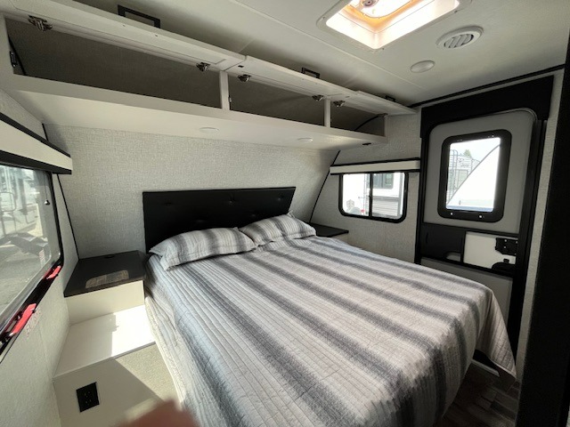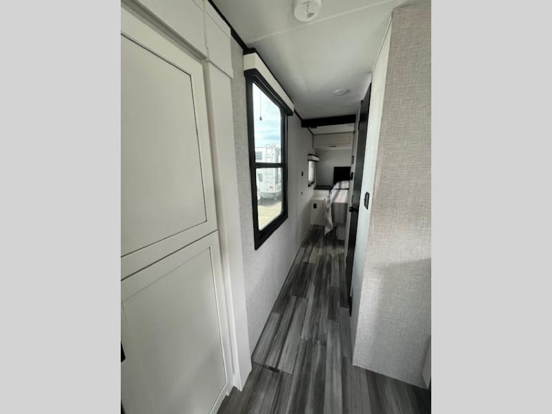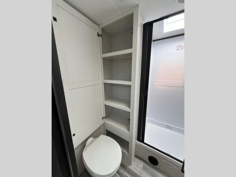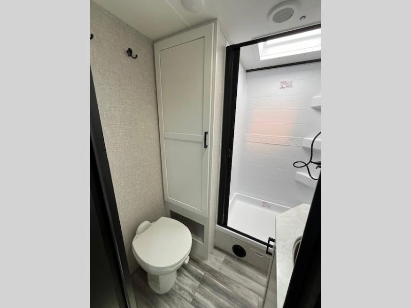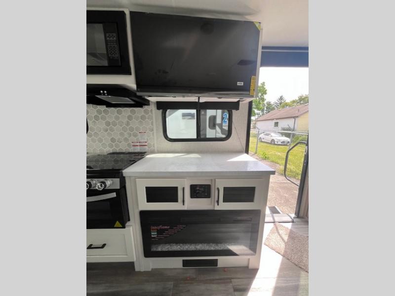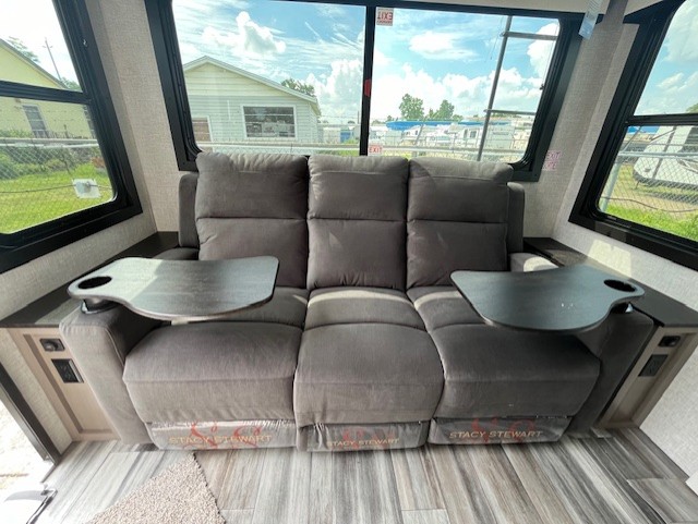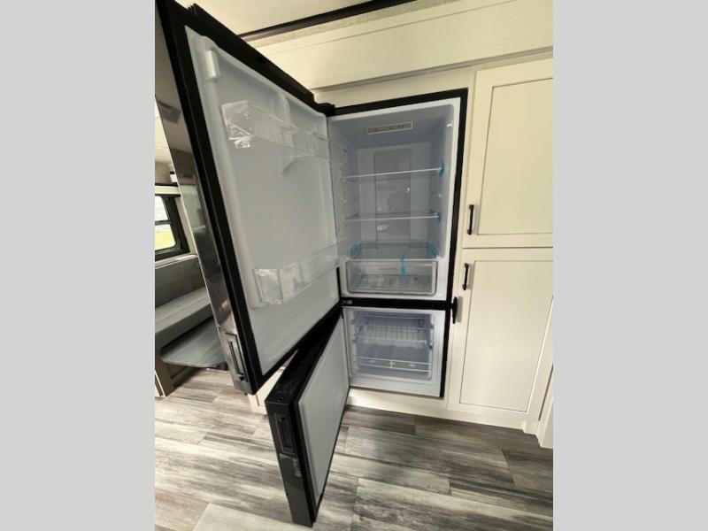 You will experience a smooth flow of traffic in and out of this travel trailer with dual entry doors! The front private bedroom has one of these entrances and a 60" x 80" queen bed with wardrobes on either side to keep your clothes looking nice. The full bathroom has a shower for you to freshen up in each morning and a linen closet to keep your towels close. You will appreciate all of the countertop space to prepare your meal and cook it on the three burner cooktop then enjoy it at the booth dinette. If there happen to be any leftovers then you can store them inside the 11 cu. ft. 12V refrigerator. And the rear theater seating comes with trays to set your bowl of popcorn or drink on!