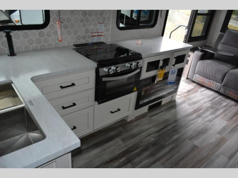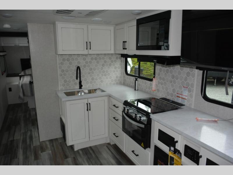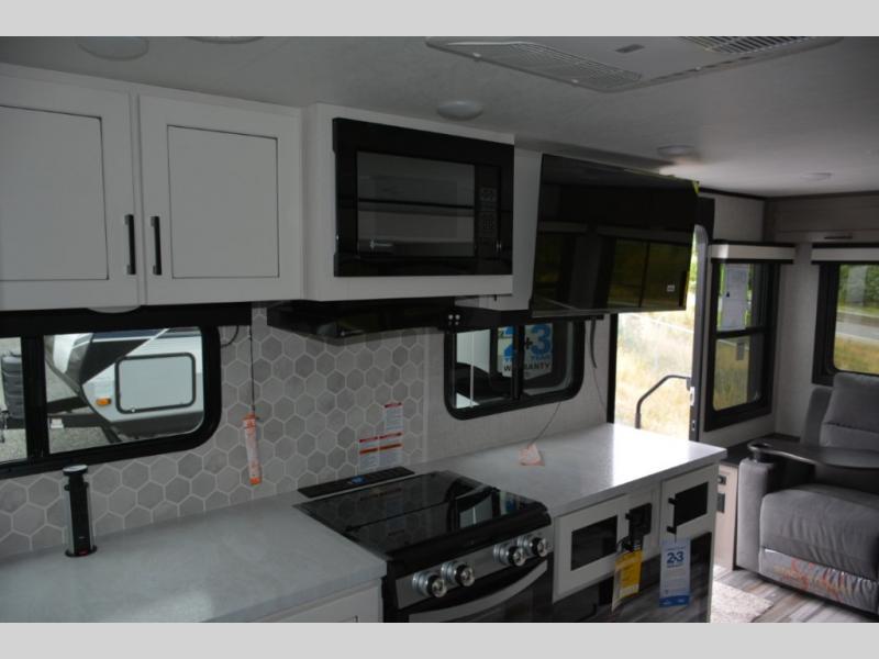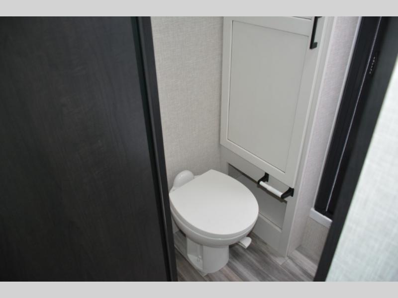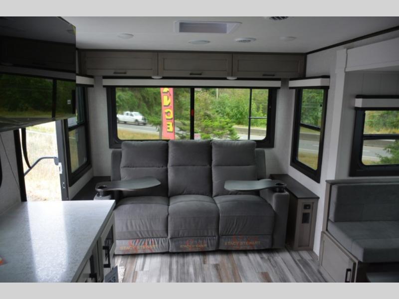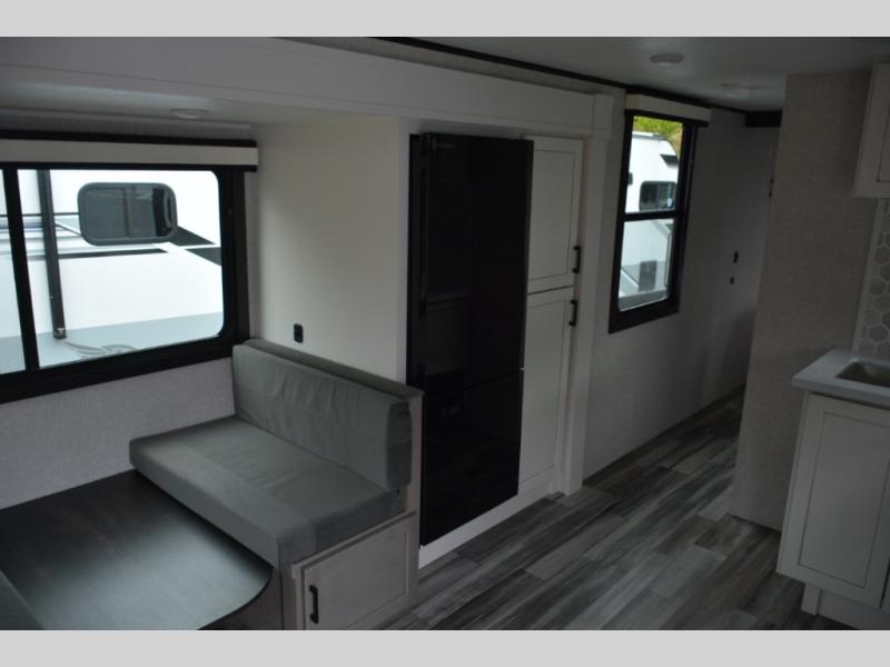You will experience a smooth flow of traffic in and out of this travel trailer with dual entry doors! The front private bedroom has one of these entrances and a 60" x 80" queen bed with wardrobes on either side to keep your clothes looking nice. The full bathroom has a shower for you to freshen up in each morning and a linen closet to keep your towels close. You will appreciate all of the countertop space to prepare your meal and cook it on the three burner cooktop then enjoy it at the booth dinette. If there happen to be any leftovers then you can store them inside the 11 cu. ft. 12V refrigerator. And the rear theater seating comes with trays to set your bowl of popcorn or drink on!