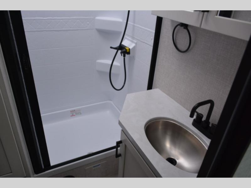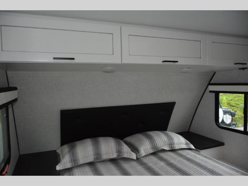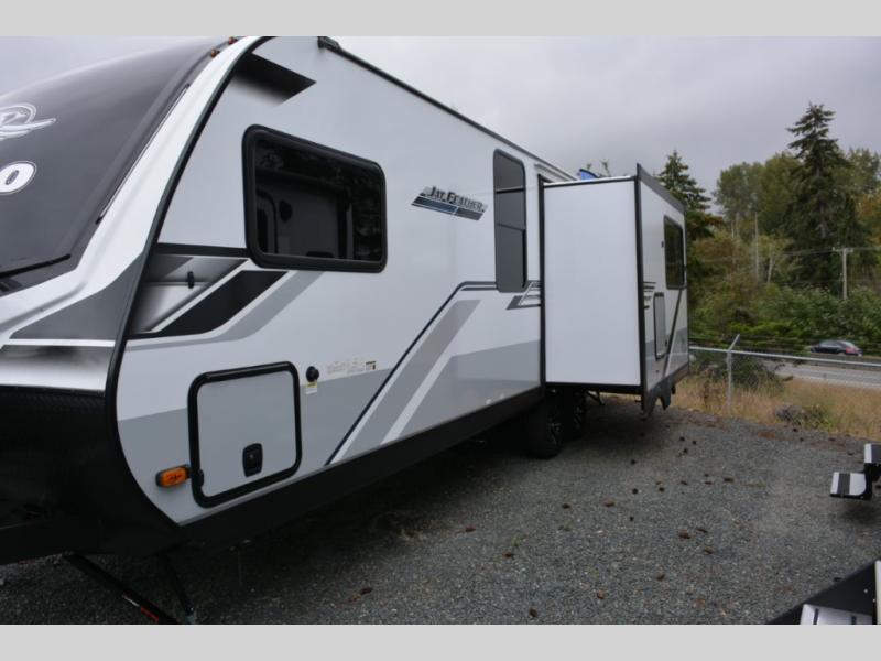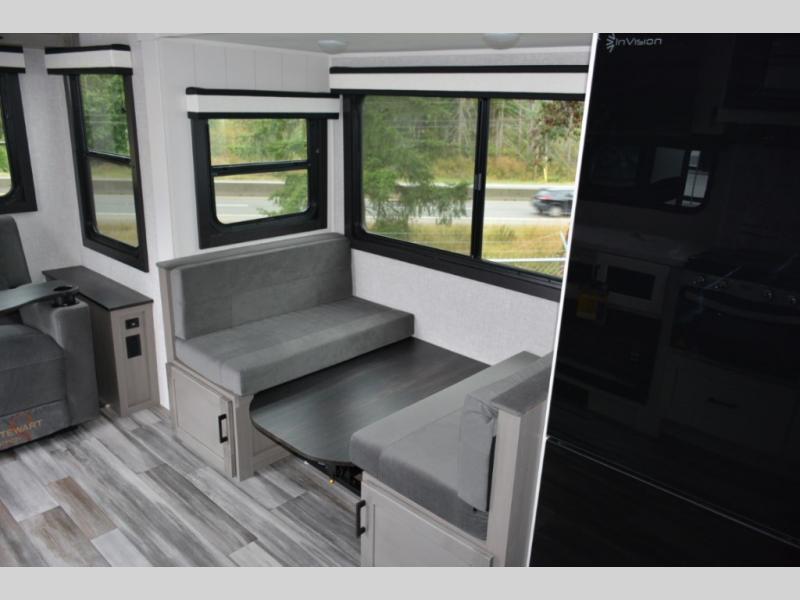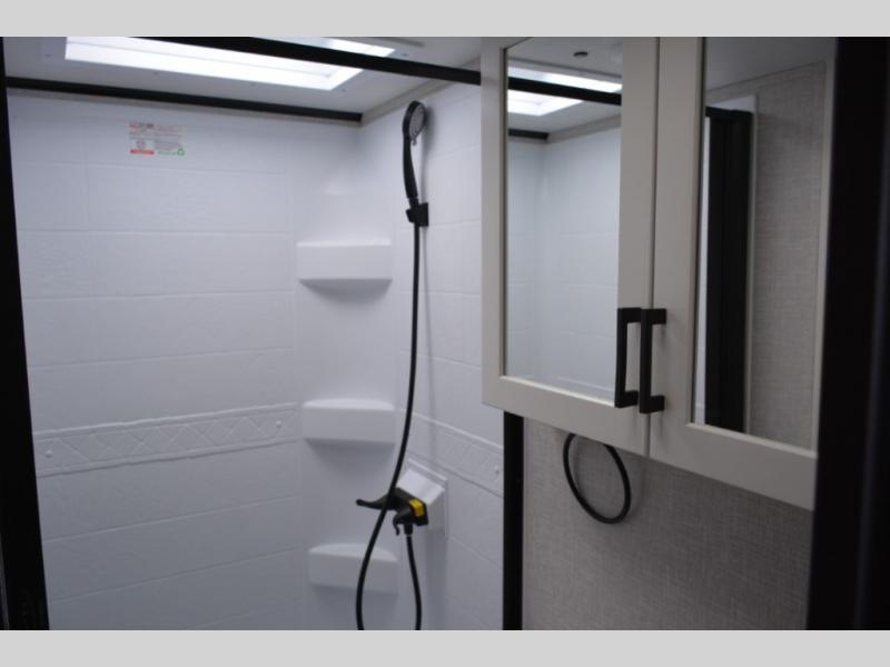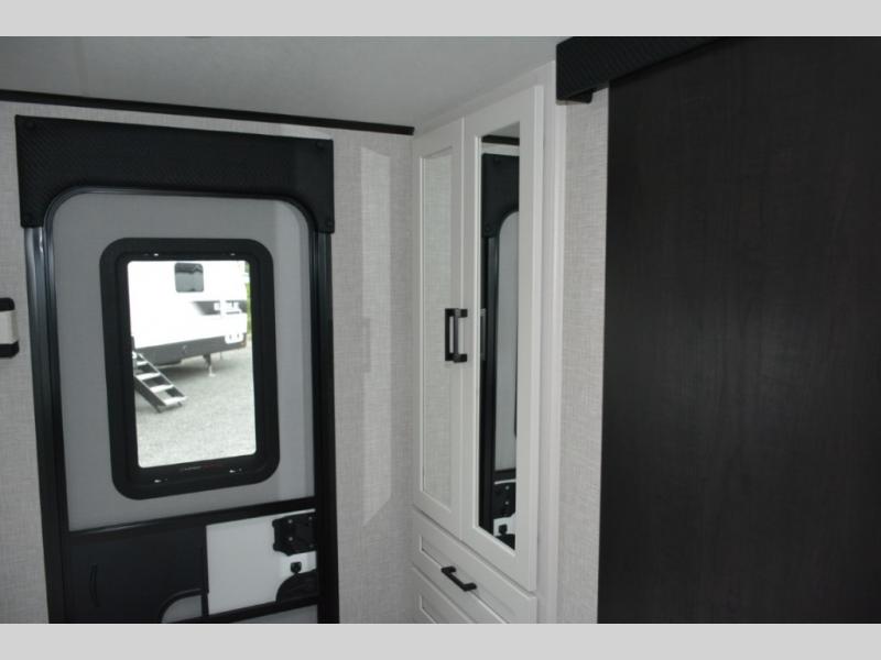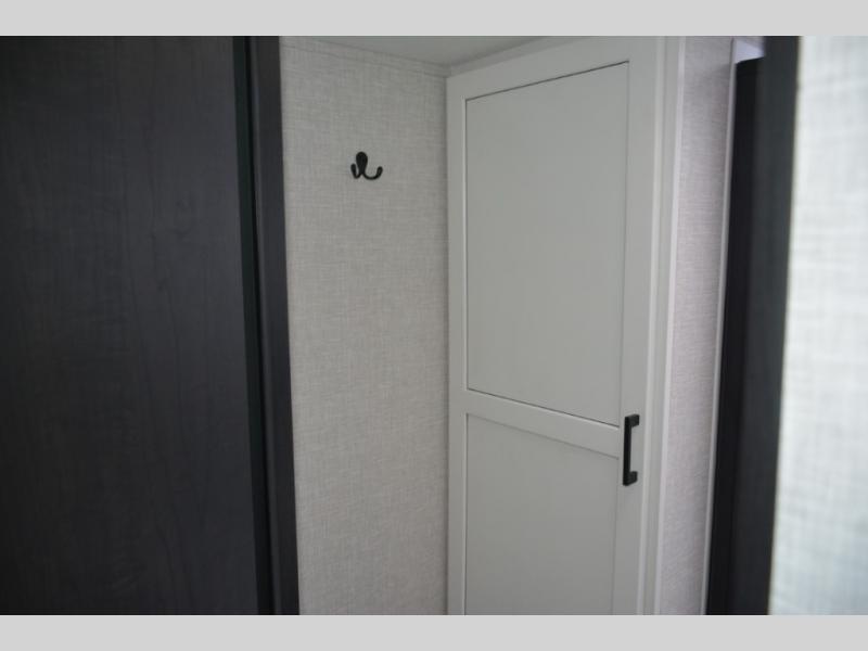 You will experience a smooth flow of traffic in and out of this travel trailer with dual entry doors! The front private bedroom has one of these entrances and a 60" x 80" queen bed with wardrobes on either side to keep your clothes looking nice. The full bathroom has a shower for you to freshen up in each morning and a linen closet to keep your towels close. You will appreciate all of the countertop space to prepare your meal and cook it on the three burner cooktop then enjoy it at the booth dinette. If there happen to be any leftovers then you can store them inside the 11 cu. ft. 12V refrigerator. And the rear theater seating comes with trays to set your bowl of popcorn or drink on!