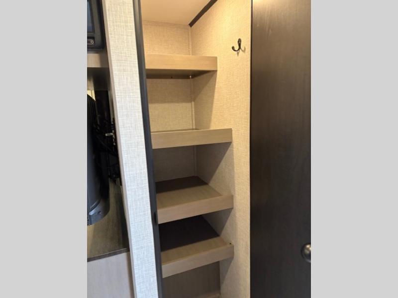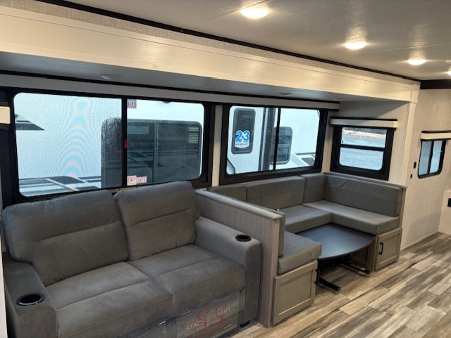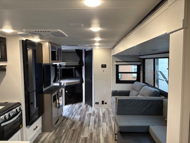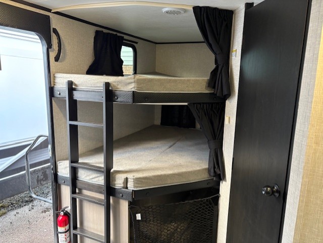 Get out and experience new campgrounds with this spacious trailer that offers a slide out tri-fold sofa and U-shaped dinette giving you dining, relaxing and sleeping space as well as more interior floor space to move from the front to the back. There is even an entertainment center here and an optional fireplace to make it more cozy. The cook will love the choice of making meals inside with full amenities or on the outside kitchen when relaxing under the 21' power awning with LED lights. You will appreciate your own space in the front private bedroom with a queen bed, dual wardrobes and nightstands, plus one of the dual entry doors. This model also includes double-size bunks with flip-up storage and a kayak door to easily pack in camp gear!
