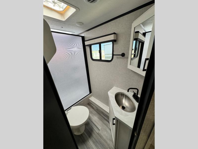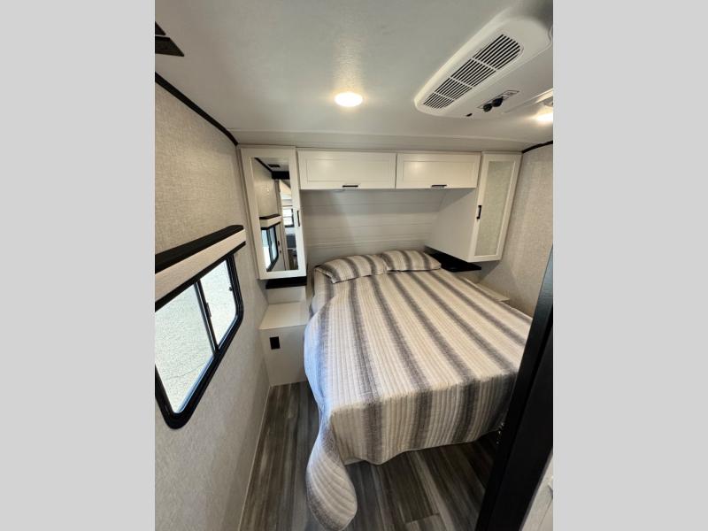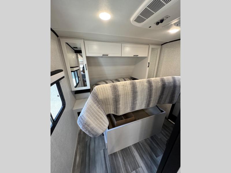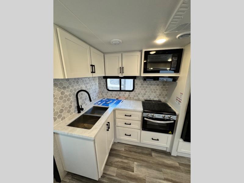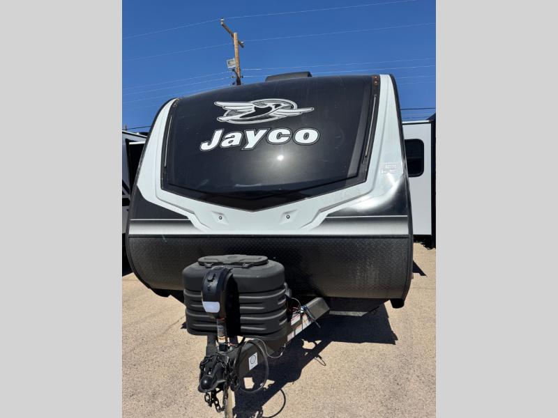 With any Jay Feather travel trailer by Jayco, you will enjoy lightweight towing, convenient exterior amenities, and at-home comforts inside! The Overlander 1 Solar Package included within the Jay Sport Package comes with a 200W solar panel and a 30-amp digital controller so you can enjoy some off-grid camping. There is also a modern graphics package with a dual-colored sidewall, LCI Solid Step fold-down aluminum tread steps on the main entry door, and Climate Shield 0 -100° F tested weather insulation package that will allow you to camp in all sorts of climates. The Customer Value Package will make time outdoors easier than ever with a power tongue jack and a Rock Solid stabilizer system, plus American-made nitro-filled Goodyear tires with self-adjusting electric brakes. More exterior features include a Keyed-Alike locking system, marine grade exterior speakers, a Magnum Truss roof system, and the list goes on! And we haven't even touched on the interior comforts, like the residential style seamless countertops and vinyl flooring throughout, decorative backsplash, handcrafted hardwood door/drawer fronts, and multiple USB charging ports to keep you going!
