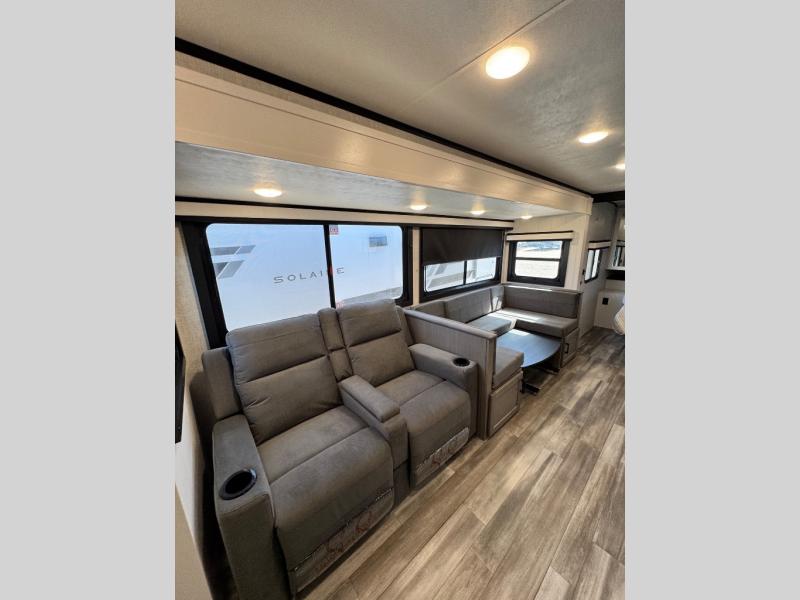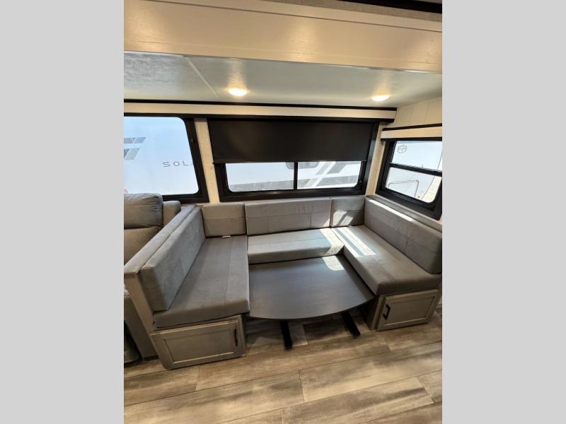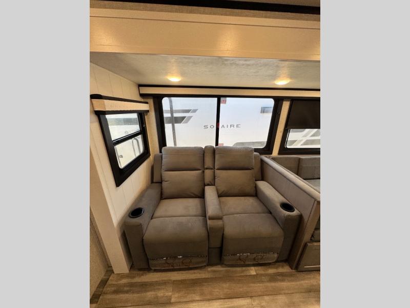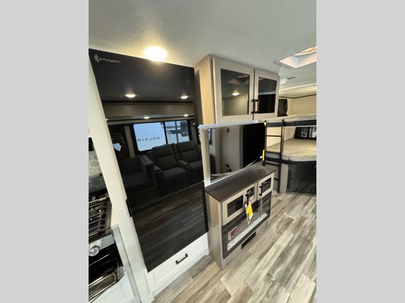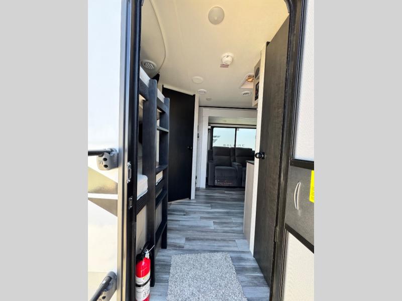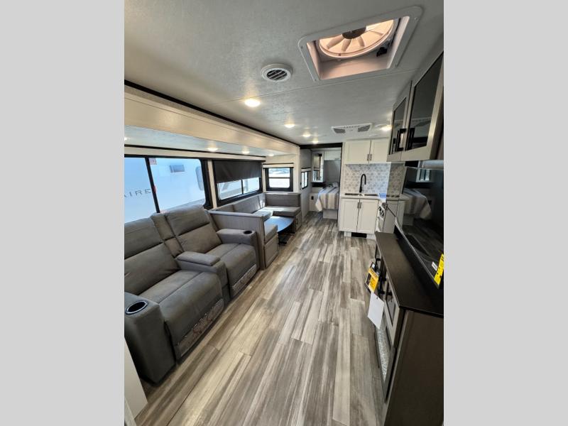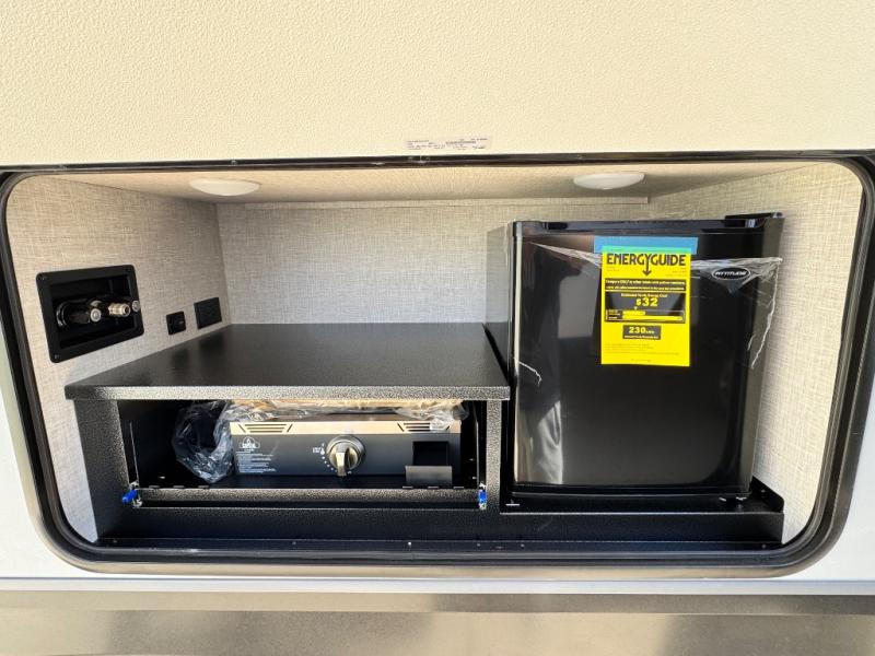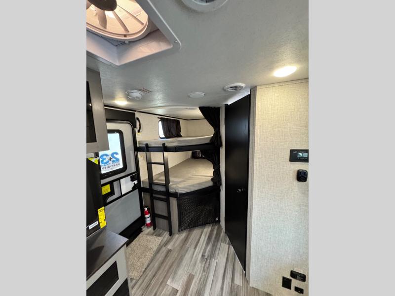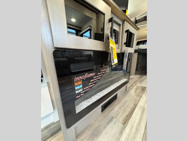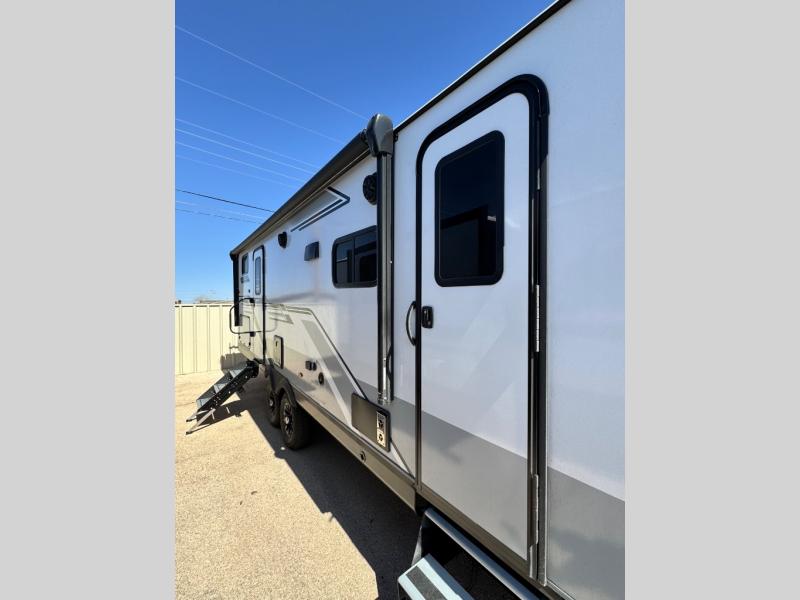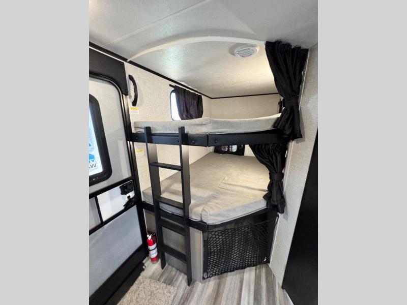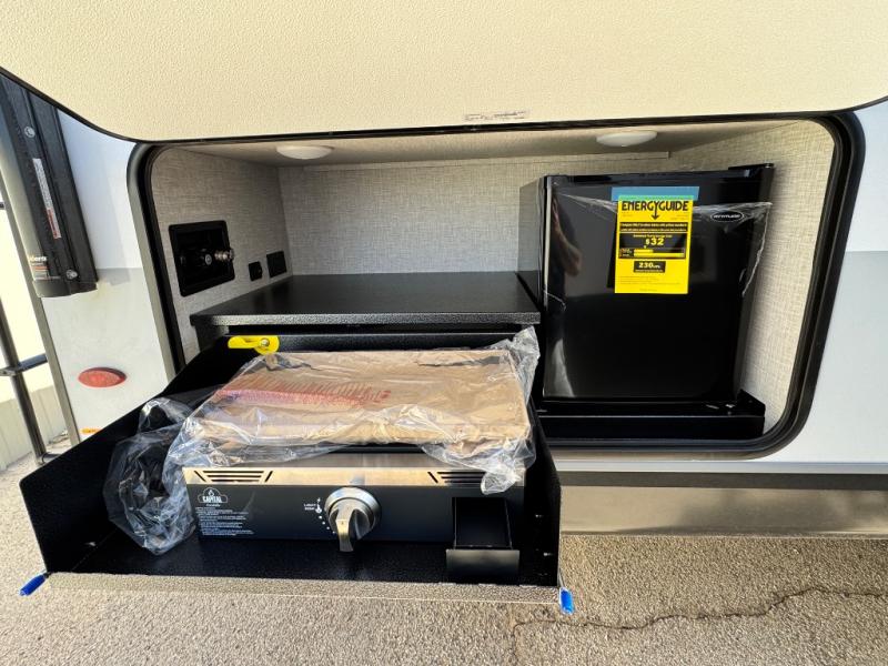 Get out and experience new campgrounds with this spacious trailer that offers a slide out tri-fold sofa and U-shaped dinette giving you dining, relaxing and sleeping space as well as more interior floor space to move from the front to the back. There is even an entertainment center here and an optional fireplace to make it more cozy. The cook will love the choice of making meals inside with full amenities or on the outside kitchen when relaxing under the 21' power awning with LED lights. You will appreciate your own space in the front private bedroom with a queen bed, dual wardrobes and nightstands, plus one of the dual entry doors. This model also includes double-size bunks with flip-up storage and a kayak door to easily pack in camp gear!