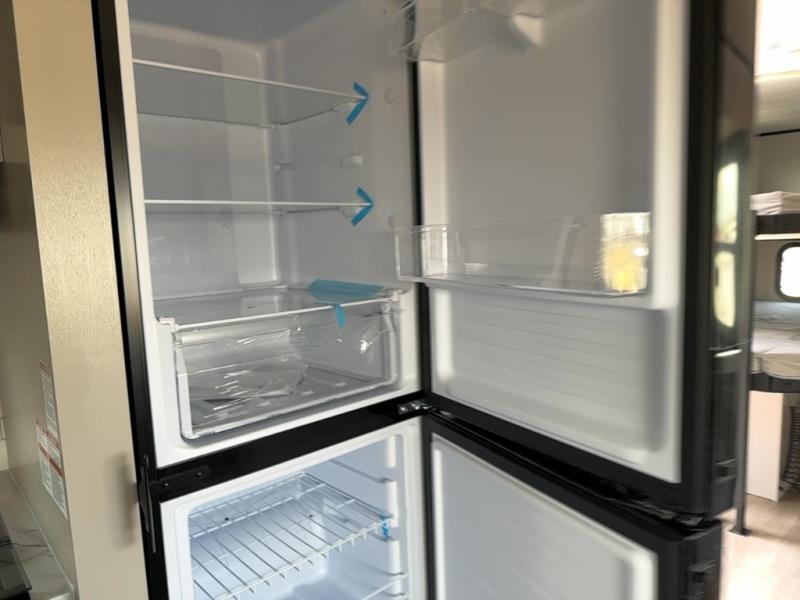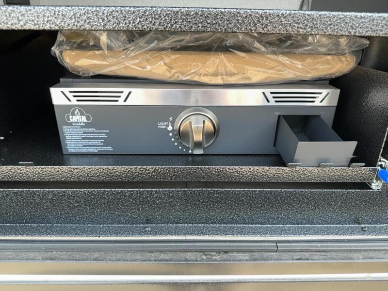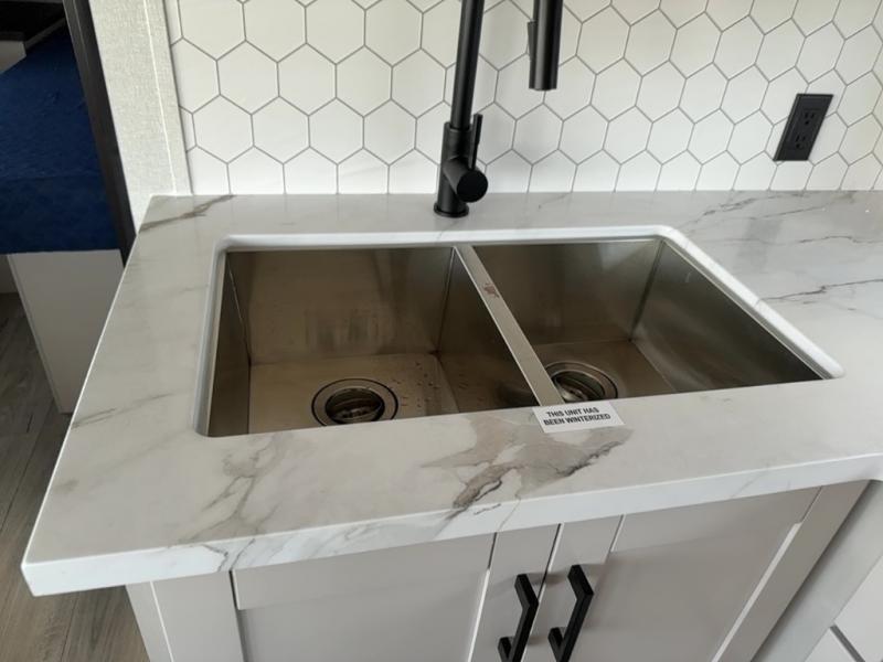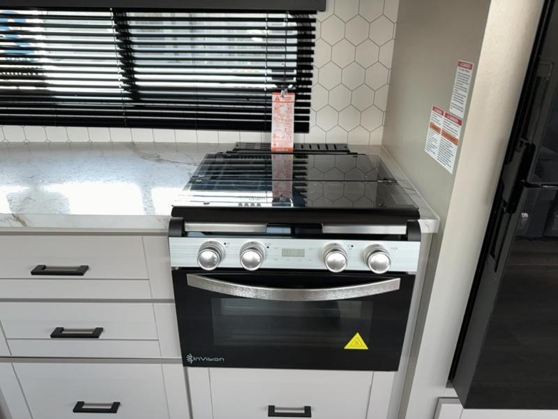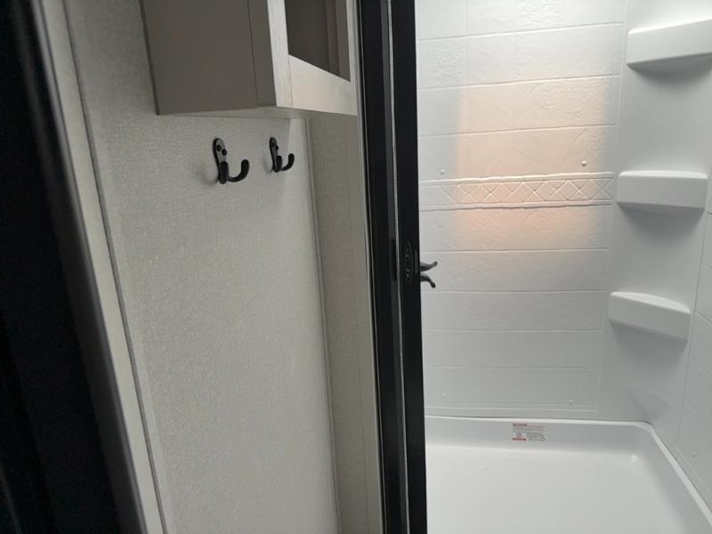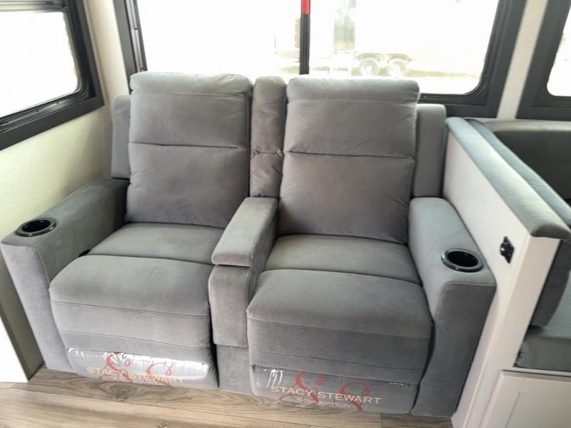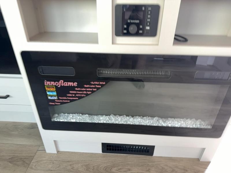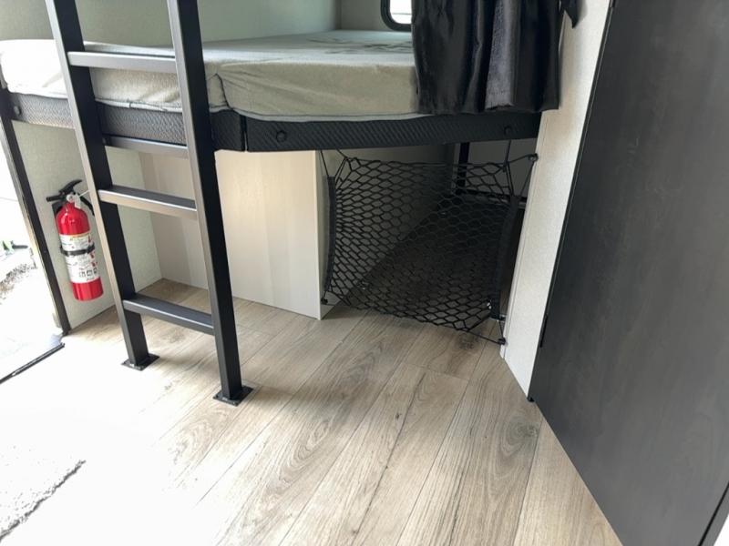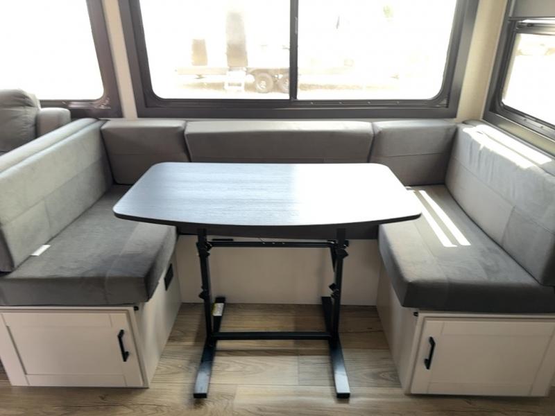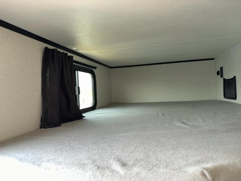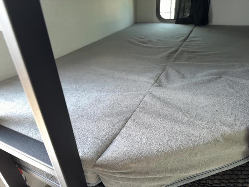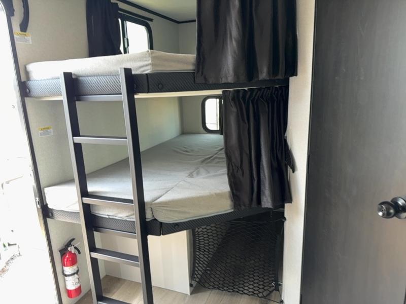 Get out and experience new campgrounds with this spacious trailer that offers a slide out tri-fold sofa and U-shaped dinette giving you dining, relaxing and sleeping space as well as more interior floor space to move from the front to the back. There is even an entertainment center here and an optional fireplace to make it more cozy. The cook will love the choice of making meals inside with full amenities or on the outside kitchen when relaxing under the 21' power awning with LED lights. You will appreciate your own space in the front private bedroom with a queen bed, dual wardrobes and nightstands, plus one of the dual entry doors. This model also includes double-size bunks with flip-up storage and a kayak door to easily pack in camp gear!