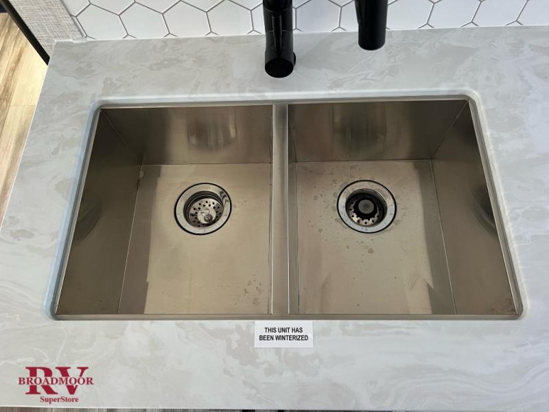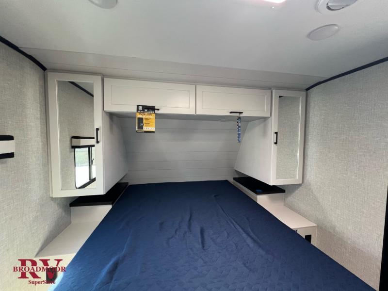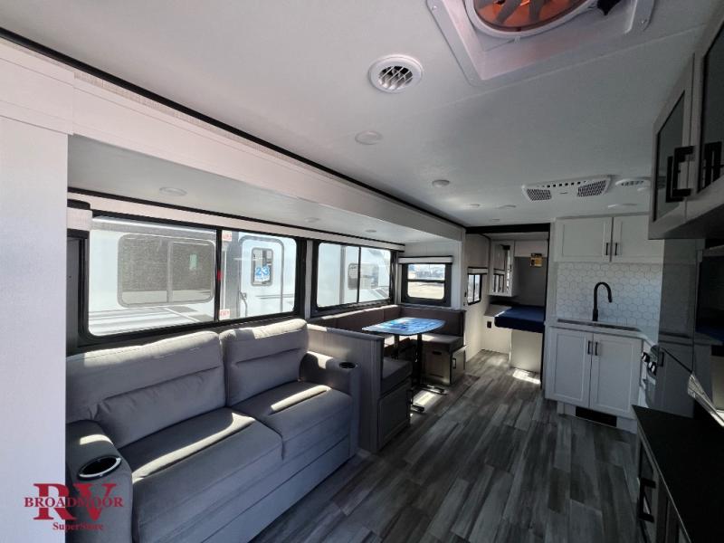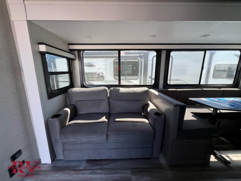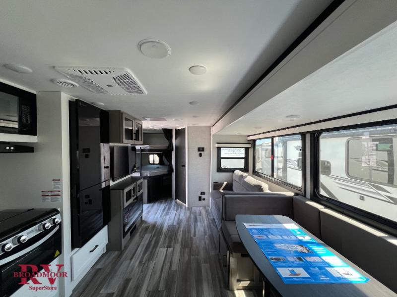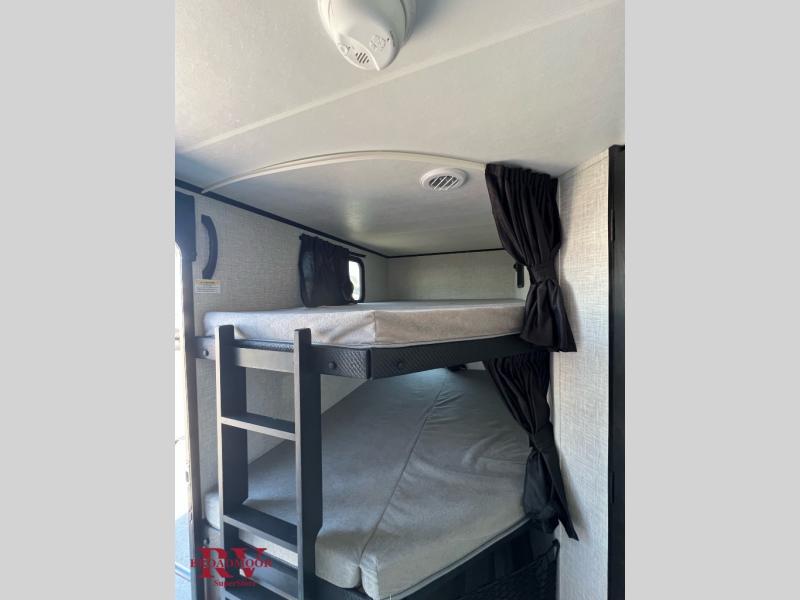 Get out and experience new campgrounds with this spacious trailer that offers a slide out tri-fold sofa and U-shaped dinette giving you dining, relaxing and sleeping space as well as more interior floor space to move from the front to the back. There is even an entertainment center here and an optional fireplace to make it more cozy. The cook will love the choice of making meals inside with full amenities or on the outside kitchen when relaxing under the 21' power awning with LED lights. You will appreciate your own space in the front private bedroom with a queen bed, dual wardrobes and nightstands, plus one of the dual entry doors. This model also includes double-size bunks with flip-up storage and a kayak door to easily pack in camp gear!