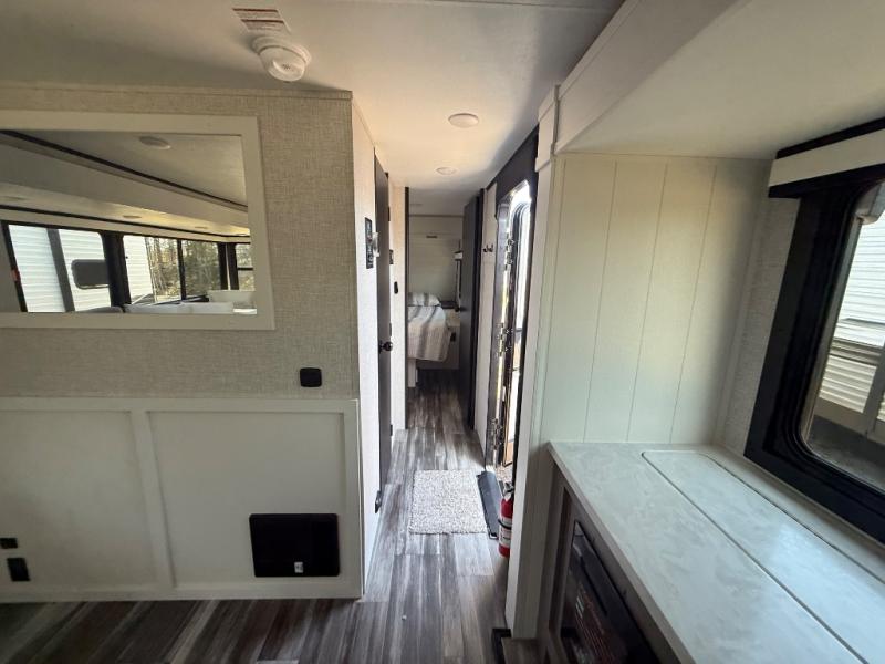 Perfect for weekend trips or extended stays, this travel trailer is the one! You will find a rear desk with an ottoman plus overhead storage if you plan to work while you're away from home. The dual opposing slides in the combined kitchen and living area will create an open floorplan, and the kitchen island will provide the chef of your group with more counter space. There is a tri-fold sofa and booth dinette that double as seating and sleeping space, and the full bath onboard will keep everyone clean. Don't overlook the front private bedroom with a queen bed and plenty of storage space for your belongings!